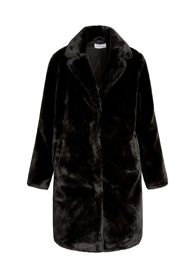 Be cozy, look cool. This classic long line jacket is made with the softest faux fur, button front closures and hand-accessible pockets to keep out the cold. 100% Polyester