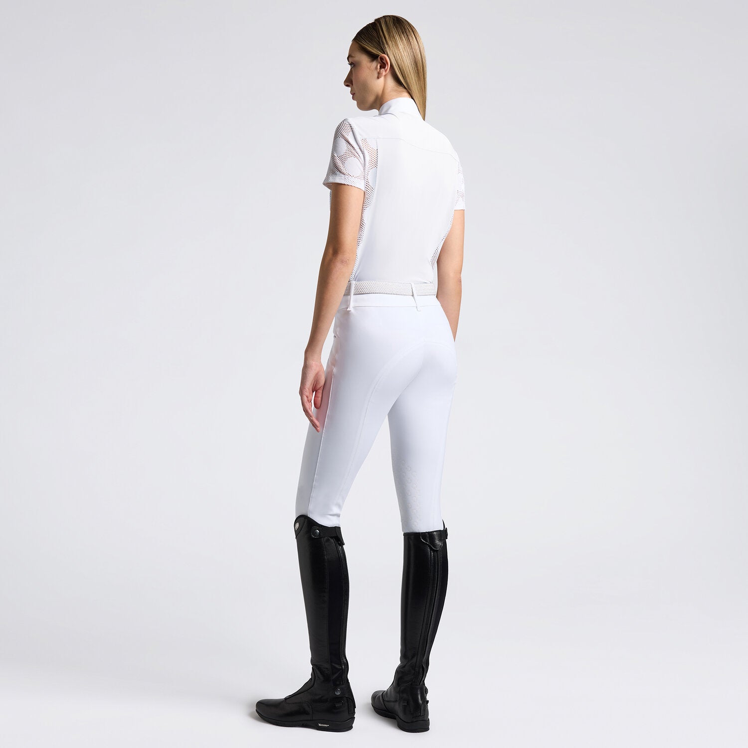The Cavalleria Toscana women's short-sleeved competition shirt combines technical fabrics and elegant details for a unique and high-performance garment. Made from a mix of perforated jacquard and jersey, it ensures lightness, breathability, and comfort during competitions. The refined design features a white poplin collar, hidden buttons, and sophisticated finishes, ideal for meeting the formal requirements of events. With an ergonomic cut that enhances the silhouette and high-quality materials, this shirt is perfect for riders who want to stand out with both style and functionality.