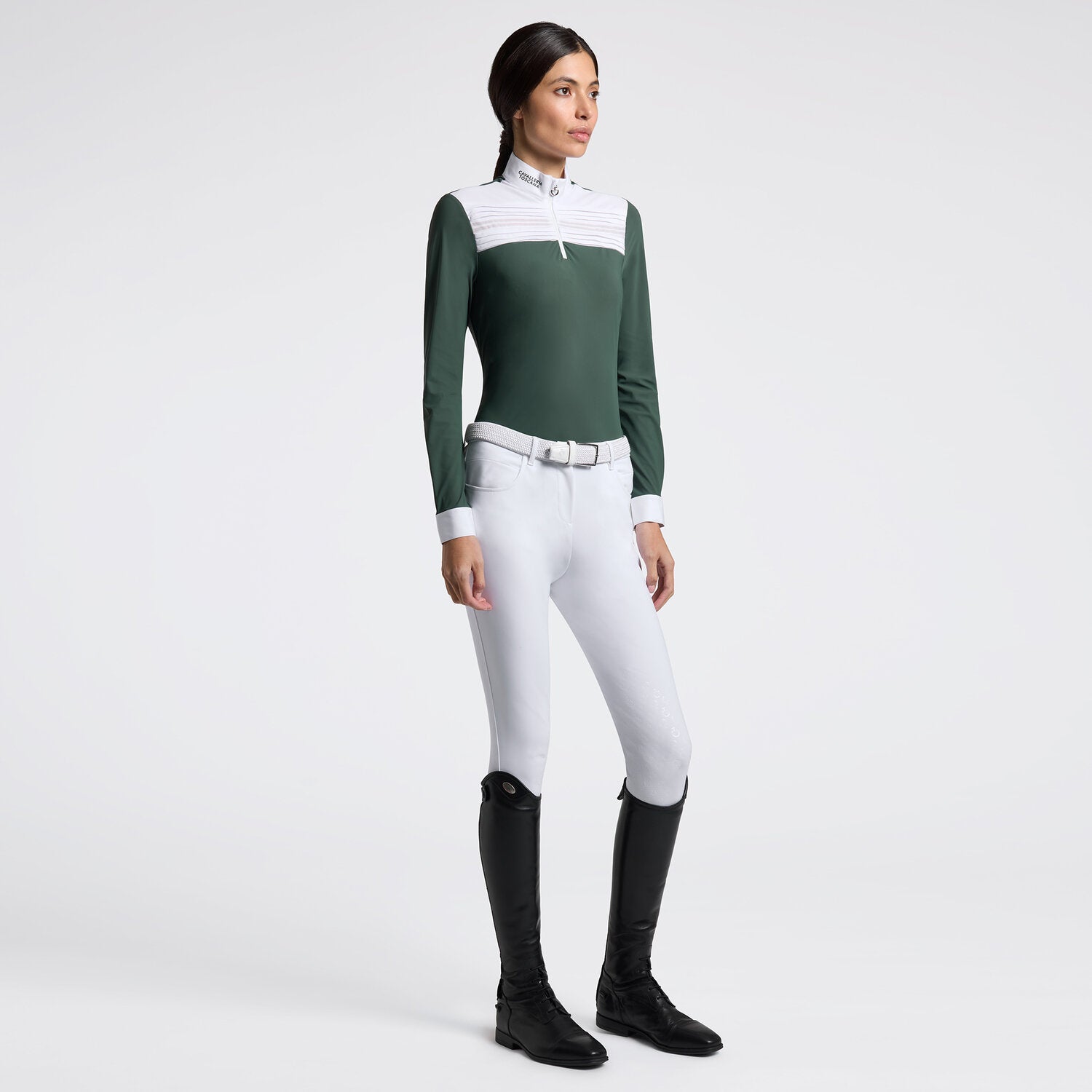 Cavalleria Toscana women’s long sleeve competition shirt in technical jersey with white poplin collar and cuffs, front pleated insert and exposed zip. Where elegance meets performance in the show ring.