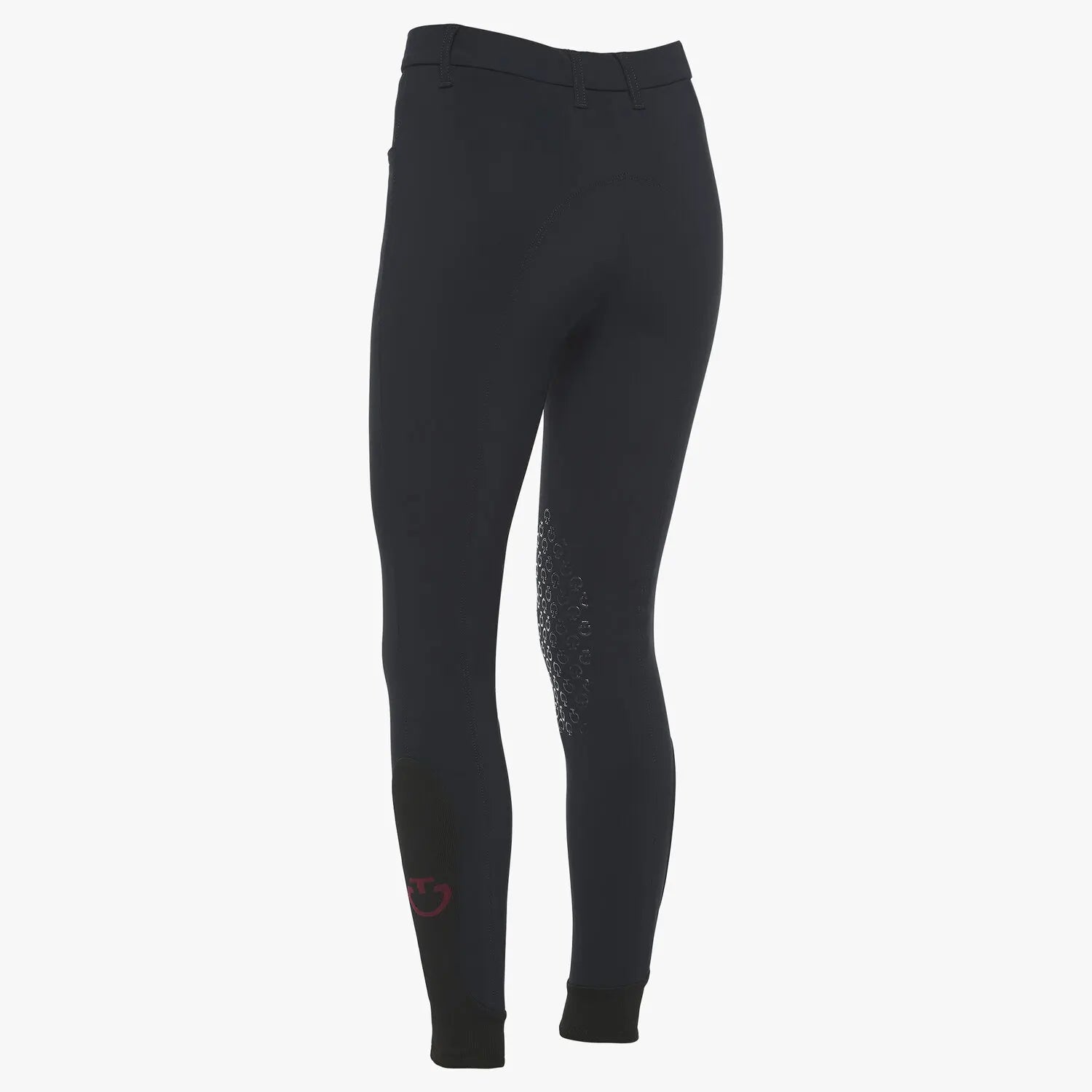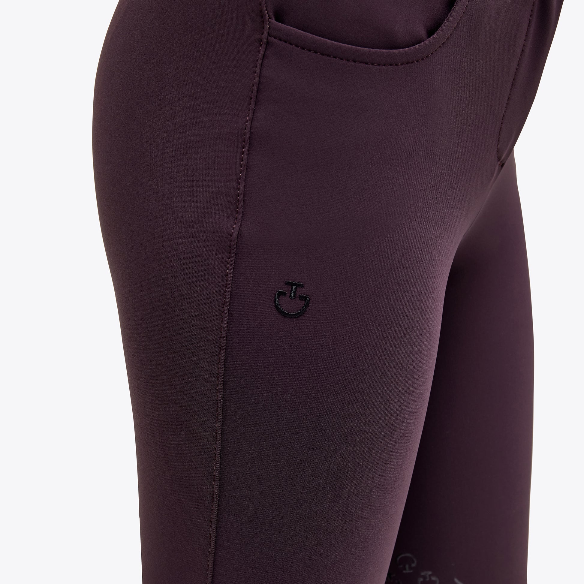 The technical 4-way stretch jersey used for this riding breeches provides maximum comfort and breathability while riding, moving easily with the body. The material has antibacterial properties, perfect for training. The transparent knee grip allows stability on the horse, while the stretch-knit socks fit easily beneath the boots. It features a contrasting embroidered logo on the outside of the sock and two front pockets. The practical fastening consists of a zip up front with button.