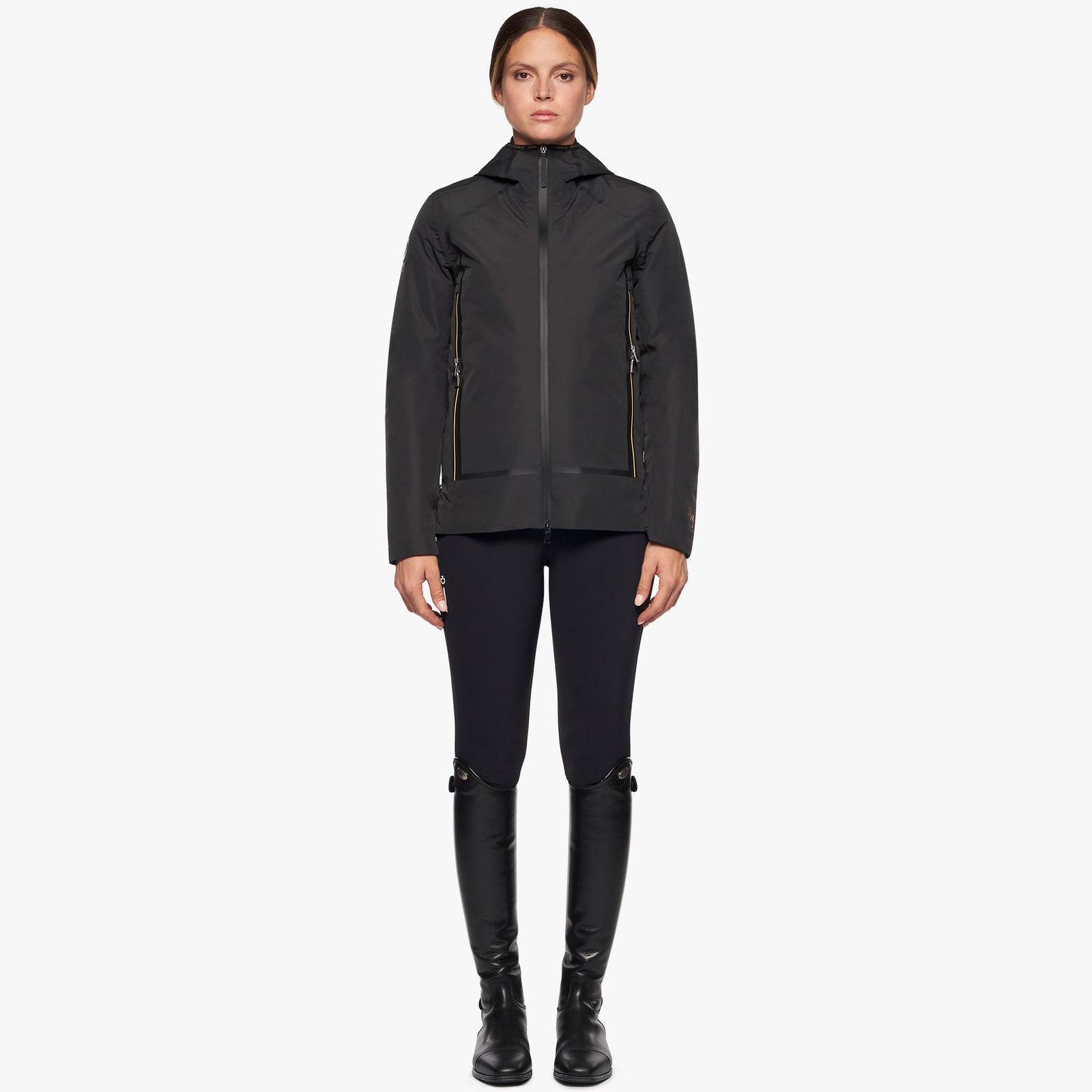 This waterproof and windproof women’s rain jacket features taped seams and a heat-sealed, two-way front zipper. The jacket’s high-tech shell utilizes a waterproof membrane to keep moisture out. Wear the outer shell alone for reliable protection from wind and rain or wear the jacket and liner together when the temperatures drop. Once indoors, remove the outer shell and wear the quilted liner on its own for a sleek and stylish look. The outer shell’s two large zippered pockets are perfect for storing treats and essentials and are easily accessed while riding.