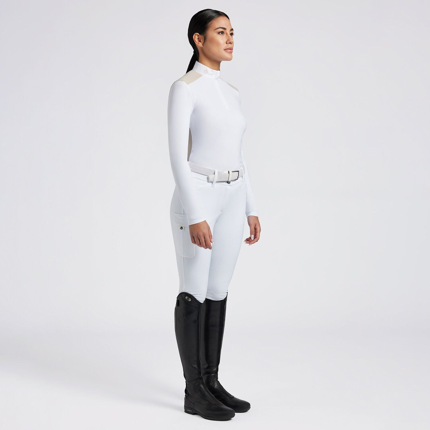 The Cavalleria Toscana women's competition shirt embodies elegance and technical performance, designed for discerning equestrians who demand high-quality apparel. Made from premium technical jersey, this shirt is known for its durability and breathability, ensuring excellent comfort even during the most intense competitions. The sophisticated design features contrasting front and back inserts, adding a touch of refinement and exclusive style. The white collar and central coated zip are distinctive details that enhance the look of the garment, while the embroidered CT logo on the collar underscores Cavalleria Toscana's commitment to excellence. Perfect for competitions, this technical shirt also provides a sophisticated and sporty look for leisure time. It combines functionality and style, reflecting the passion and innovation that define Cavalleria Toscana. This shirt is the perfect choice for women who ride with enthusiasm and want to showcase their potential and leadership. Cavalleria Toscana's ongoing research and dedication to quality make this shirt an essential piece for any equestrian wardrobe.