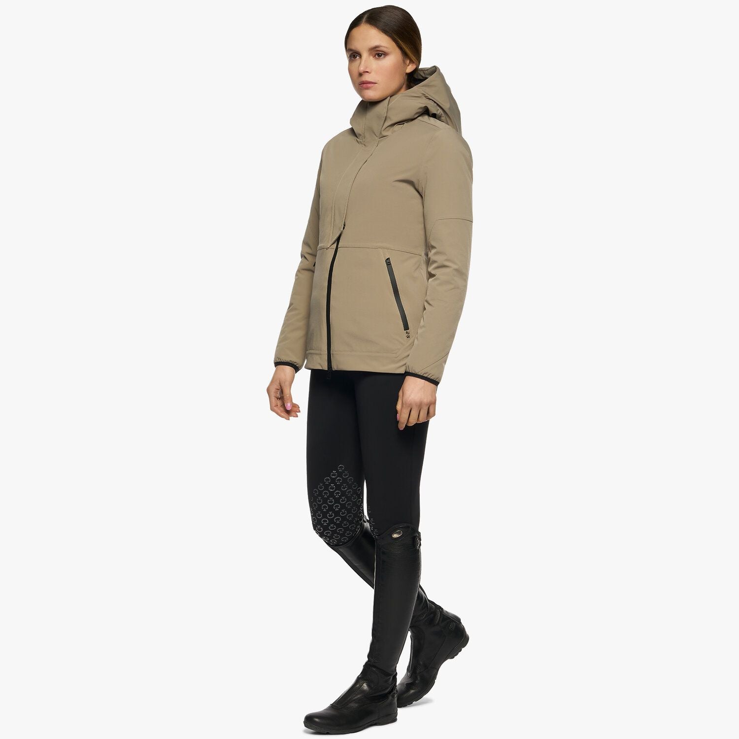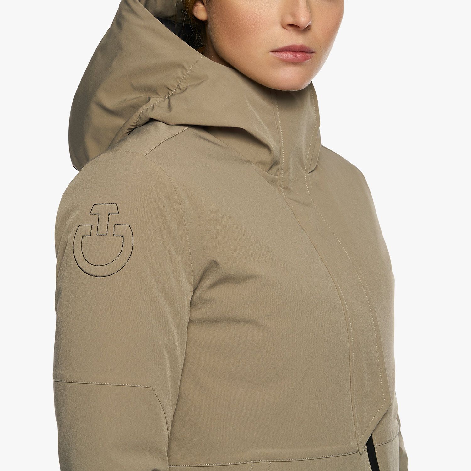 Designed for outdoor riding and errands about the stables, this understated performance padded jacket is defined by logo details and fine Cavalleria Toscana materials. It features an inner layer that blocks gusts of wind, a warm padded hood, and pockets sealed by zips set in heat-activated seam tape for additional protection from the elements. The elastic borders are decorated by Cavalleria Toscana lettering, while the half-placket over the fastening adds a modern, distinguished graphic touch.