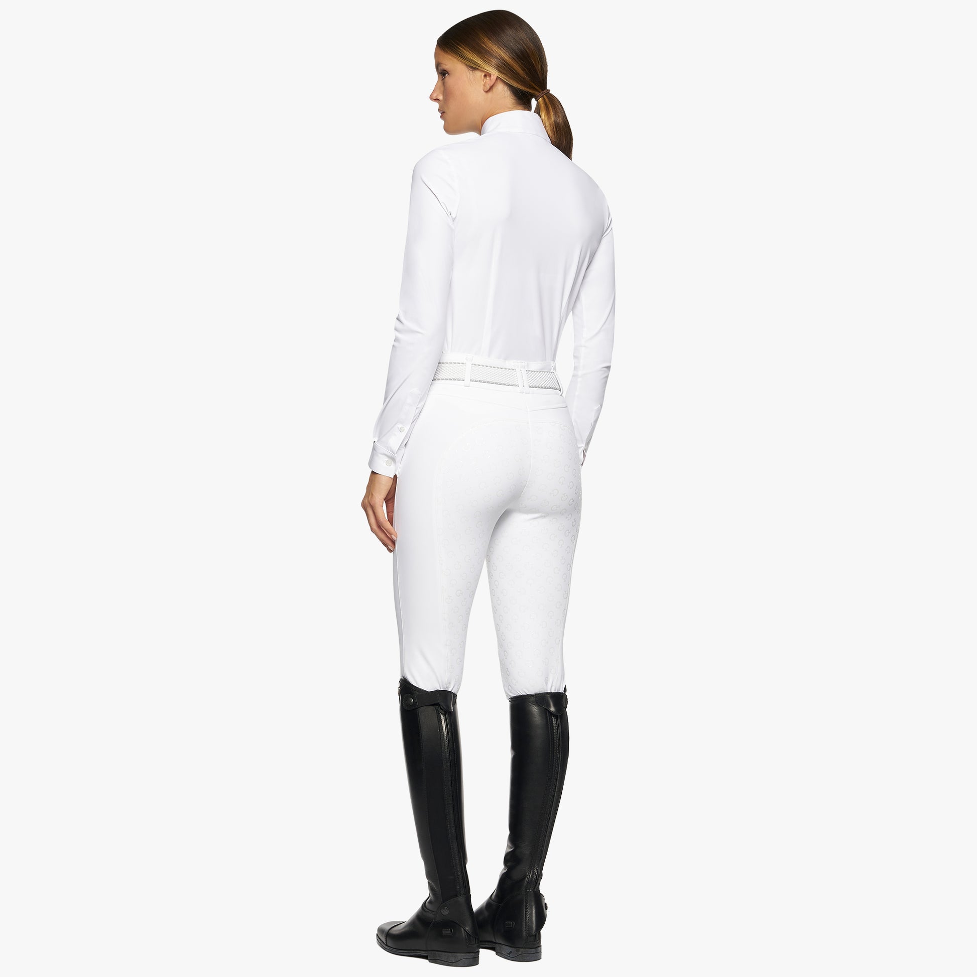 This special garment is dedicated to horsewomen who want to express their femininity even while competing. The long sleeves and slim fit combine to elongate the figure and accent the waistline. In supple, breathable elasticated jersey, it stretches in all four directions and is also crease-resistant. Easy to style with the breeches and accessories of the new collection, this shirt is distinguished by a high neck with an embroidered CT logo, and perforated fabric inserts along the armholes. The covered half placket echoes the clean lines of the garment.