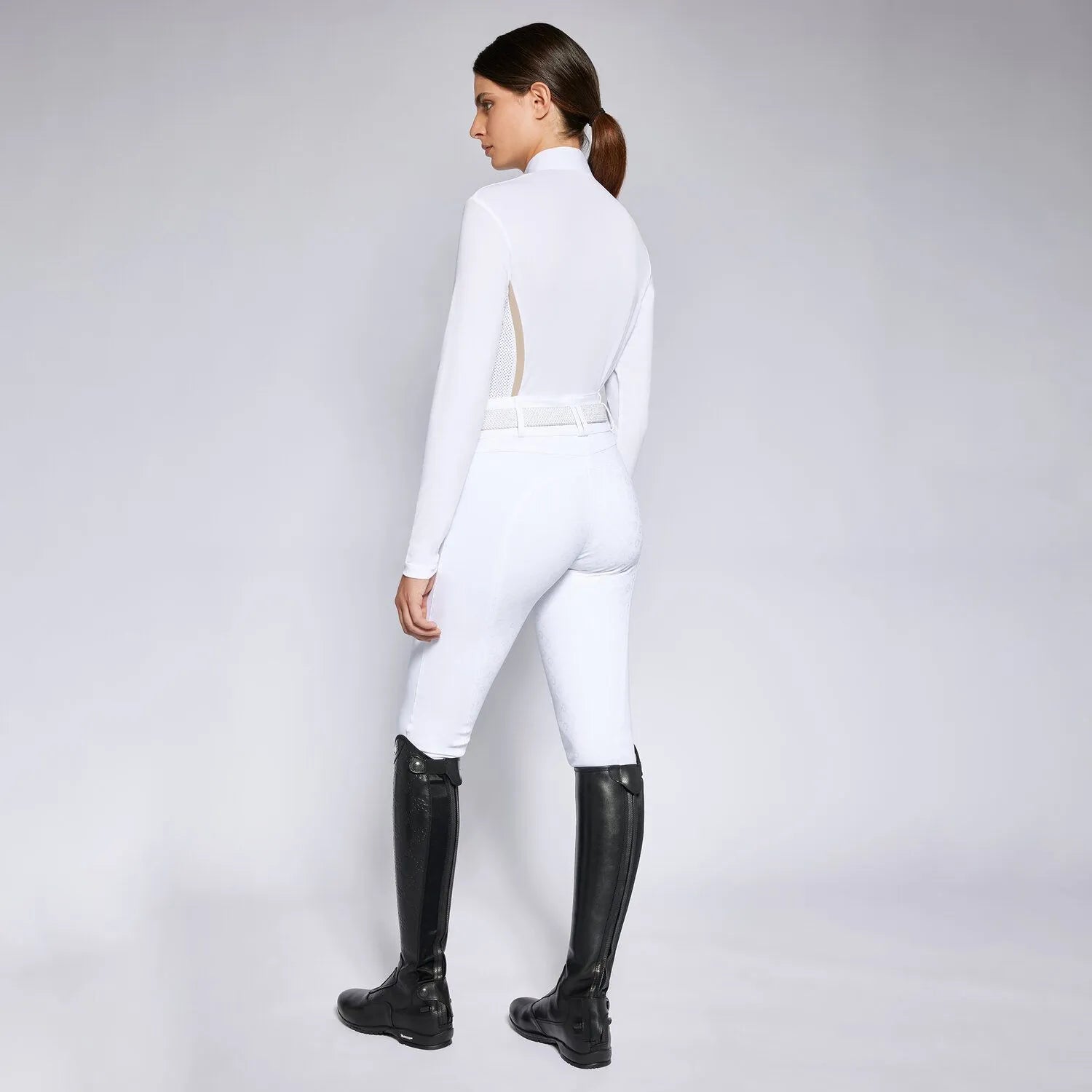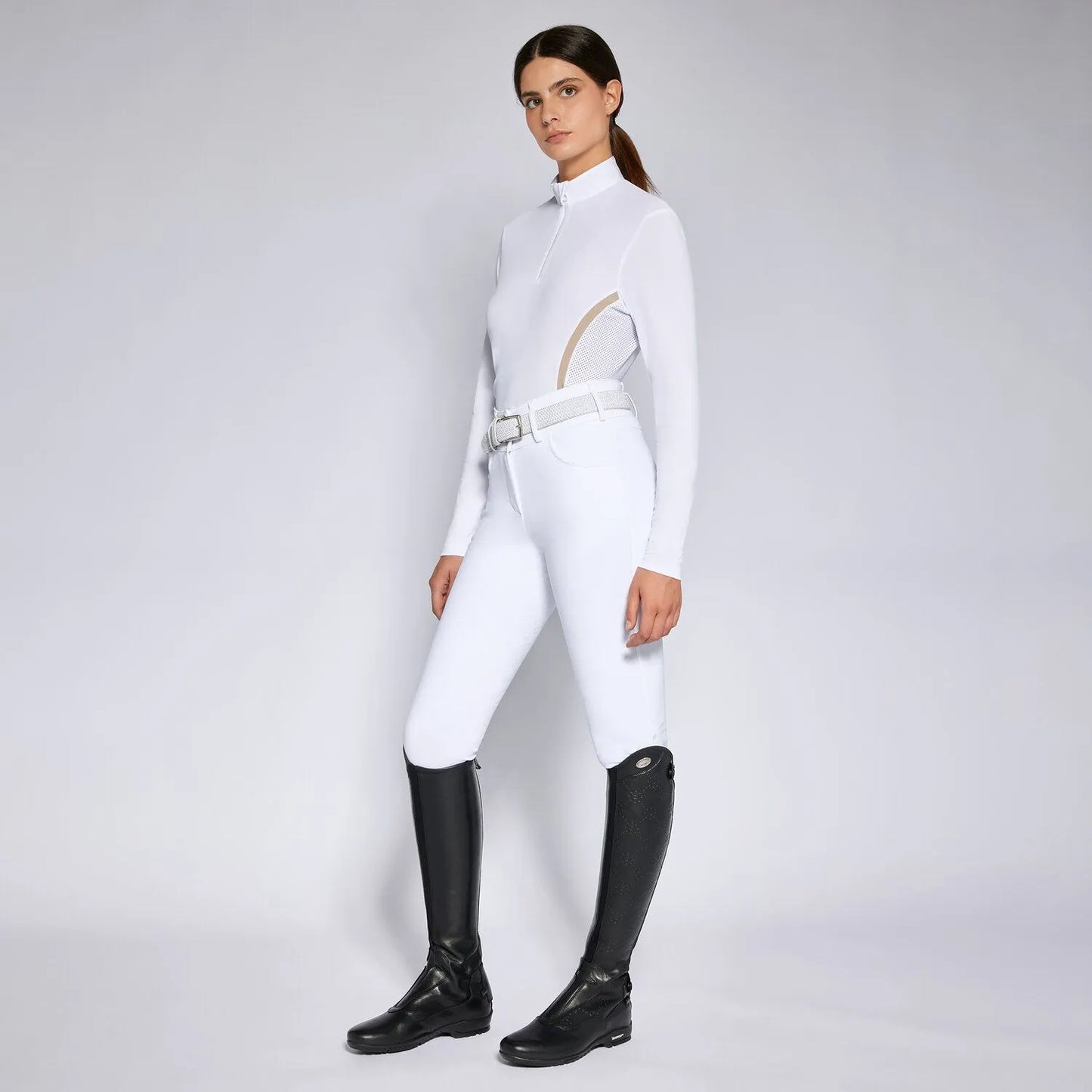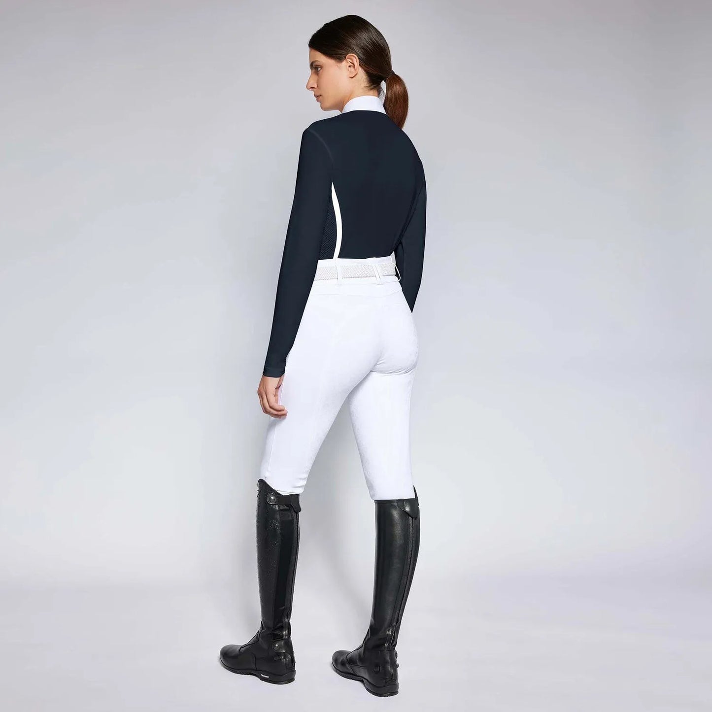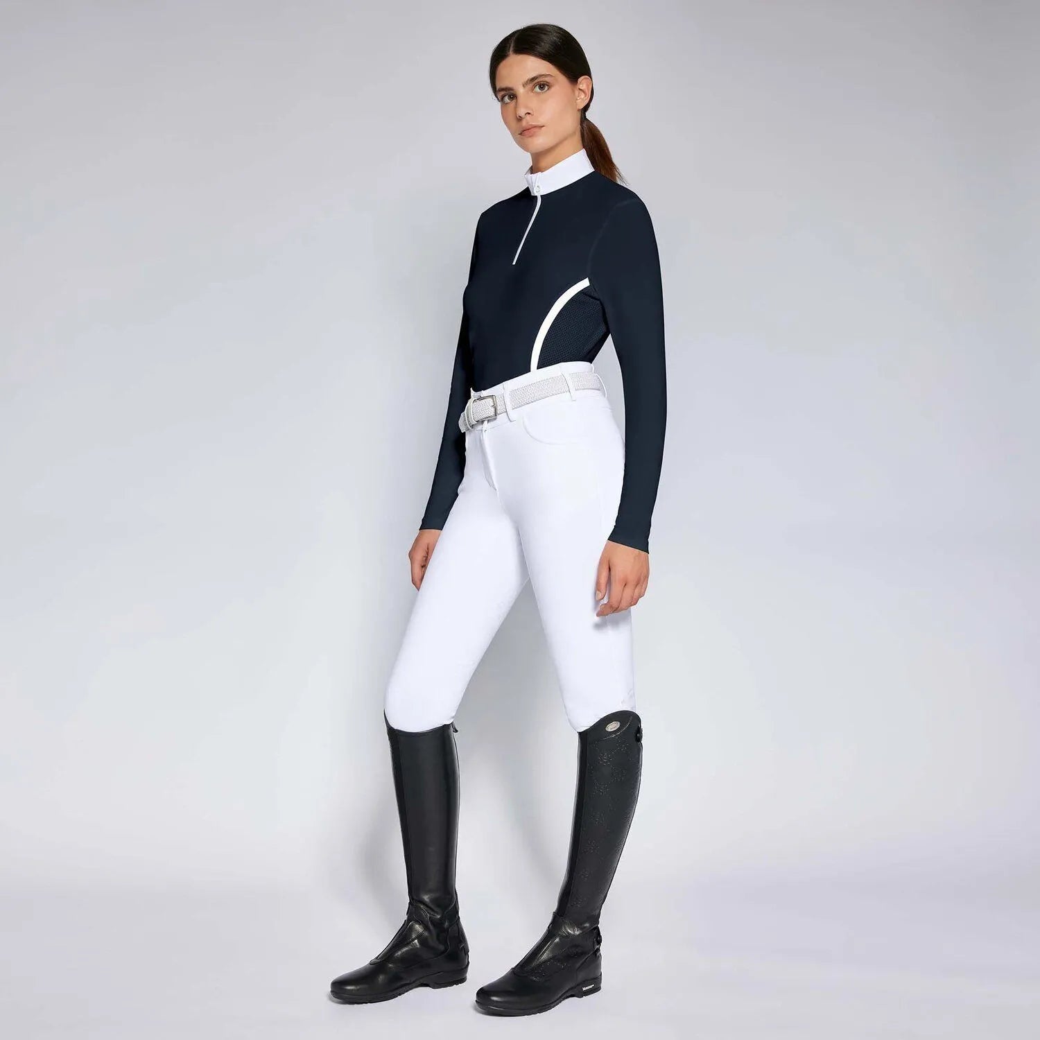 Introducing our Competition Polo, meticulously crafted for female riders seeking the perfect blend of elegance and technical prowess. The advanced technical piqué material ensures a comfortable fit and optimum breathability, addressing the crucial needs of competitive riding. Elevate your performance with a front zip that not only streamlines the fitting process but also introduces a modern touch of style. Experience the epitome of grace and functionality with our thoughtfully designed competition polo.