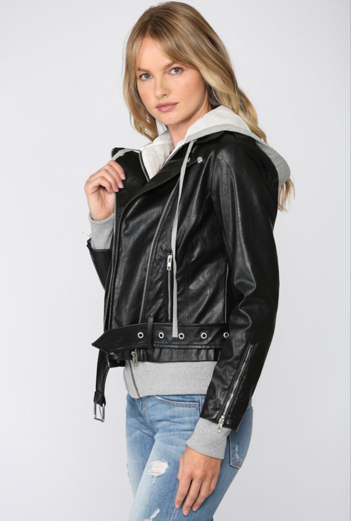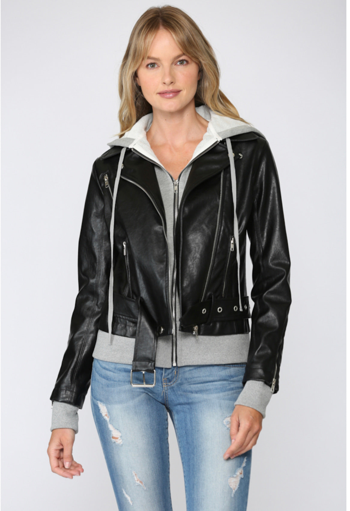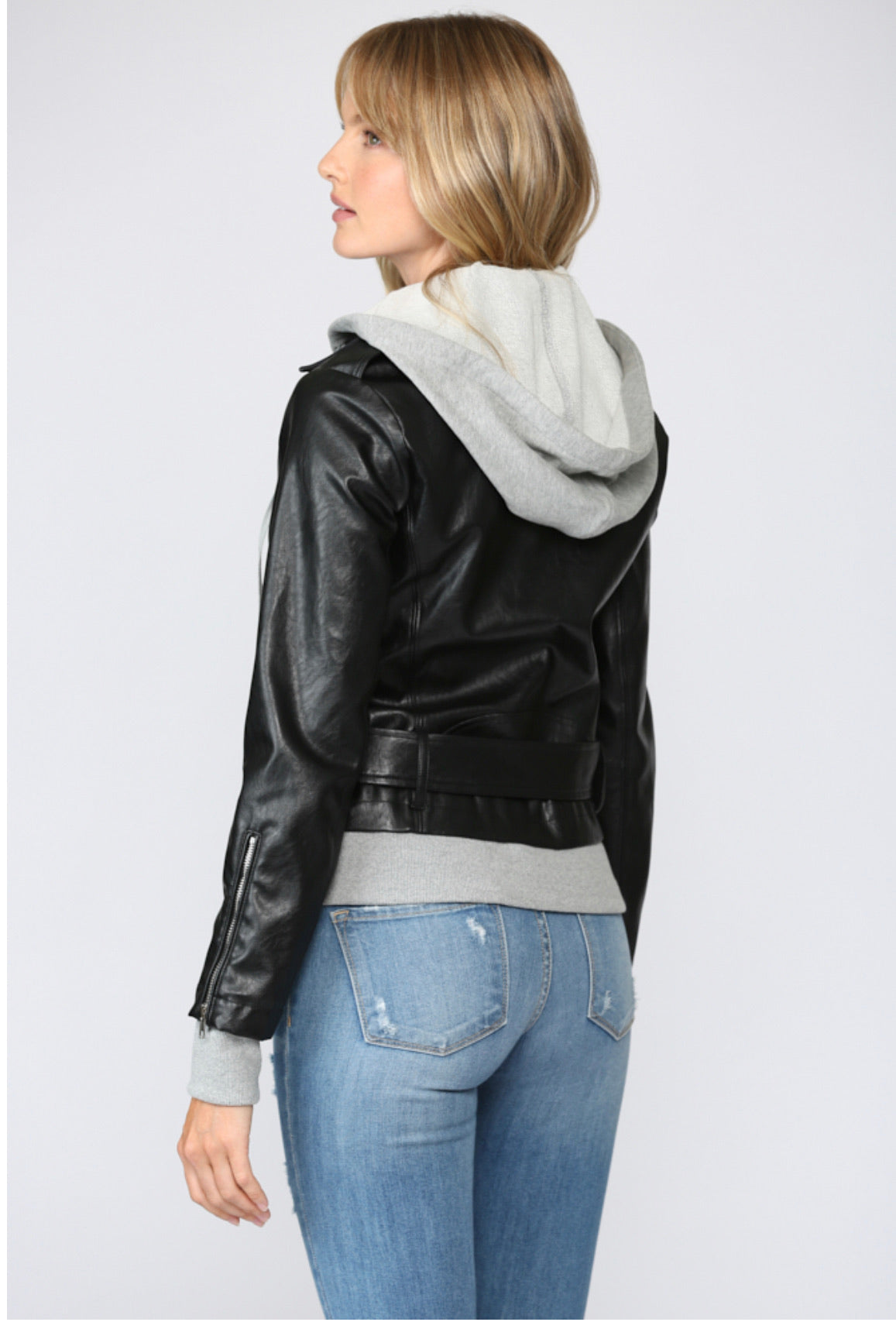 FAUX LEATHER JACKET WITH KNIT HOODIE CONTRAST
