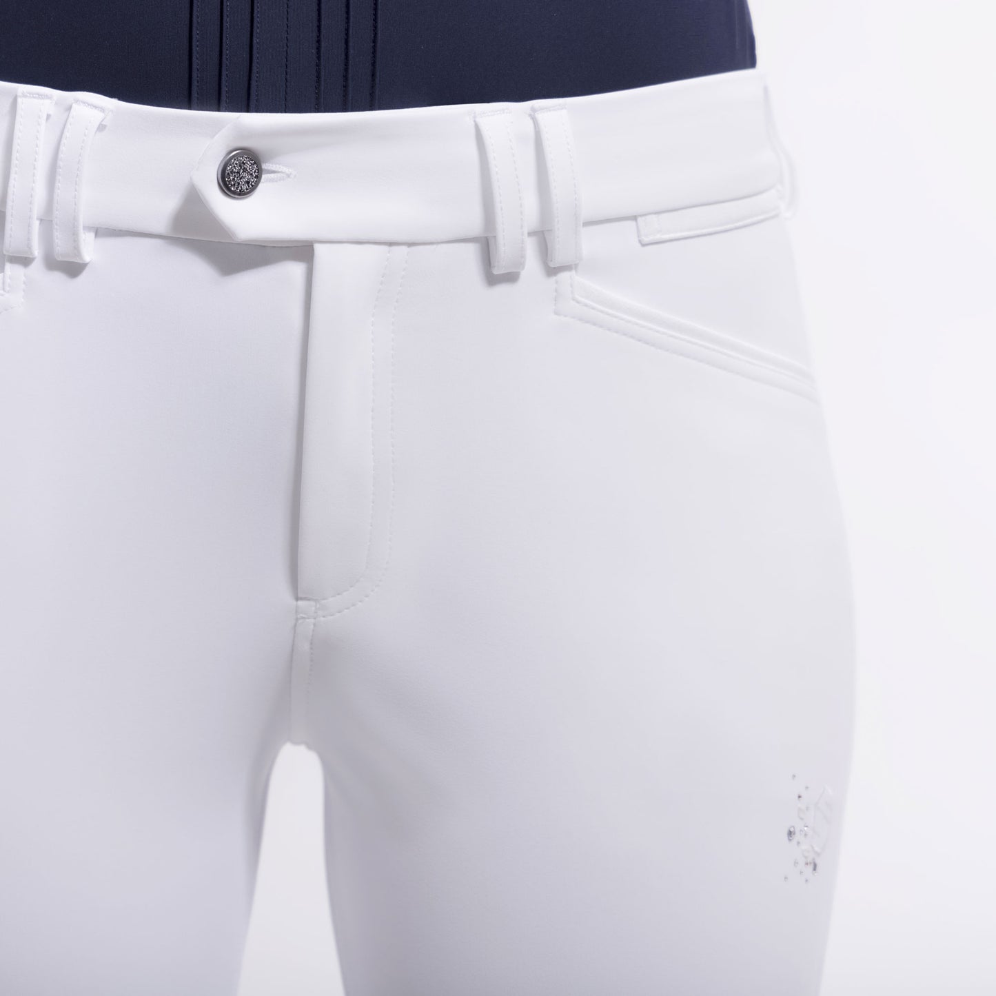 The details of the pockets and loops of the Mathilde are in satin. This model has only one front button. The seat is fully sewn. A large pocket for smartphone is present on the right side. This pant is unique thanks to its embroidered coat of arms illuminated with Swarovski® crystals on the thigh. This model is the perfect match between simplicity and refinement.
