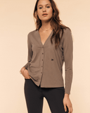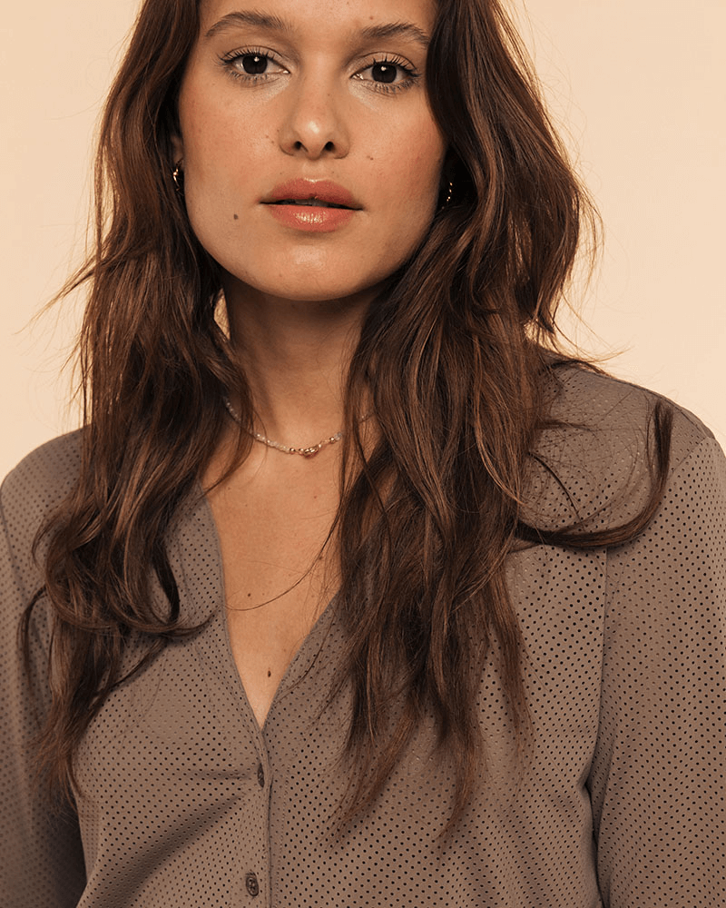 Its V-neck, its 5 small tone-on-tone buttons in vegetable ivory and its pleat in the back give it a unique and versatile style.