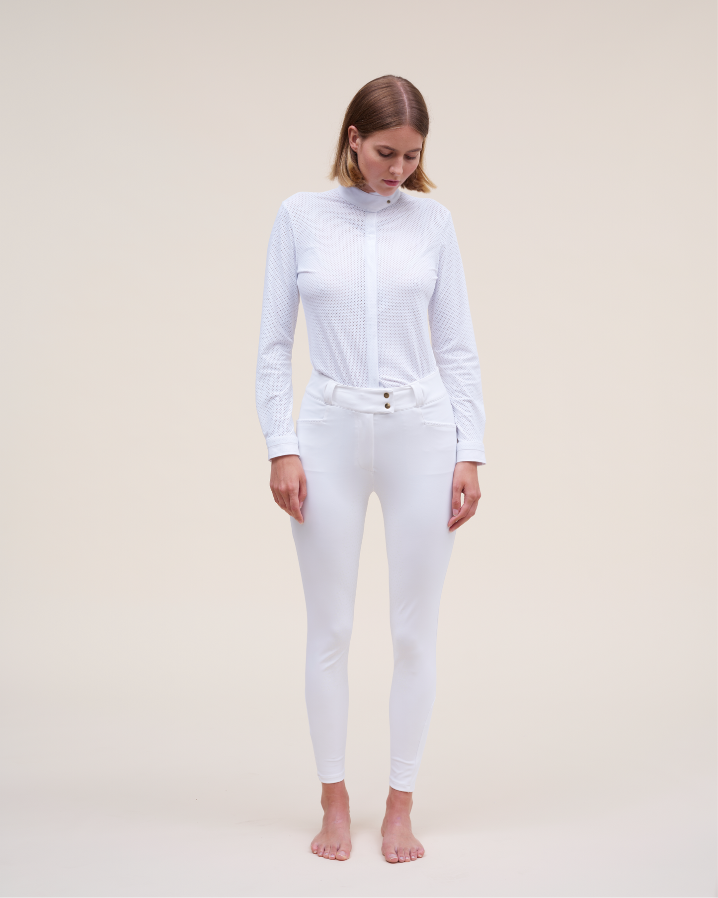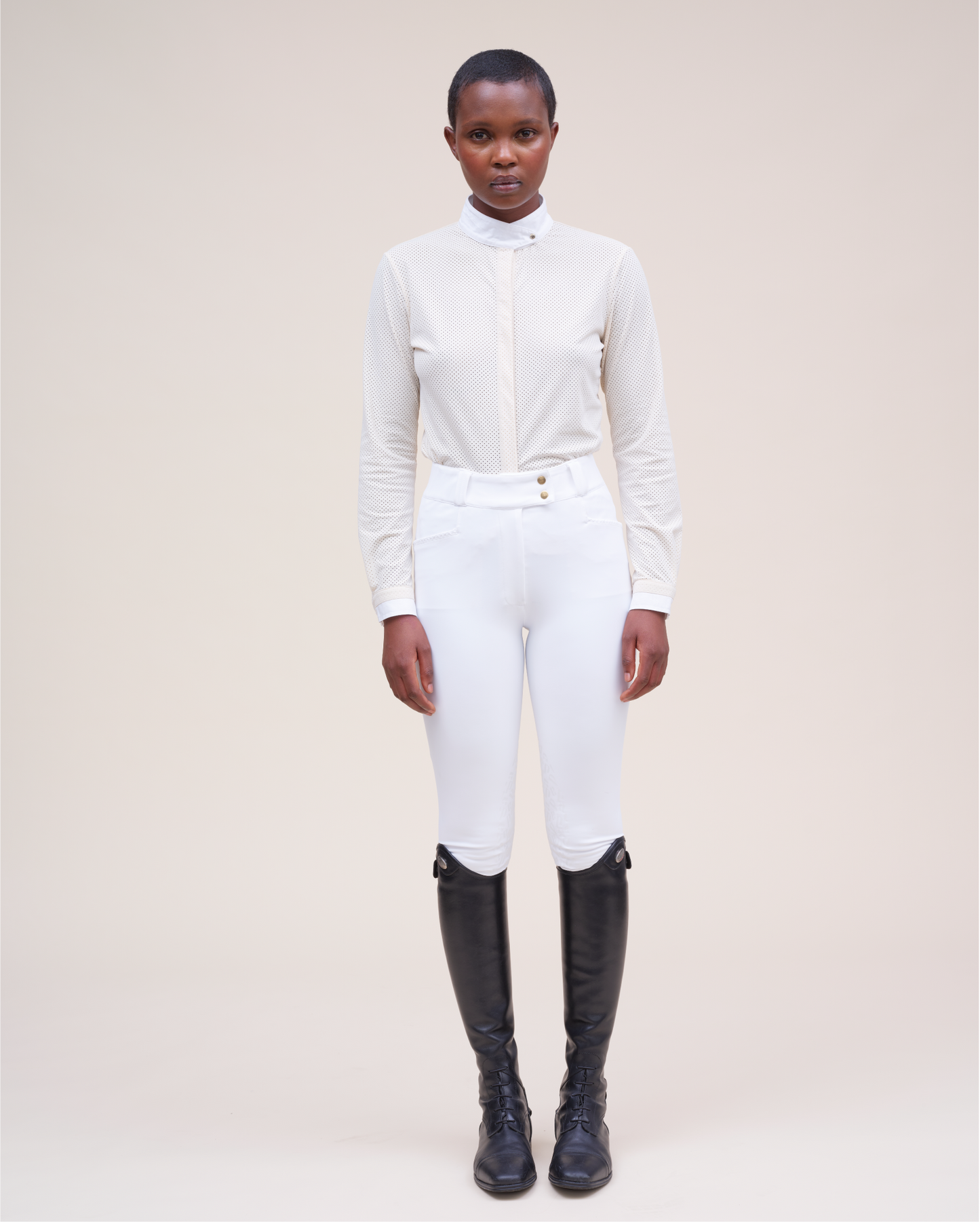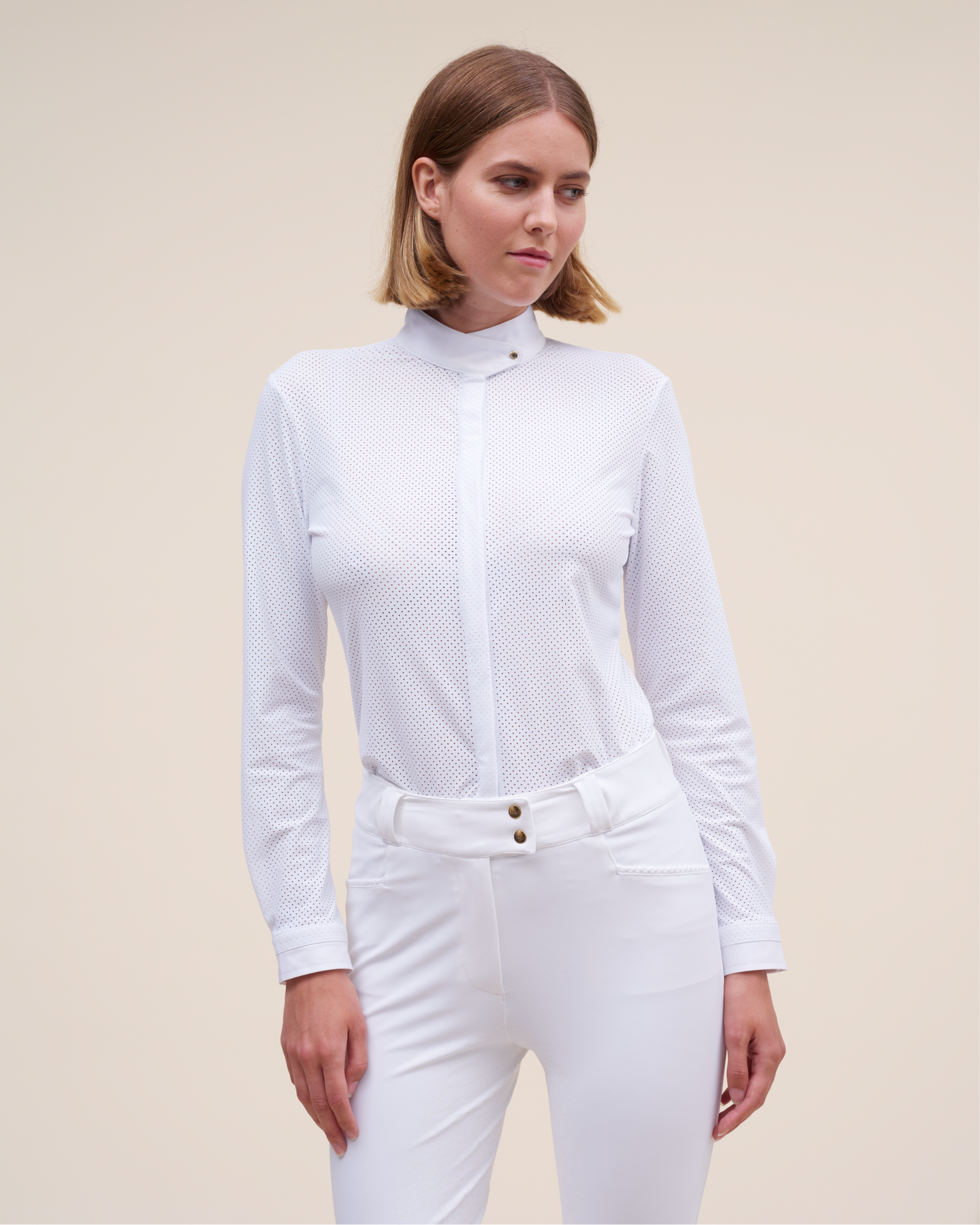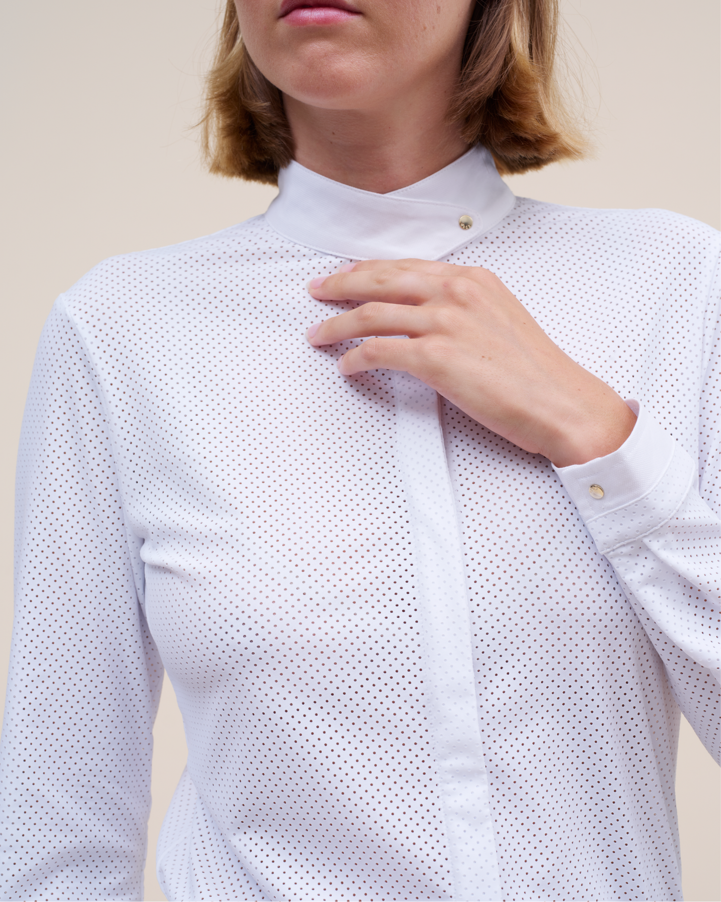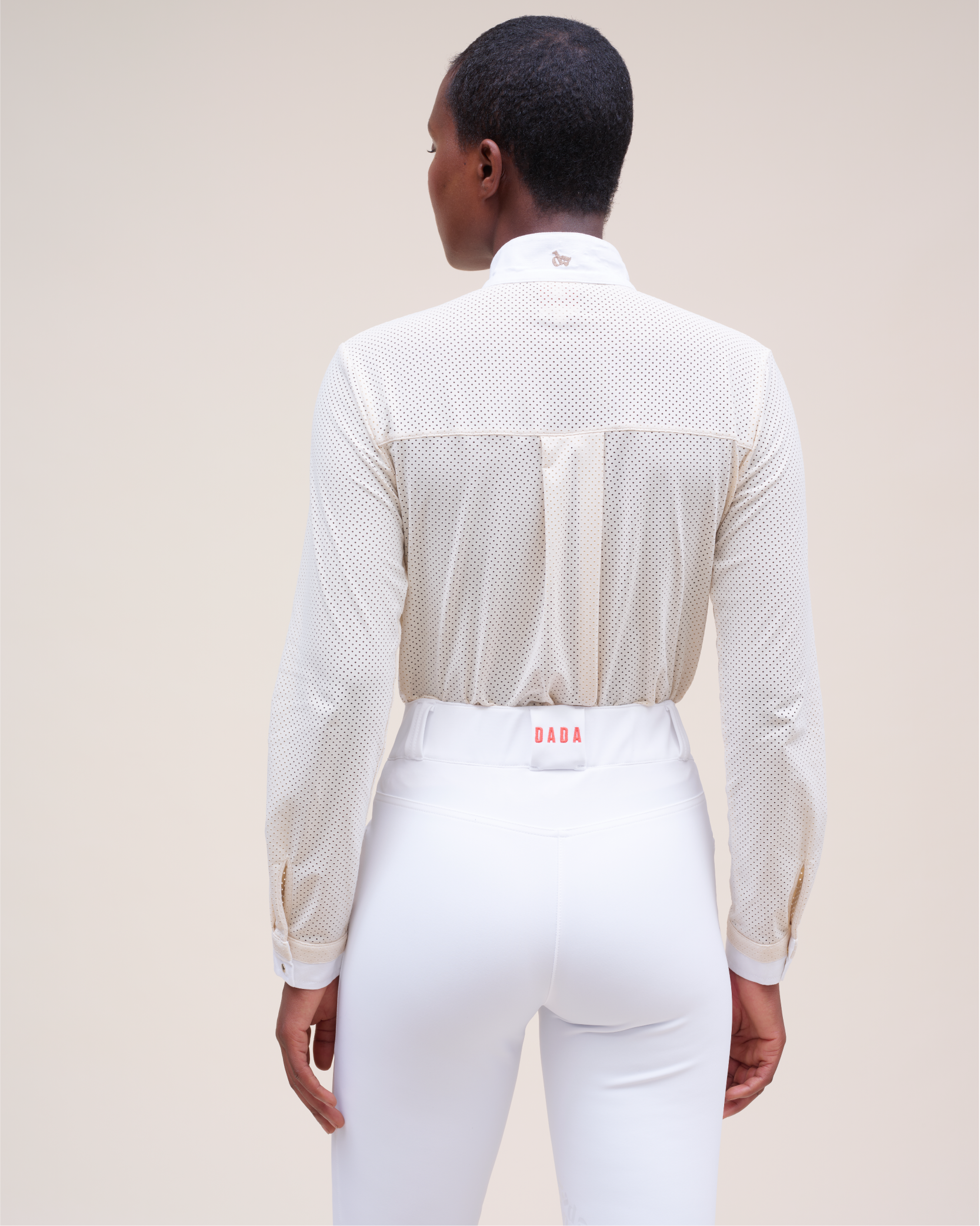 This long-sleeved shirt completes our range of competition shirts, offering a contemporary and elegant look for your competitions. Made from a micro-perforated fabric, it combines a modern riding style with optimal breathability. The dense fabric prevents any transparency, guaranteeing comfort and discretion. The fitted cut of this shirt is designed to perfectly fit the silhouette while offering great freedom of movement, thanks to the pleat in the back. The cuffs close with two snaps: a Dada logo snap, placed on the same cotton fabric as the collar and an invisible snap on the main fabric, for a discreet finish.