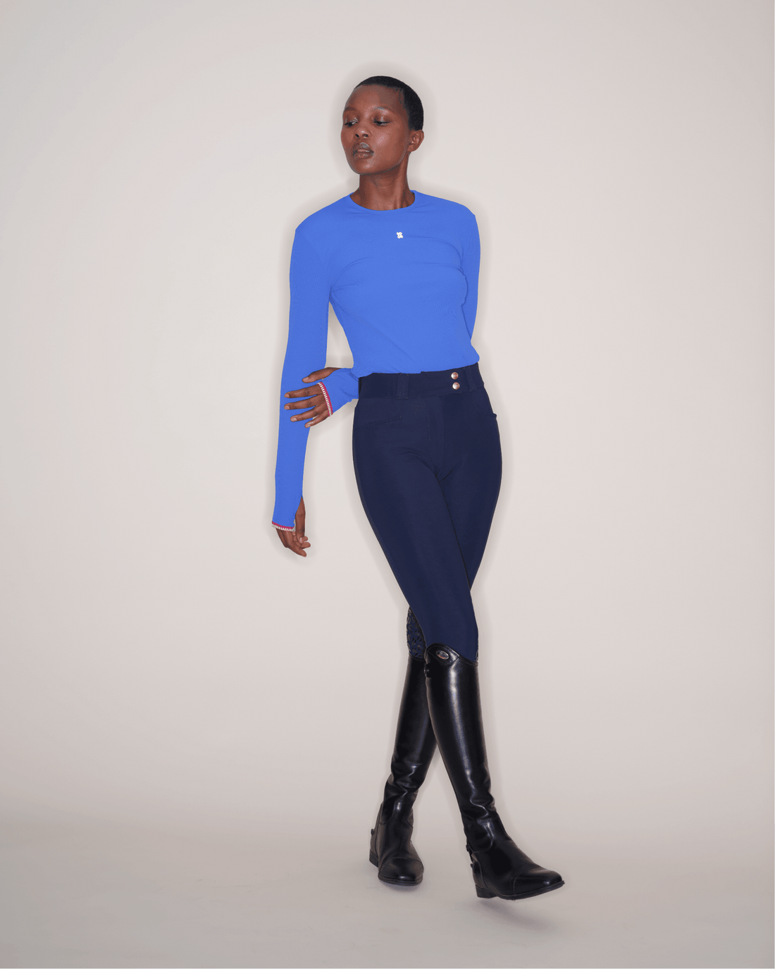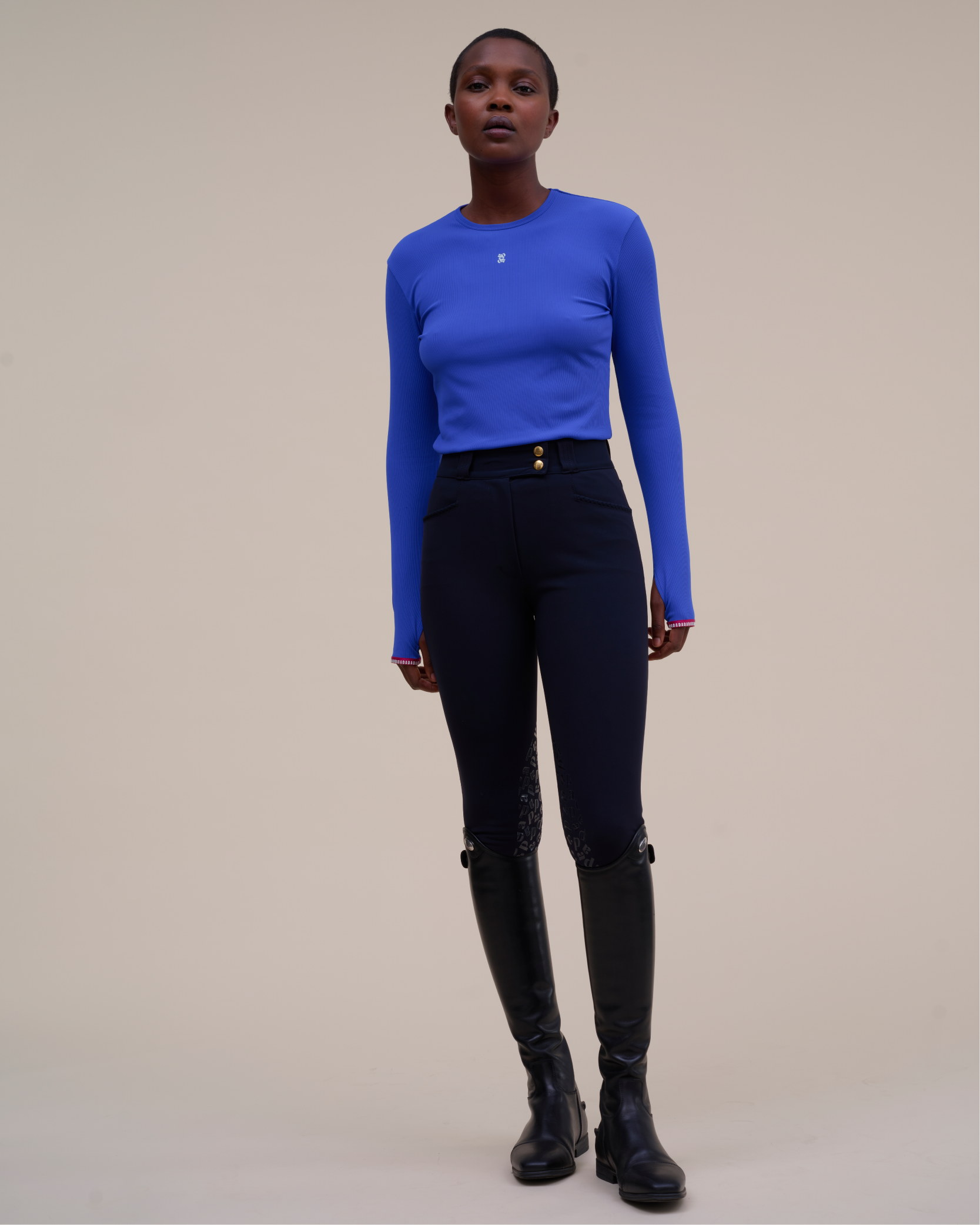 Long-sleeved technical riding t-shirt – Breathable, ribbed and ultra-comfortable thanks to its fitted cut and practical thumb loops. Perfect for riders looking for performance and elegance. Available in Majorelle, Black, Green Bronze, Dark Baltic.