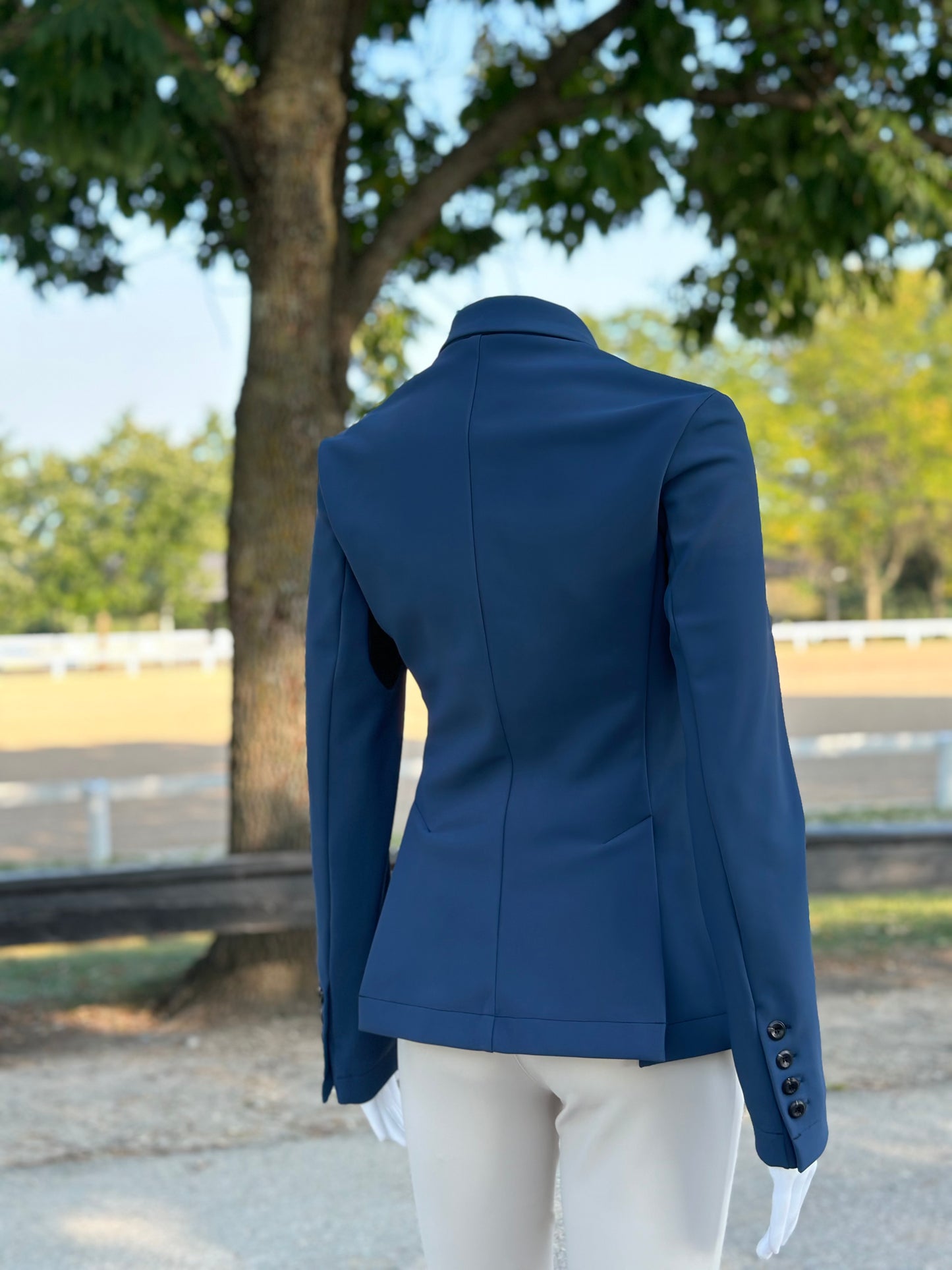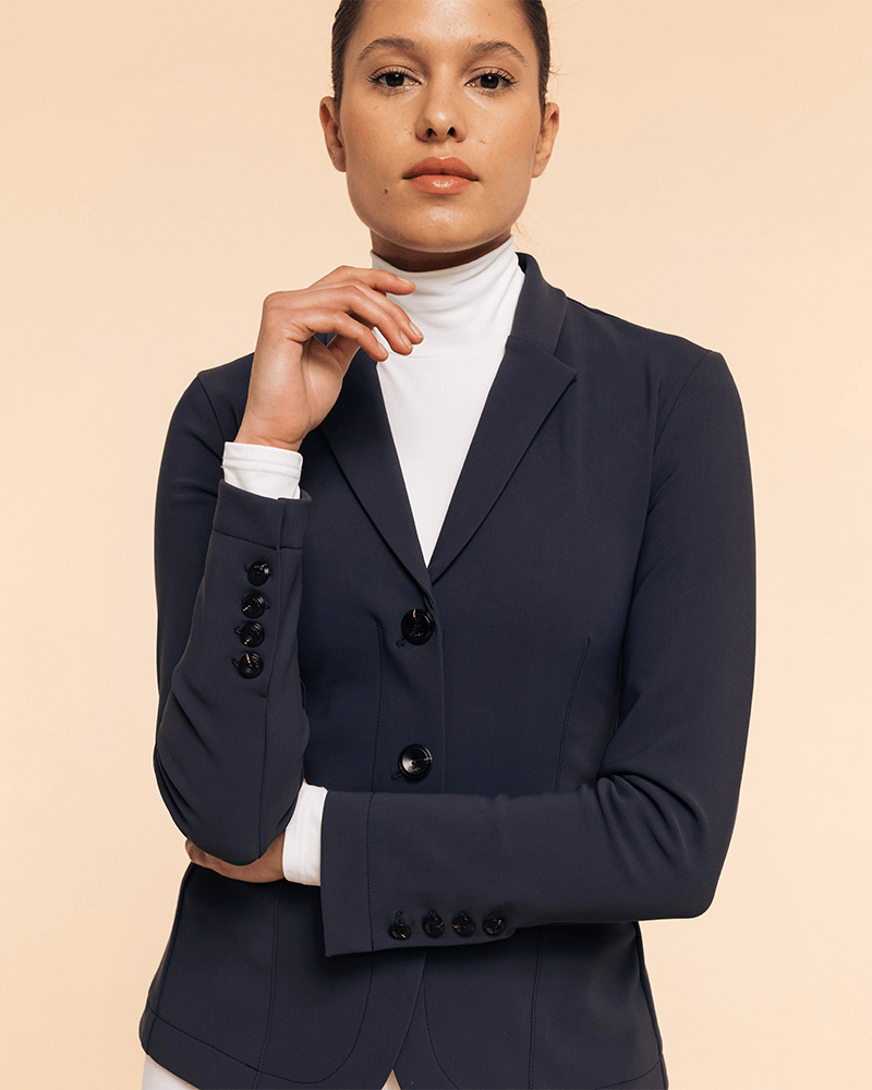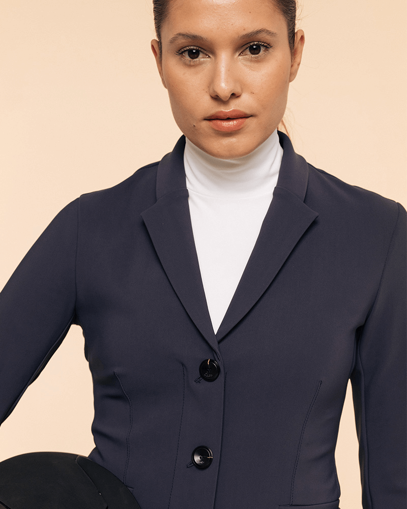 The Tzara competition jacket was developed as a tailor-made piece. It is identified by its blazer collar, its princess cut-outs on the front and back, 2 false pockets with simple piping, its 3 logo buttons on the front and its 4 buttons on each wrist. Tzara is also very breathable thanks to its mesh inserts under the arms.