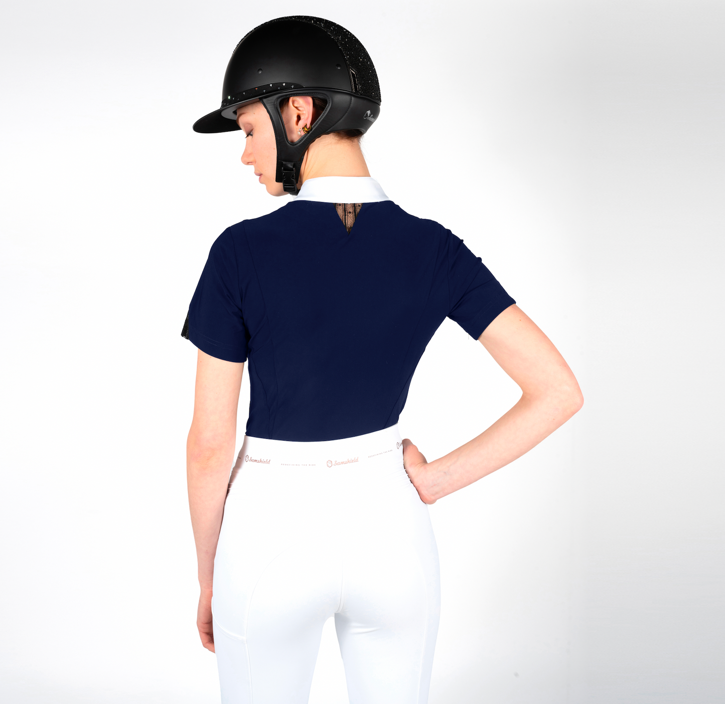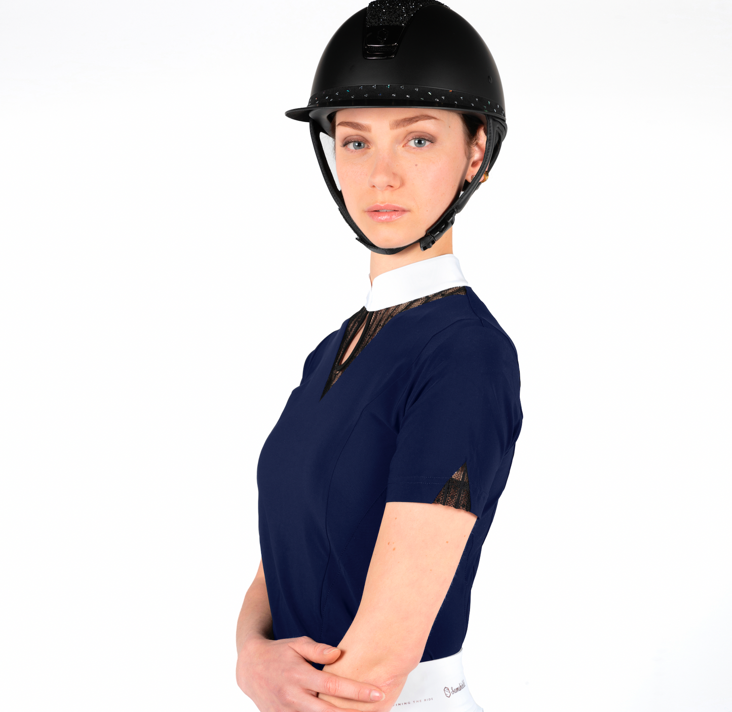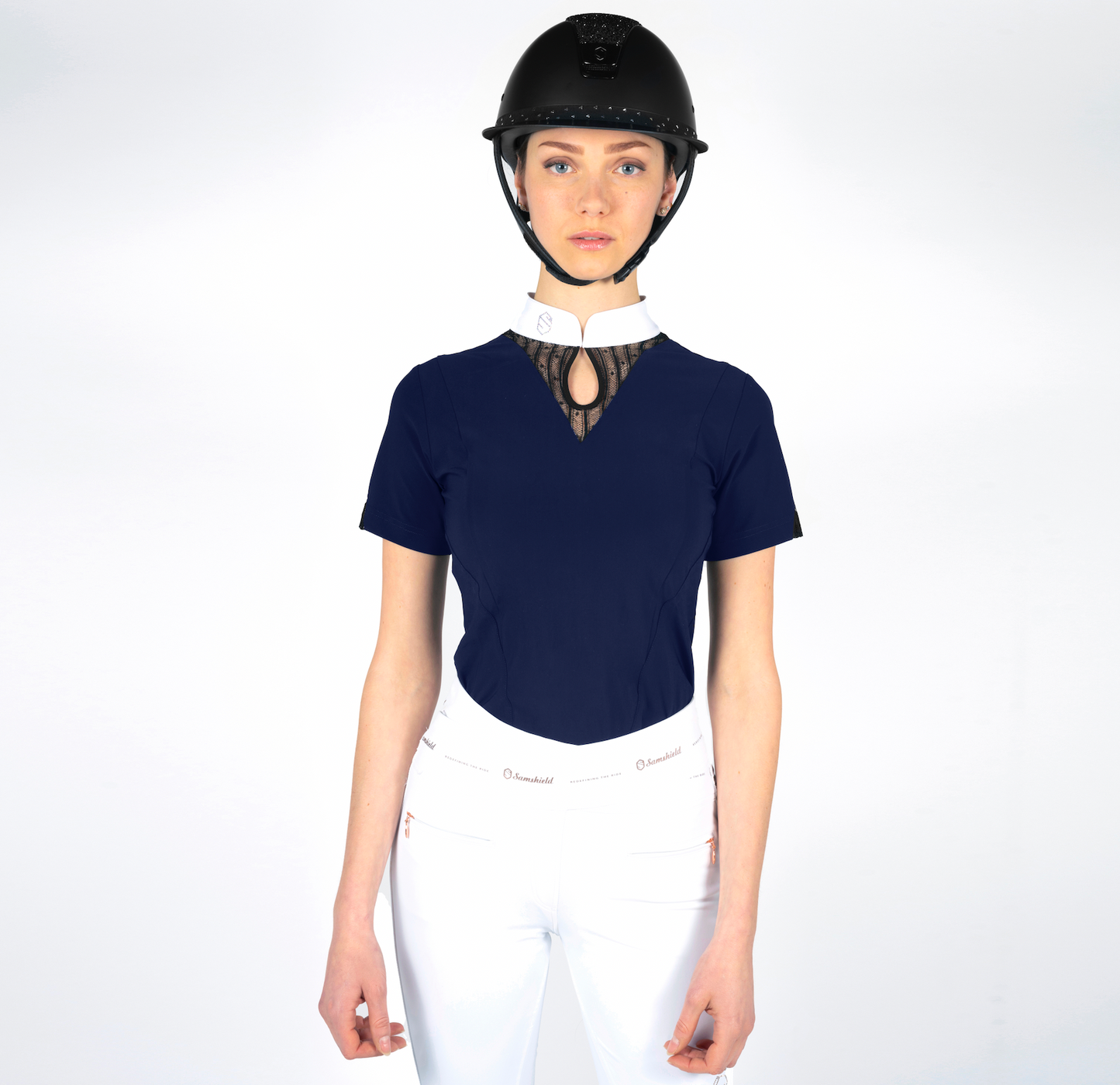 The Bianca shirt is designed in an ultra stretch fabric, breathable and comfortable for great freedom of movement, and extreme comfort. The collar closes with small buttons which are invisible once fastened. It offers protection from ultraviolet light thanks to its anti-UV treatment. The Bianca shirt is decorated with lace on the collar and sleeves, and a Samshield blazon in Swarovski crystals. It is a guarantee of both technicality and refinement.