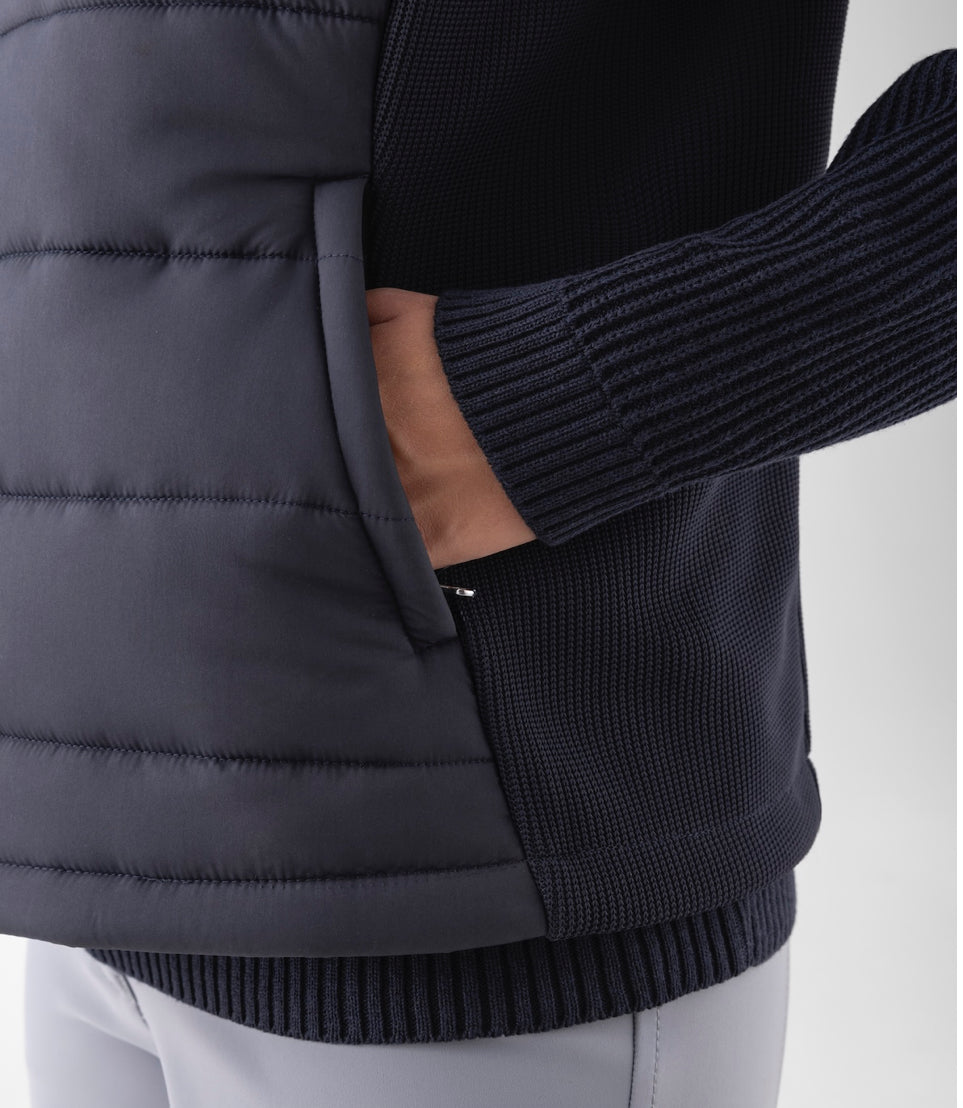 Experience the pinnacle of comfort and performance with the Brigit Women’s Vest from the Early Winter Collection. Featuring the innovative Eco-Duvet insulation system in a medium-weight design, this vest offers exceptional warmth without compromising on mobility. The 2 zip pockets provide practicality, while the 2-way frontal zip ensures easy wear. The vest’s back side is crafted with knitted/micropile fabric for enhanced breathability, while the contrast color printed logo on the chest adds a touch of refined style. Elevate your equestrian ensemble with this versatile and elegant vest.