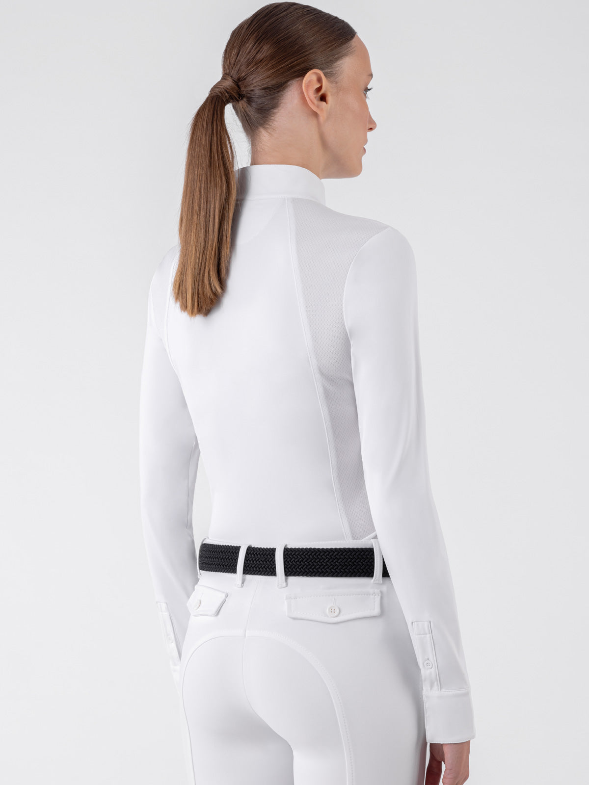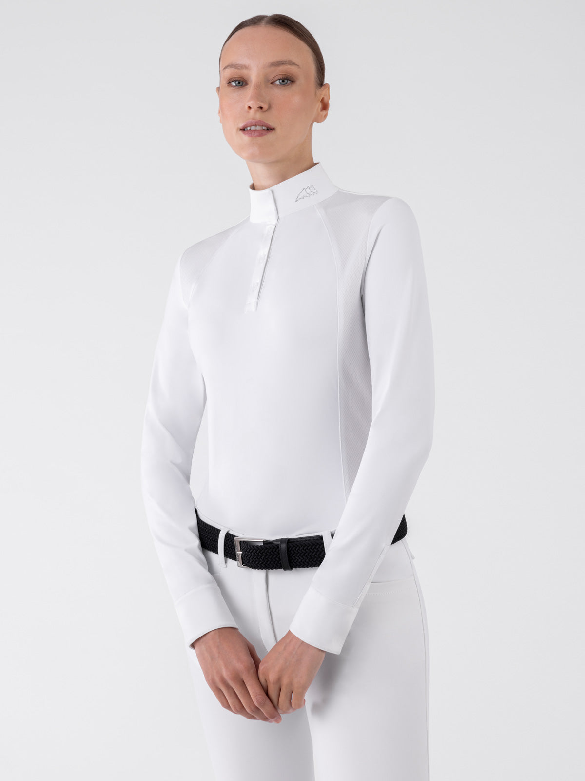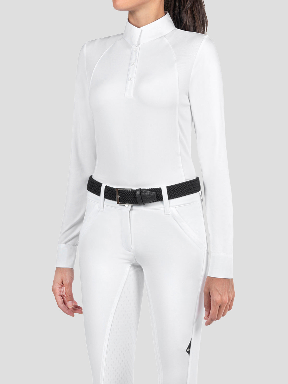 Equiline's new most classic long sleeve women’s show shirt. A perfect blend of elegance and functionality, made with a stretch and breathable fabric. Featuring top button closure and a button collar. Perfect for equitation, hunter and jumpers. Easy care.