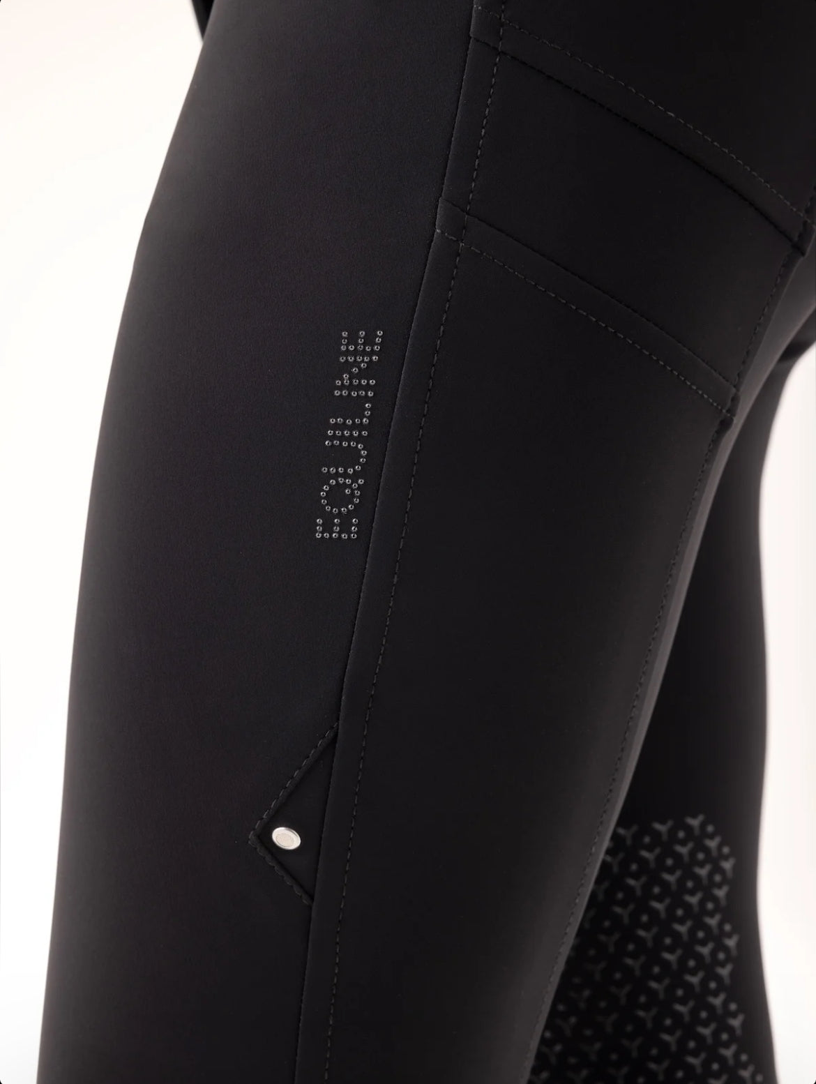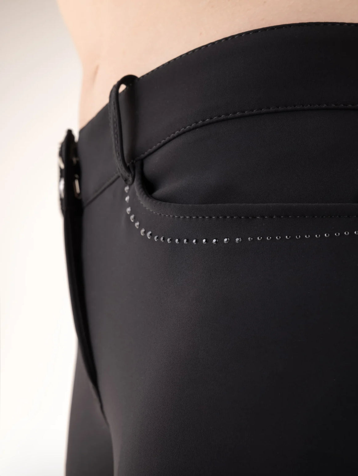 A favorite from the Main Winter Collection for the knee grip lovers, the Gorgakh Highwaisted Women’s Breeches. Crafted from B-Move All Seasons Fabric, these breeches offer exceptional stretch and comfort. The high waist design ensures both a flattering fit and added support. The innovative “Y” knee grip system enhances control and stability. Design features include glamorous touches of tone on tone rhinestones on front pocket and Equiline logo tone on tone rhinestones on the back. With a stretch fastening system featuring a logo on the bottom leg, these breeches seamlessly blend practicality and style. Elevate your riding attire with this meticulously designed piece that epitomizes glamorous and performance.