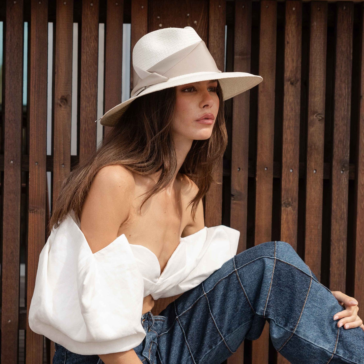 - White straw fedora with broad brim and oversized tan grosgrain band, wrapped asymmetrically around the hat and finished with a modern angular fold.