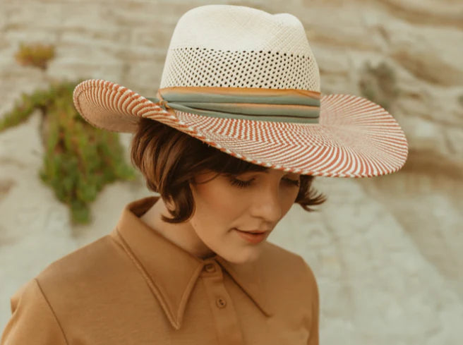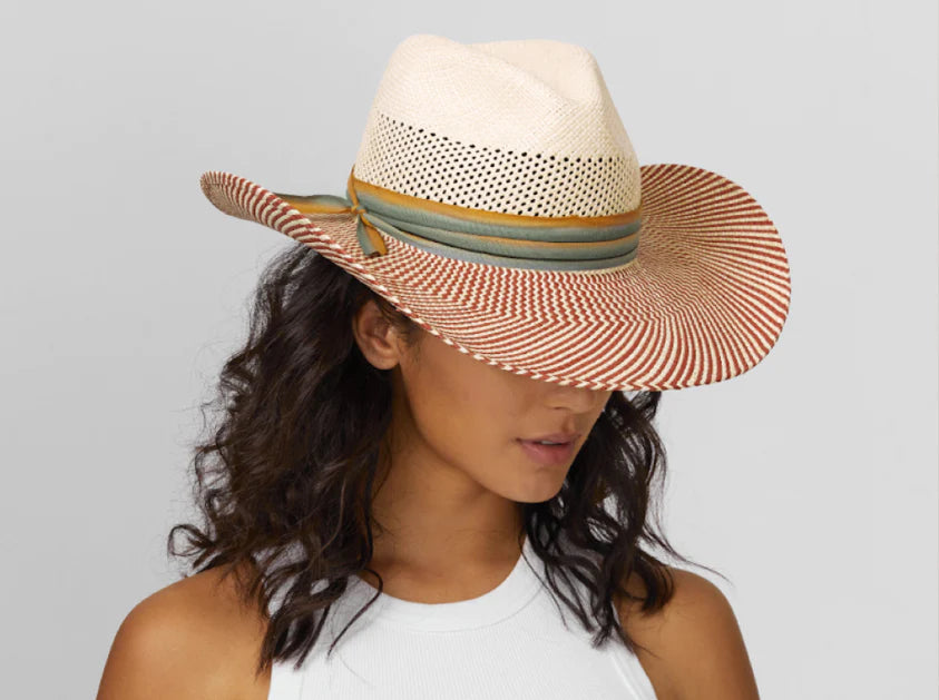 - A vented natural crown paired with upturned cowgirl brim in rust and natural, trimmed with hand-dyed cotton ribbon.
