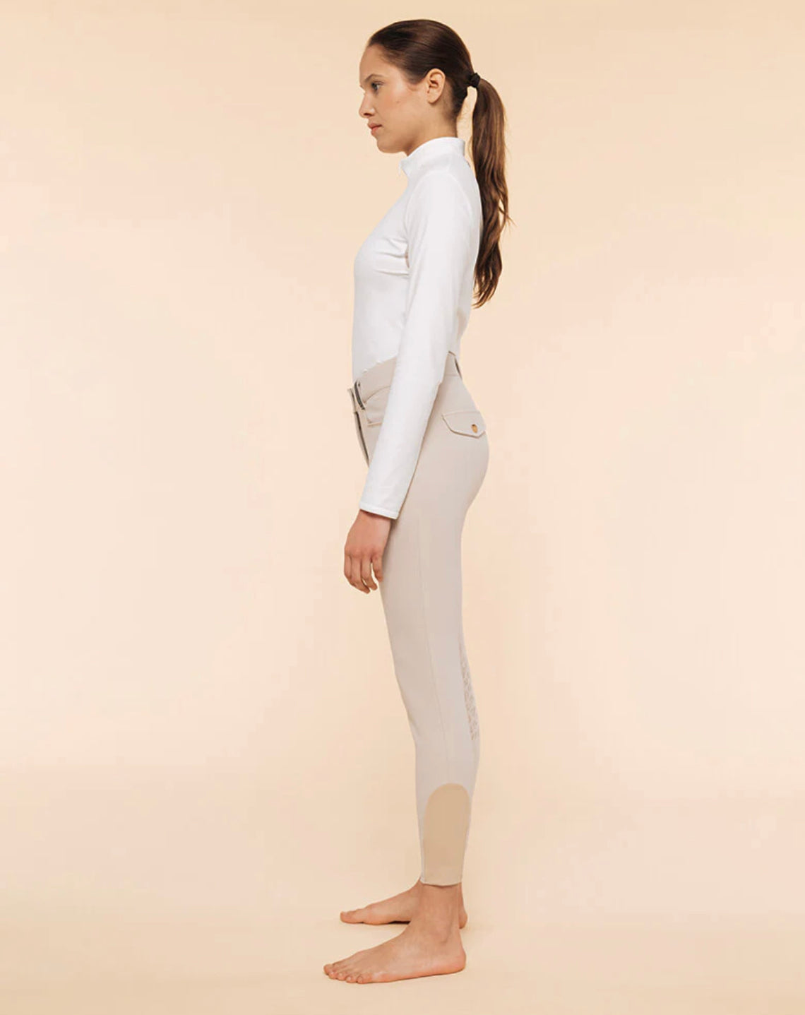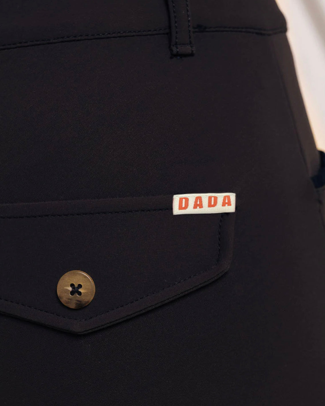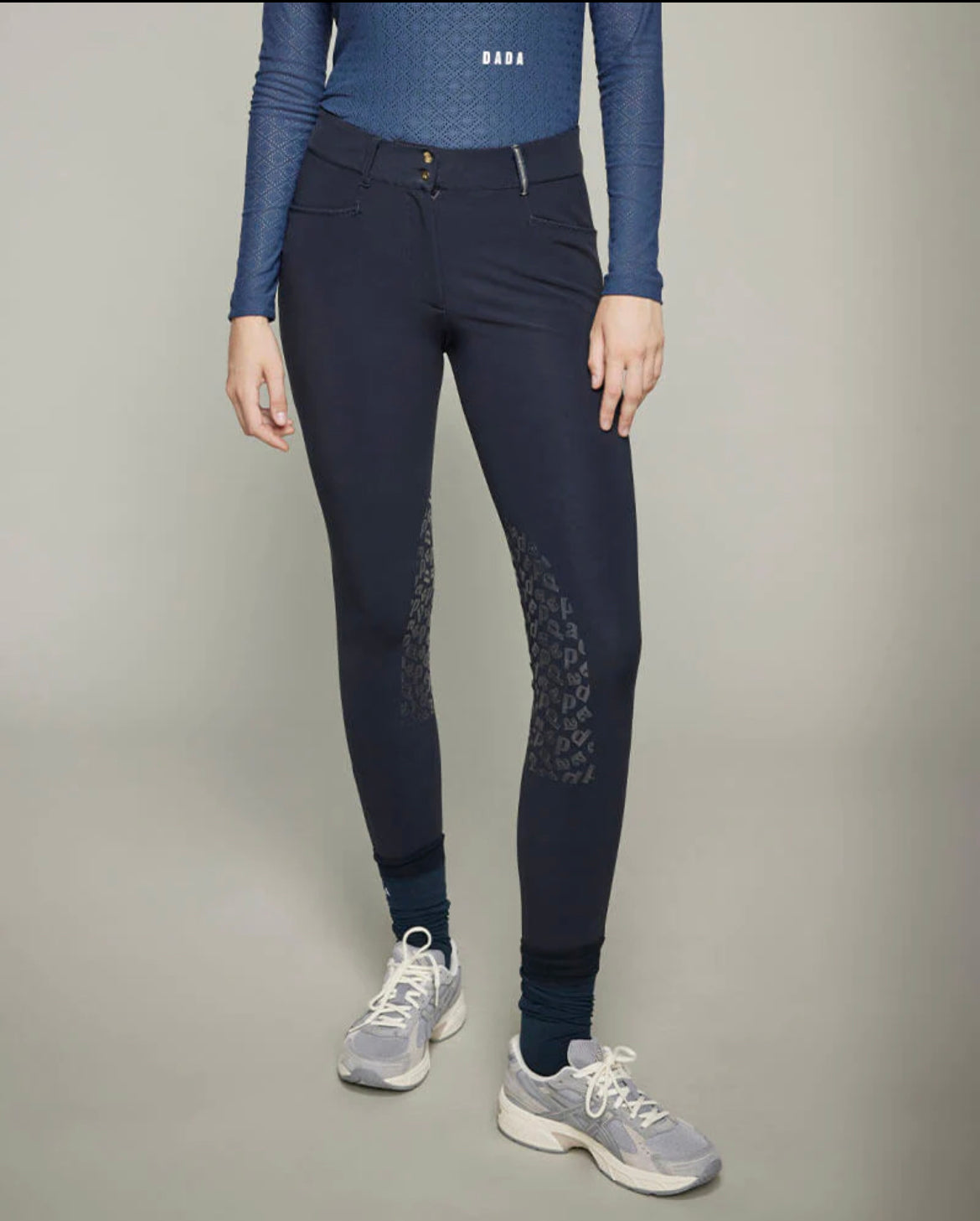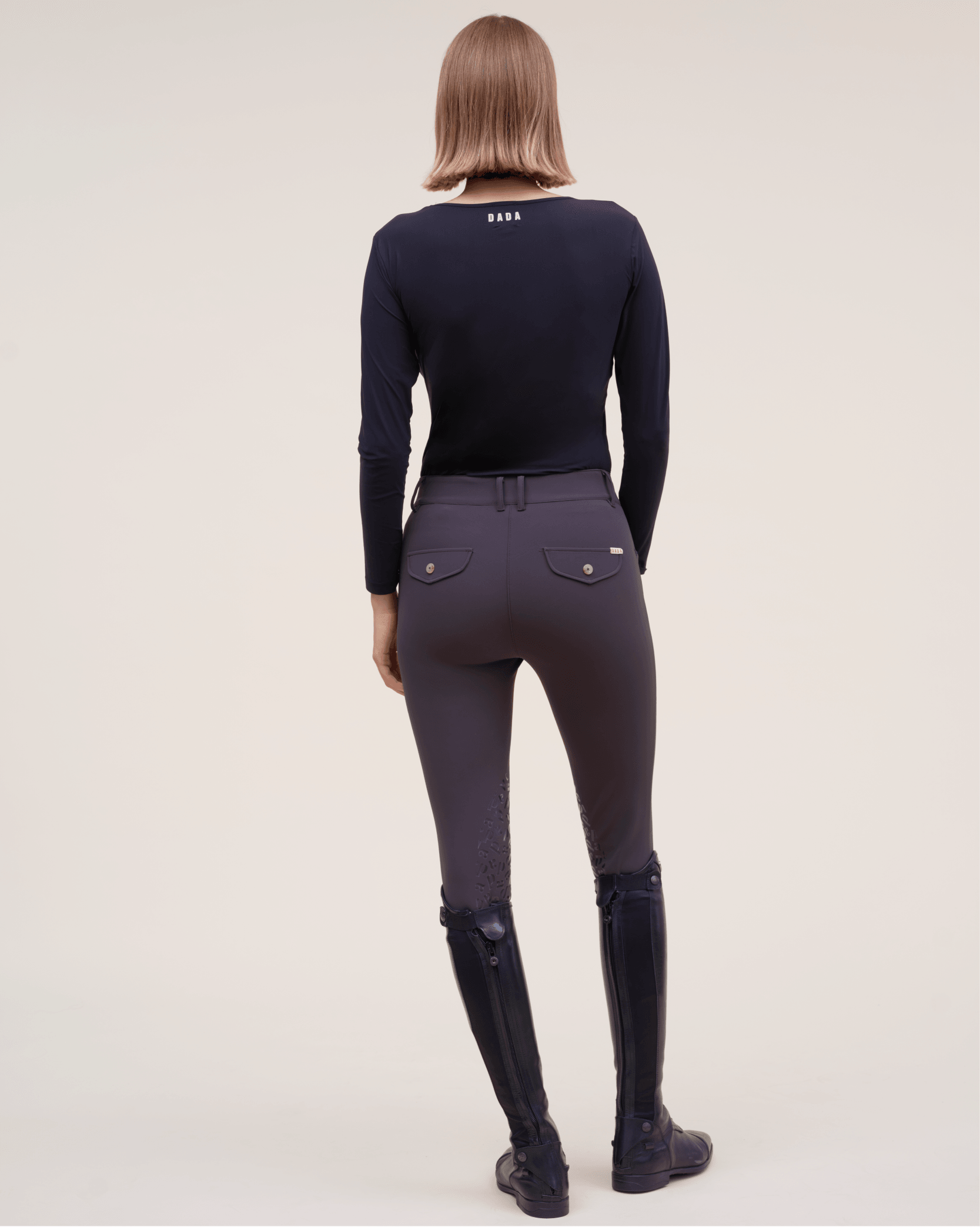 These riding pants from the Dada Sport range are designed in microfiber to offer maximum movement, while providing a shaping effect and optimal comfort. Giovani grip is made with a minimum of seams to limit friction points with the saddle and stirrup leathers. Giovani grip has two transparent patches formed by the Dada Sport logo on the inside of the knees for better stability in the saddle. The particularity of these pants is the work at the waist, their waist is low on the front and high on the lower back for optimum comfort. Its bi-stretch fabric elastic is inserted for better support without compressing and marking the waist. To add style to Giovani grip, every detail is important, the pants close with two golden hooks bearing the DADA logo. In addition, two slant pockets on the front decorated with a braid and two false rear flap pockets with a horn effect button finalize the silhouette. A side label with the DADA logo adorns the right rear pocket.