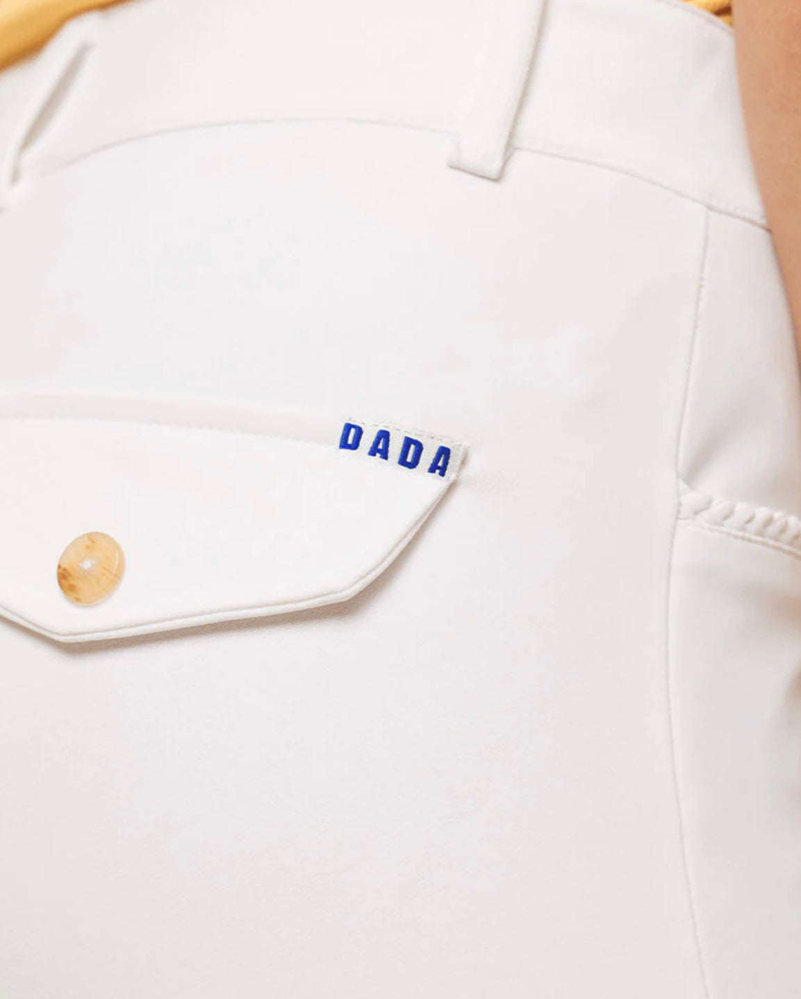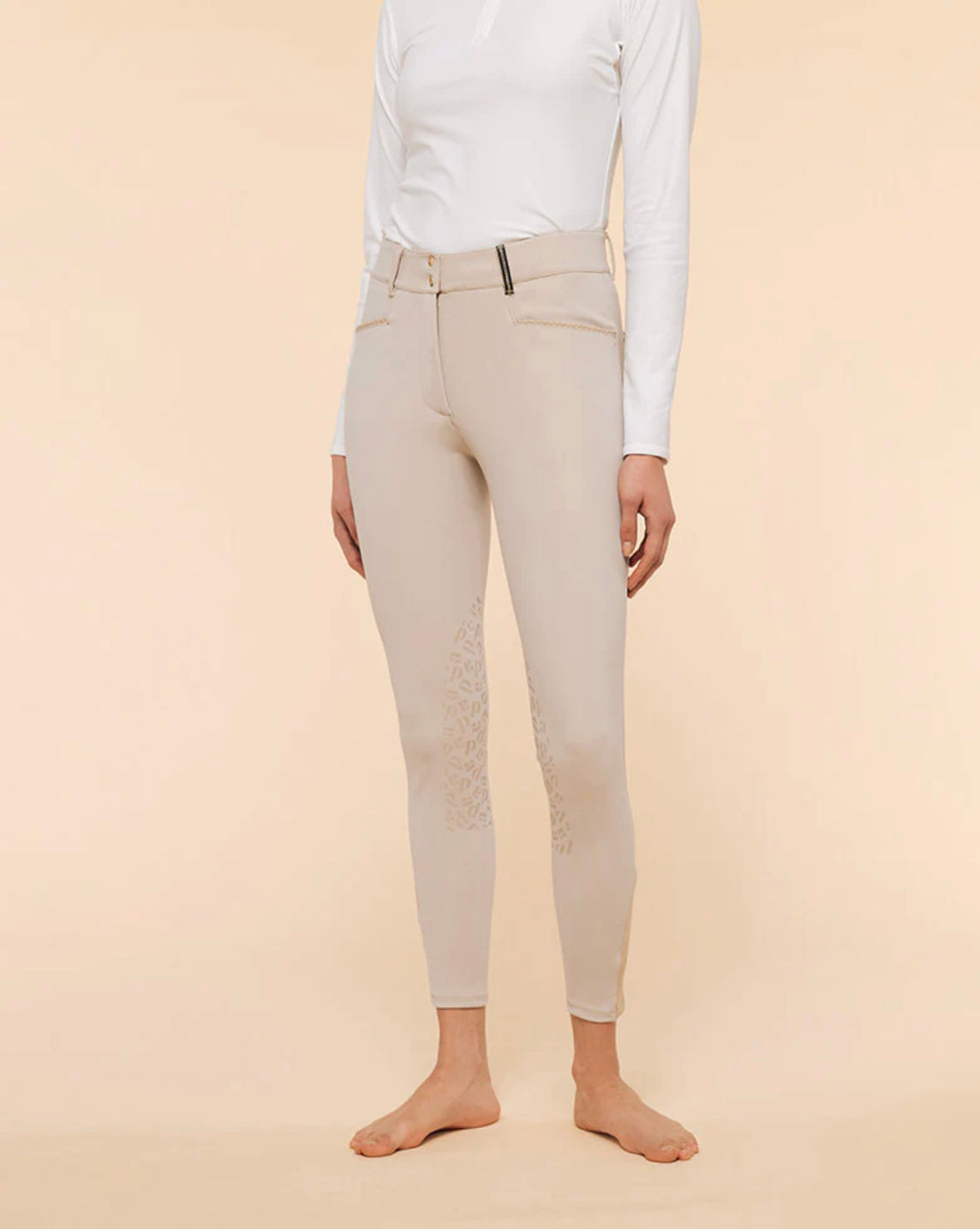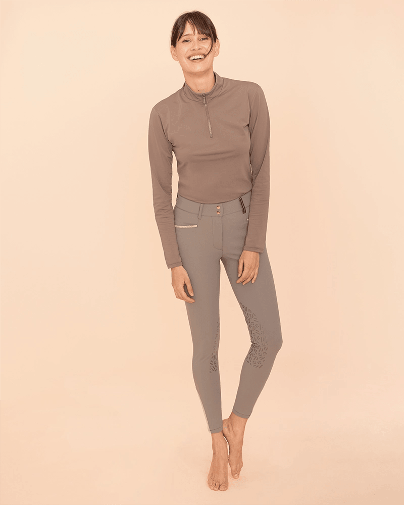 These riding pants from the Dada Sport range are designed in microfiber to offer maximum movement, while providing a shaping effect and optimal comfort. Giovani grip is made with a minimum of seams to limit friction points with the saddle and stirrup leathers. Giovani grip has two transparent patches formed by the Dada Sport logo on the inside of the knees for better stability in the saddle. The particularity of these pants is the work at the waist, their waist is low on the front and high on the lower back for optimum comfort. Its bi-stretch fabric elastic is inserted for better support without compressing and marking the waist. To add style to Giovani grip, every detail is important, the pants close with two golden hooks bearing the DADA logo. In addition, two slant pockets on the front decorated with a braid and two false rear flap pockets with a horn effect button finalize the silhouette. A side label with the DADA logo adorns the right rear pocket.