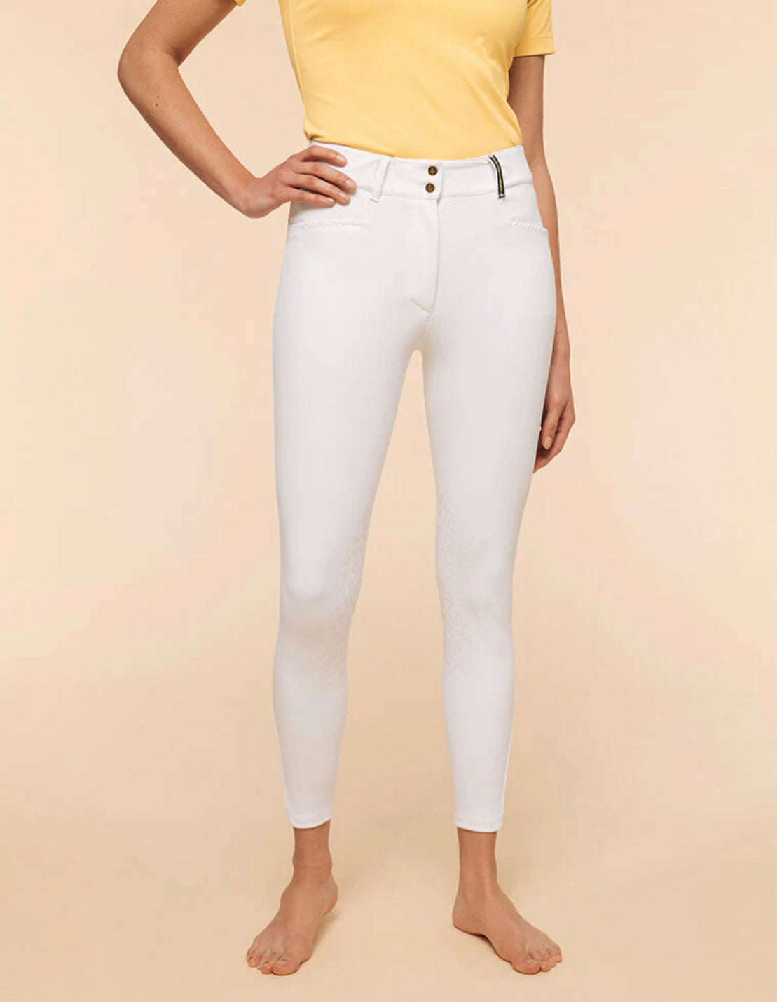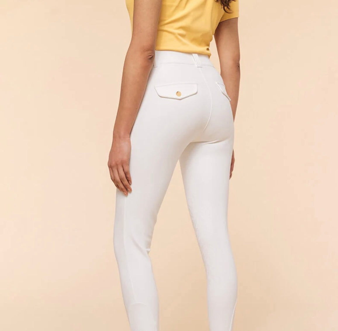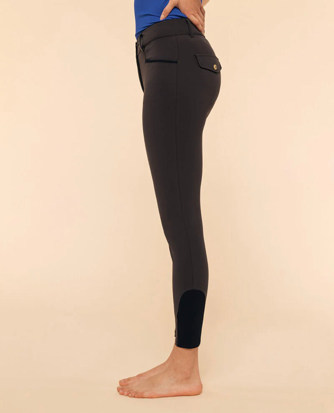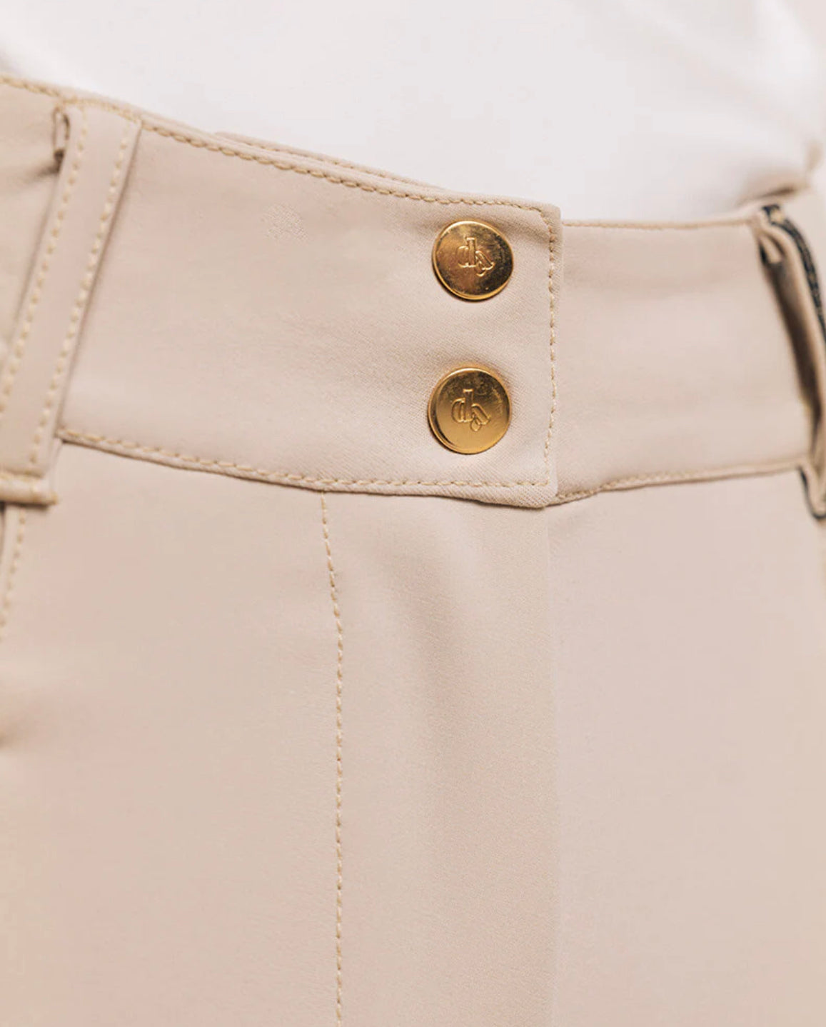 These riding pants from the Dada Sport range are designed in microfiber to offer maximum movement, while providing a shaping effect and optimal comfort. Giovani grip is made with a minimum of seams to limit friction points with the saddle and stirrup leathers. Giovani grip has two transparent patches formed by the Dada Sport logo on the inside of the knees for better stability in the saddle. The particularity of these pants is the work at the waist, their waist is low on the front and high on the lower back for optimum comfort. Its bi-stretch fabric elastic is inserted for better support without compressing and marking the waist. To add style to Giovani grip, every detail is important, the pants close with two golden hooks bearing the DADA logo. In addition, two slant pockets on the front decorated with a braid and two false rear flap pockets with a horn effect button finalize the silhouette. A side label with the DADA logo adorns the right rear pocket.