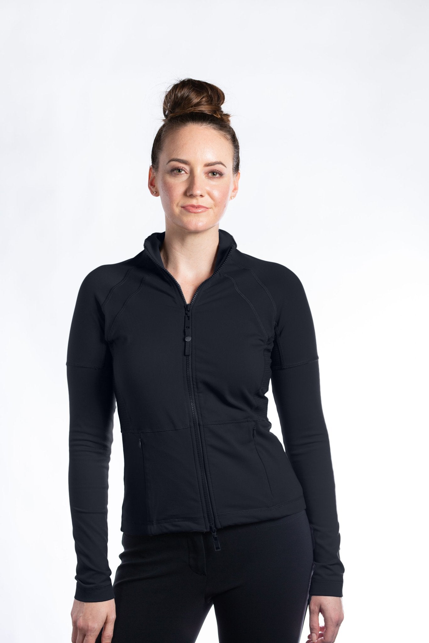 Sophisticated and sporty, the Ryder Warm Up Jacket is tailored specifically for the equestrian athlete. A streamlined silhouette makes it easy to layer for chilly mornings, while the moisture wicking fabric and mesh vents keep you dry all day long. With a two-way zipper and hidden pockets in the sides and back, the Ryder jacket is a necessity for early morning hacks and evening jump schools.