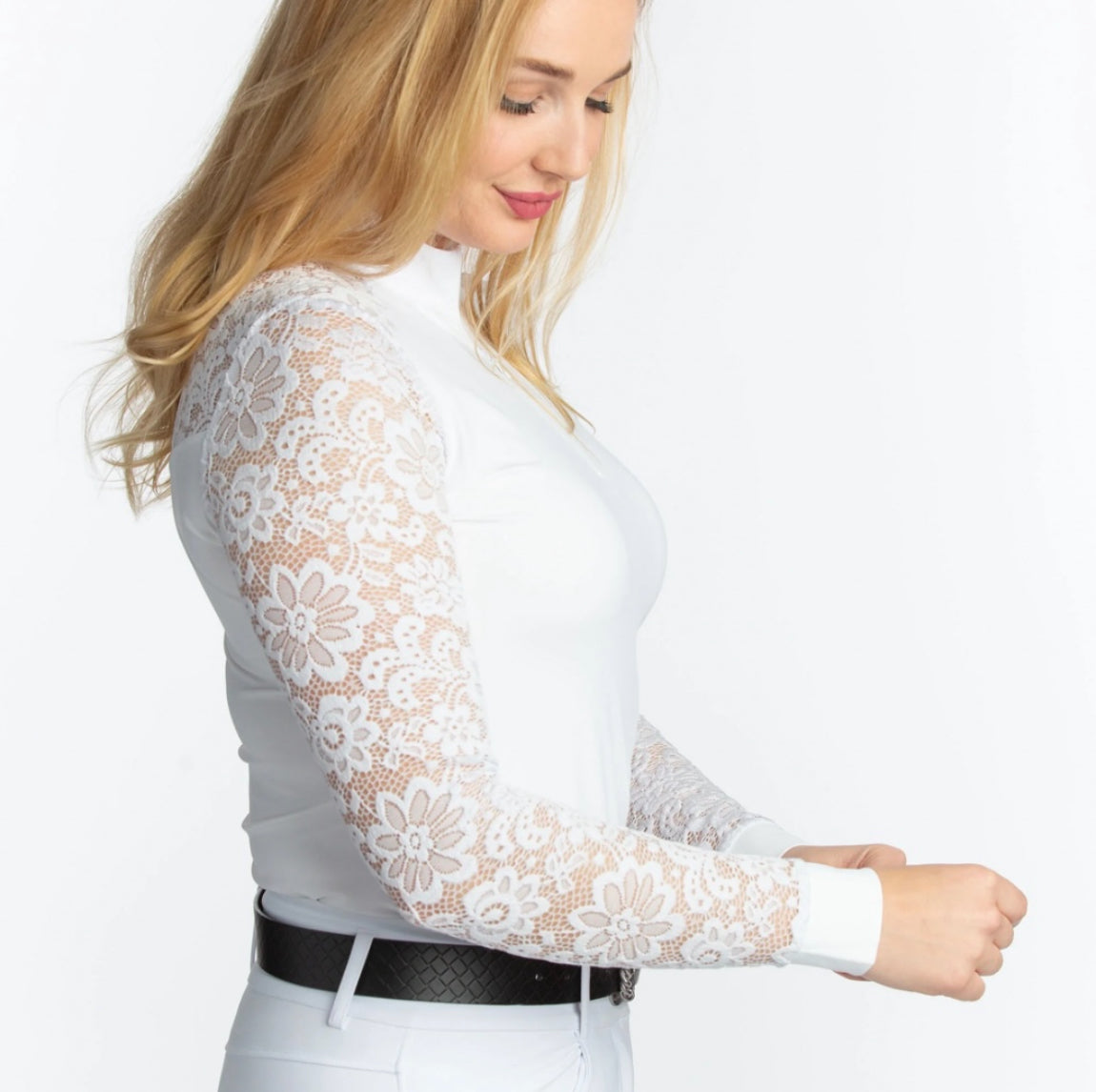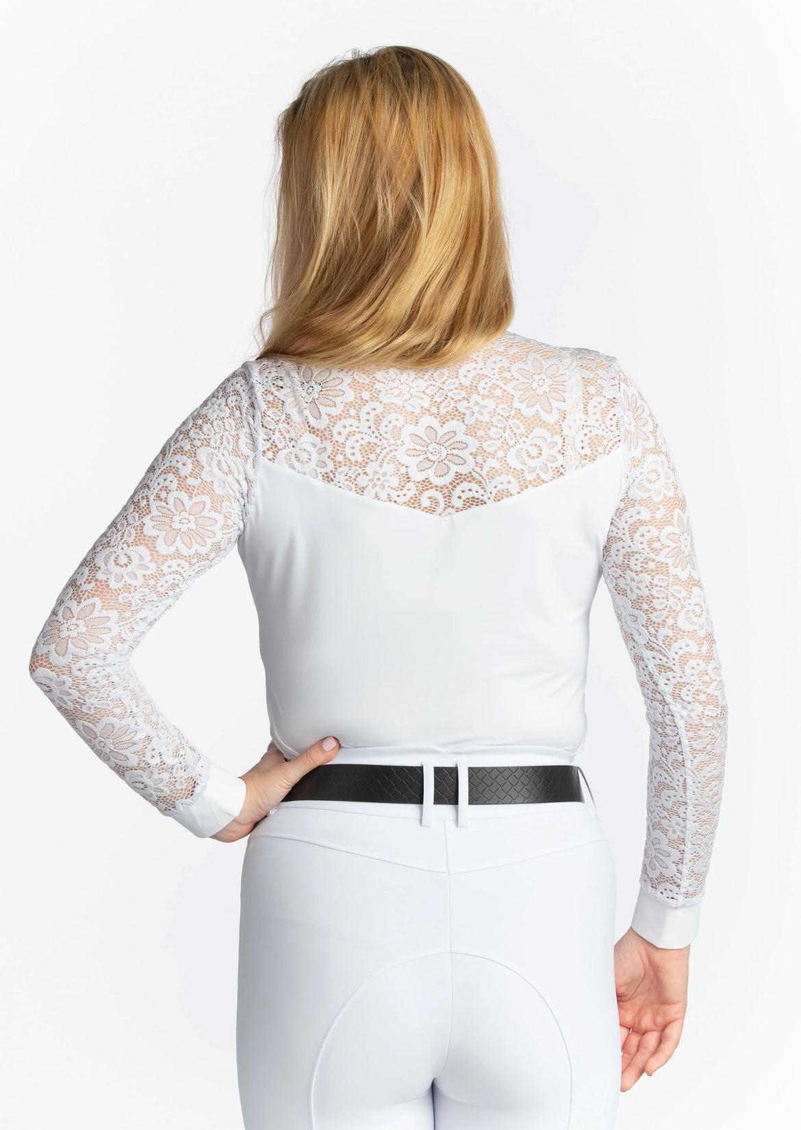 Unleash your feminine grace with the Jaclyn Lace Long Sleeve Show Shirt. She effortlessly combines elegance and sophistication with her intricate lace sleeves, shoulder, and back detailing. The white collar adds a touch of crispness to her design, completing the perfect balance of delicacy and refinement. In the white variant, a white logo discreetly showcases your style in the show ring. Prepare to make a lasting impression with the Jaclyn Lace Long Sleeve Show Shirt, where classic beauty meets contemporary allure.