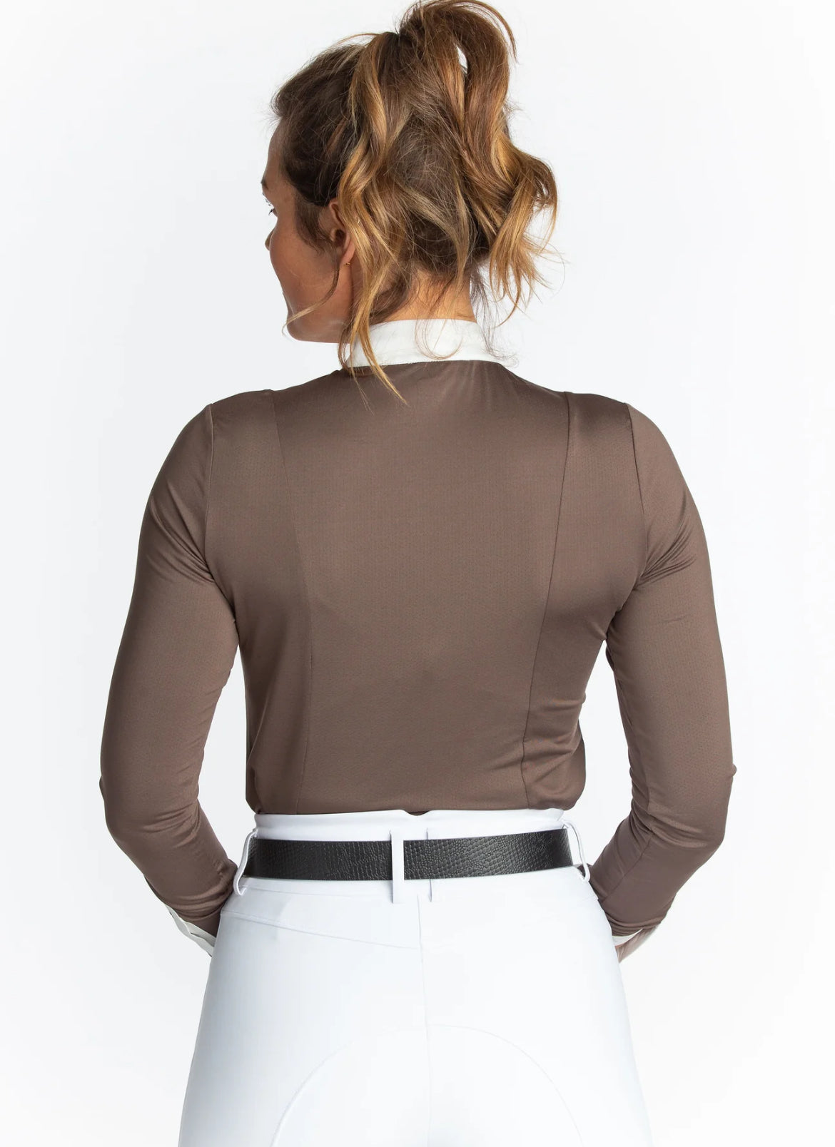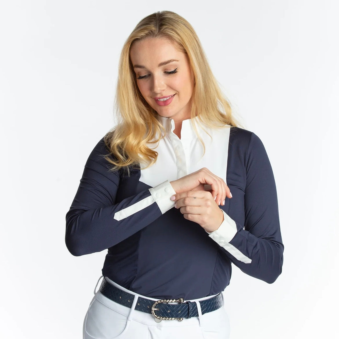 Elevate your show-ready ensemble with the Luna 1/2 Button Long Sleeve Show Shirt. Mixing on-trend colors with a classic white bib front, Luna strikes the perfect balance between modernity and tradition. The non-sheer mesh on the sleeves and back ensures optimal breathability, keeping you ultra cool during intense performances. The front hidden snap placket adds a touch of sleekness to her design, while the white logo discreetly showcases your impeccable taste. Step into the spotlight with confidence and style in the Luna 1/2 Button Long Sleeve Show Shirt.