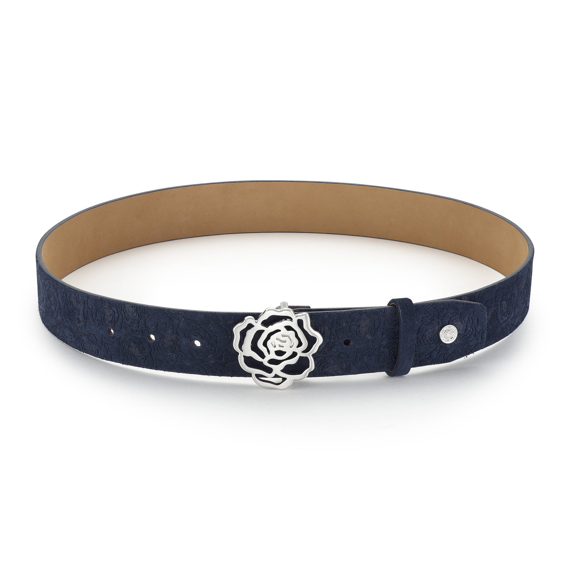 Silver Rose Shaped buckle with midnight blue rose embossed leather