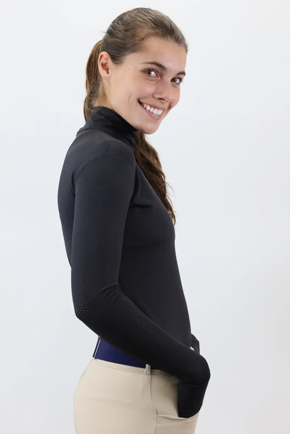 You asked for a long sleeve turtleneck shirt with UV protection, we made it! This new beautiful shirt is logo-less! No frills, just pure performance and a beautiful flattering fit. A true “stable to street” shirt. You can go from riding to lunch (and of course back to riding) in this shirt!