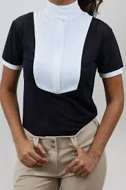 With 1/2″ cuffed sleeves and the white placket bib design, this shirt doubles up as show jacket when used in conjunction with the Airbag Safety Vests. The shirt features an 1/4 length invisible concealed zipper. The crossover collar is just the right firmness making it ideal for competition use.
