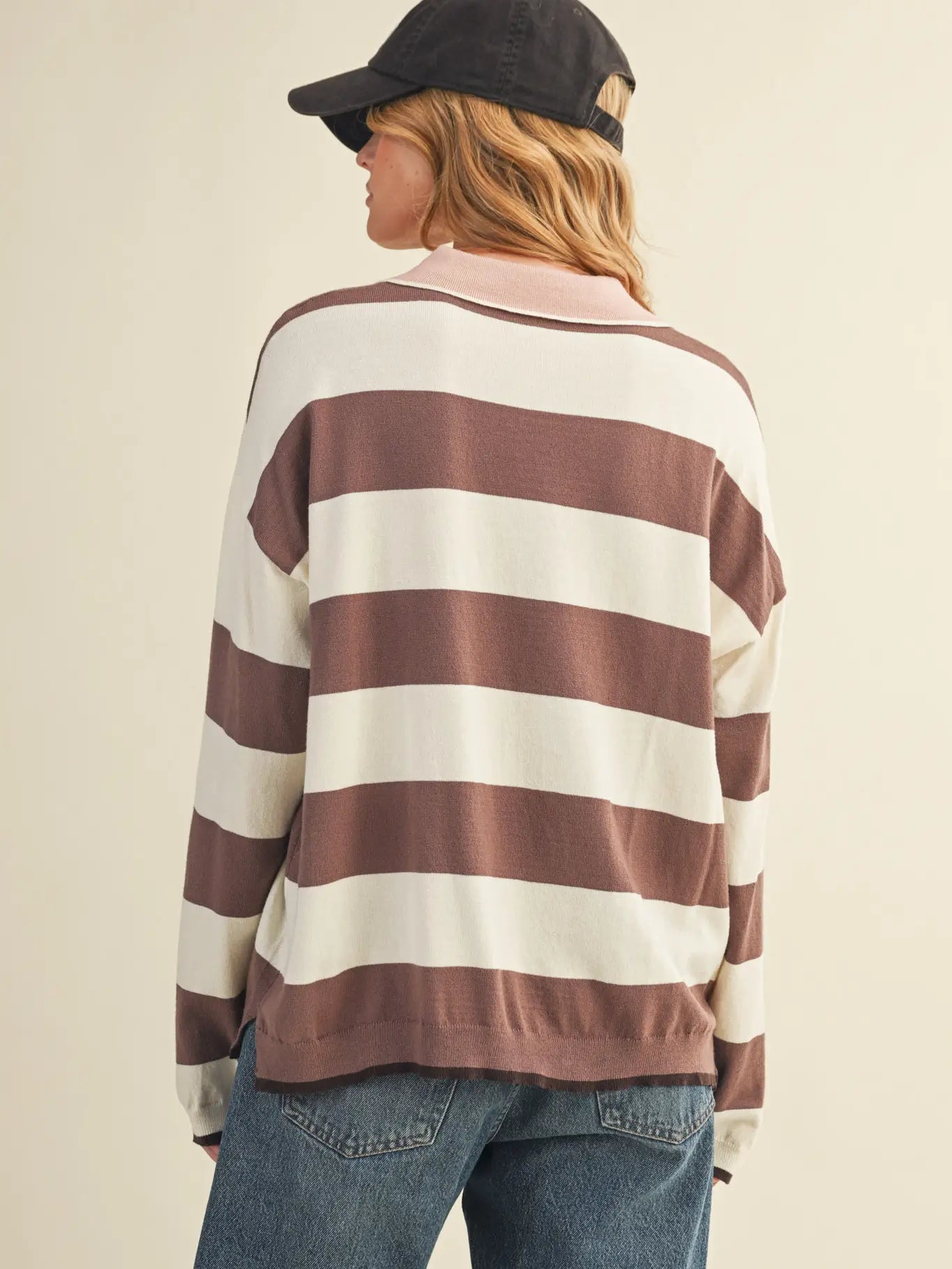 + Striped rugby sweater + Collared neckline with button placket + Drop shoulder long sleeves + Slouchy relaxed fit pullover + Ribbed collar, cuffs, and hem + Model is 5' 7.5" 30-25-36 and wears a S