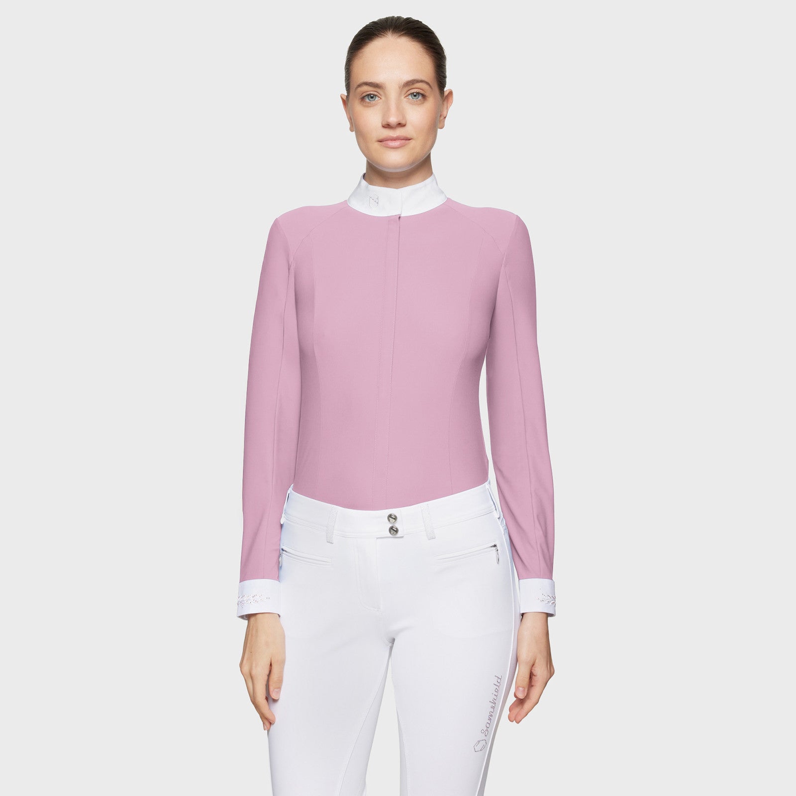 Aline Crystal women's long-sleeved equestrian competition top. Designed for riders looking for timeless style with crystal details in a technical top.