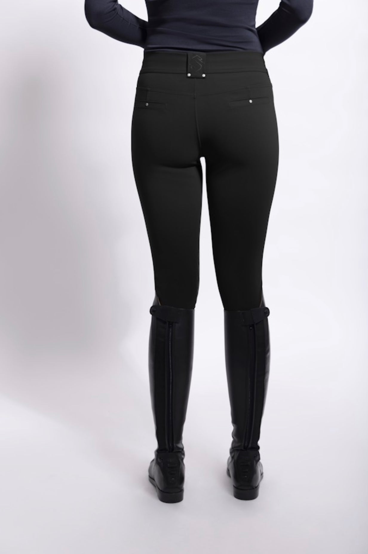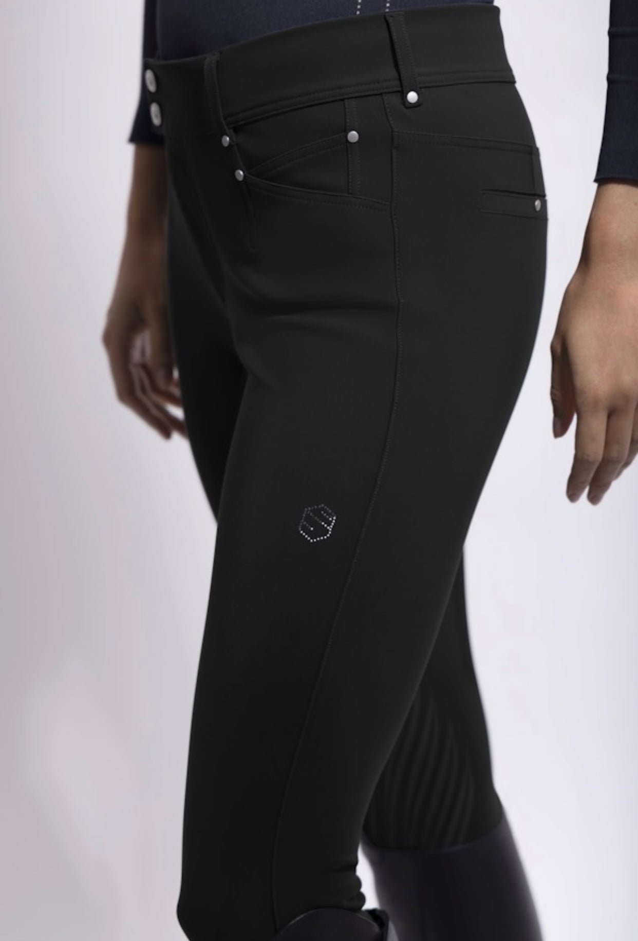 Made of a very resistant stretch material that is both anti-wear and anti-slip, the Ambre breeches offer a second skin effect for an optimal fit. The highly breathable and windproof elastic material ensures comfort and ventilation. The grip on the inside of the knees ensures stability and riding comfort. The material under compression of the calves allows a perfect support of the breeches. The elastic inside the waistband is equipped with a grip to prevent the shirt from riding up. The anti-UV treatment protects the skin from ultraviolet rays.