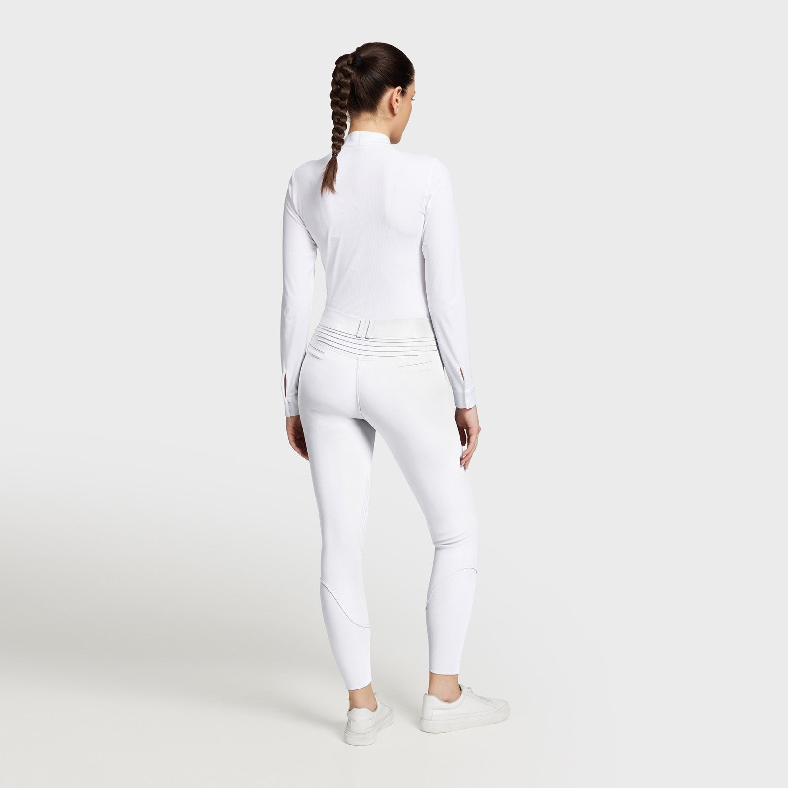 Chloe Crystal Breeches feature subtle Swarovski detailing on the belt loops, with a discreet tone on tone embroidered logo on the leg and a flattering pleat panel on the rear. The fabric benefits from body temperature regulating technology, wicking away moisture keeping you dry and comfortable all year round. The four way stretch, Italian material provides a second skin feel for the rider with total freedom of movement whilst a six layer grip gives complete stability in the saddle. Additional features include a phone pocket, compressive calf area increasing bloodflow and contrasted top stitching and pleats across the back with inner elastic panel to keep your shirt fixed in place Easy care, machine washable at 30'. Composition Fabric 1: 72%PA/28%EA Composition Fabric 2: 59%PA/41%EA