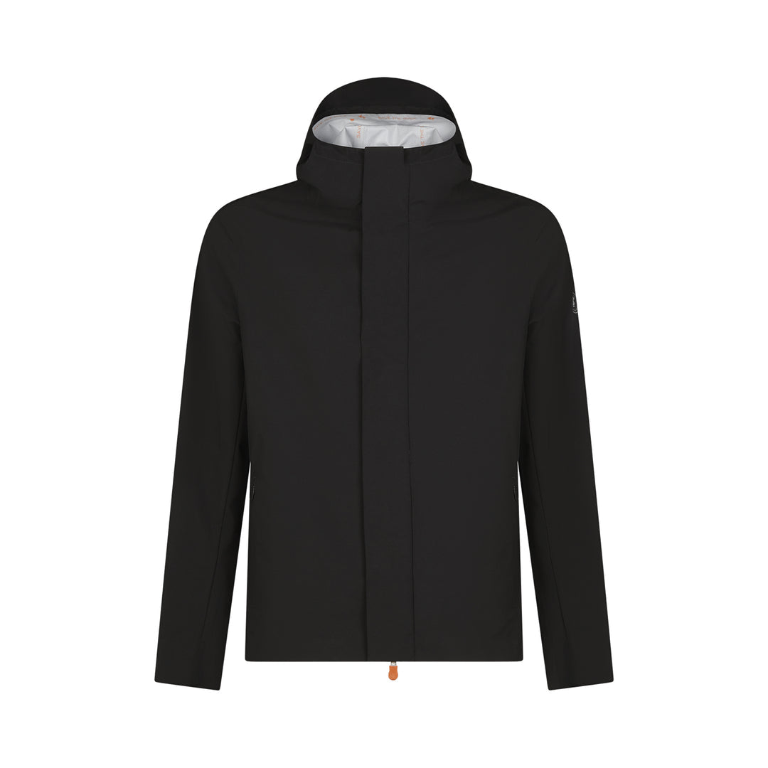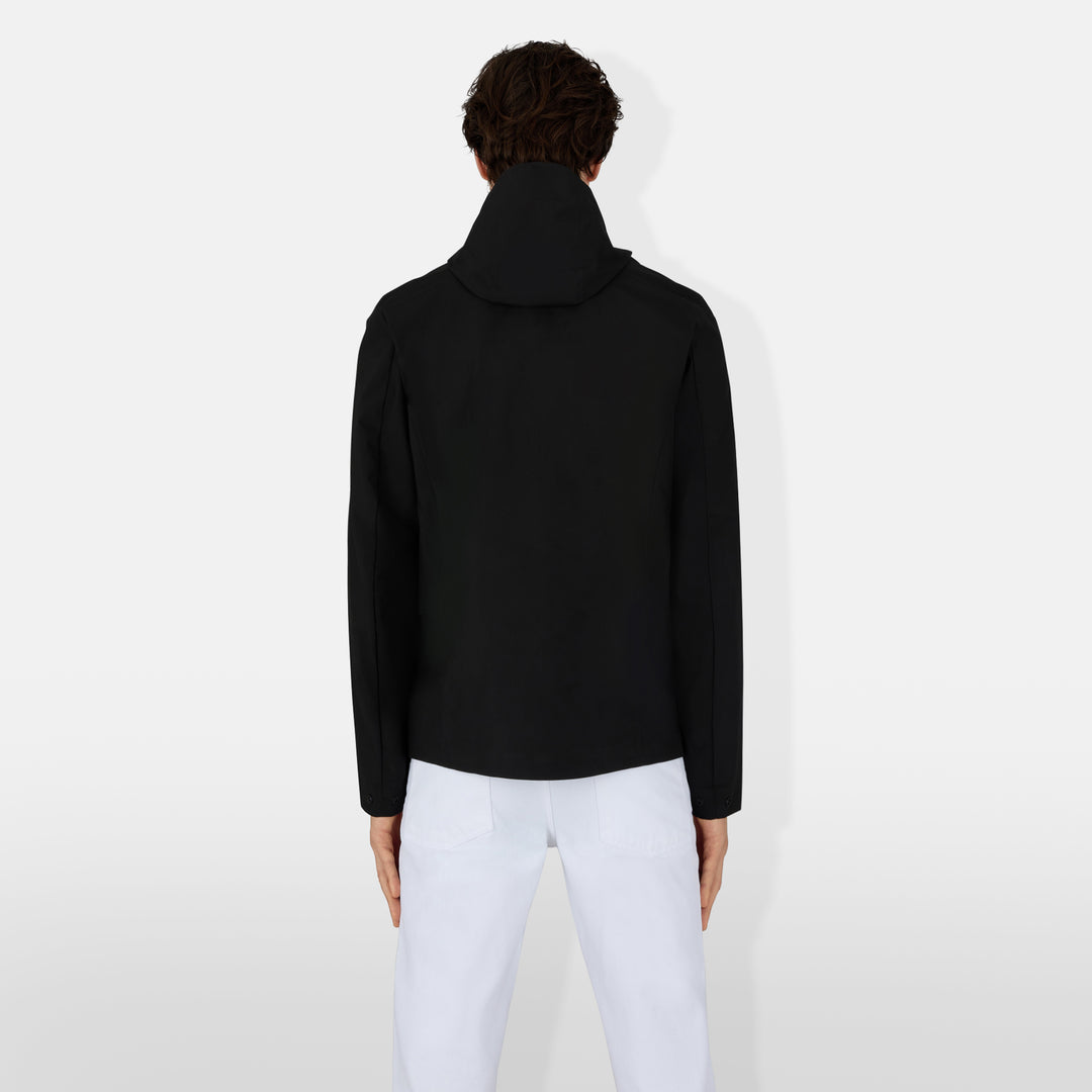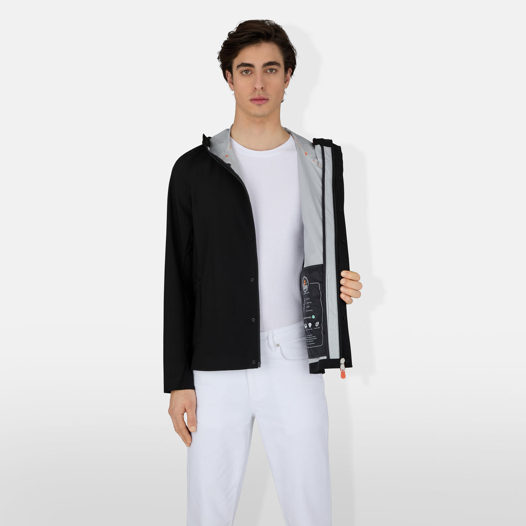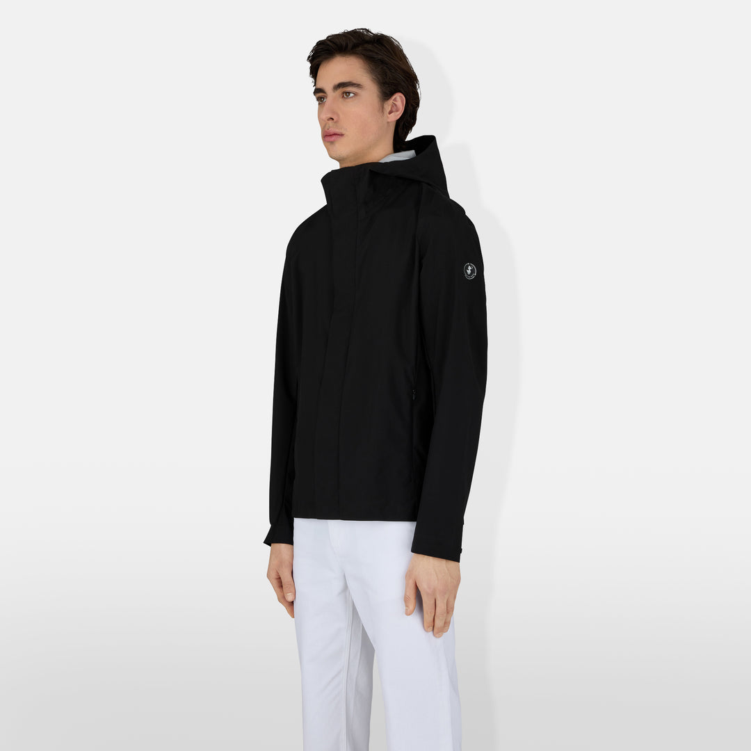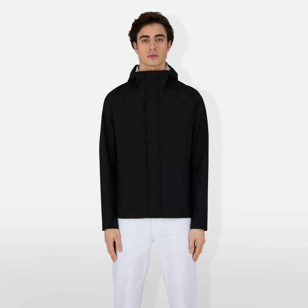 An hooded, unlined raincoat with taped seams made with 2.5 ply 100% recycled polyester fabric that guarantees excellent waterproof and breathable performance. Equipped with pockets that are enclosed by concealed zips, an adjustable hood that is fully taped, a front zip closure with double slider and plastic snap buttons.