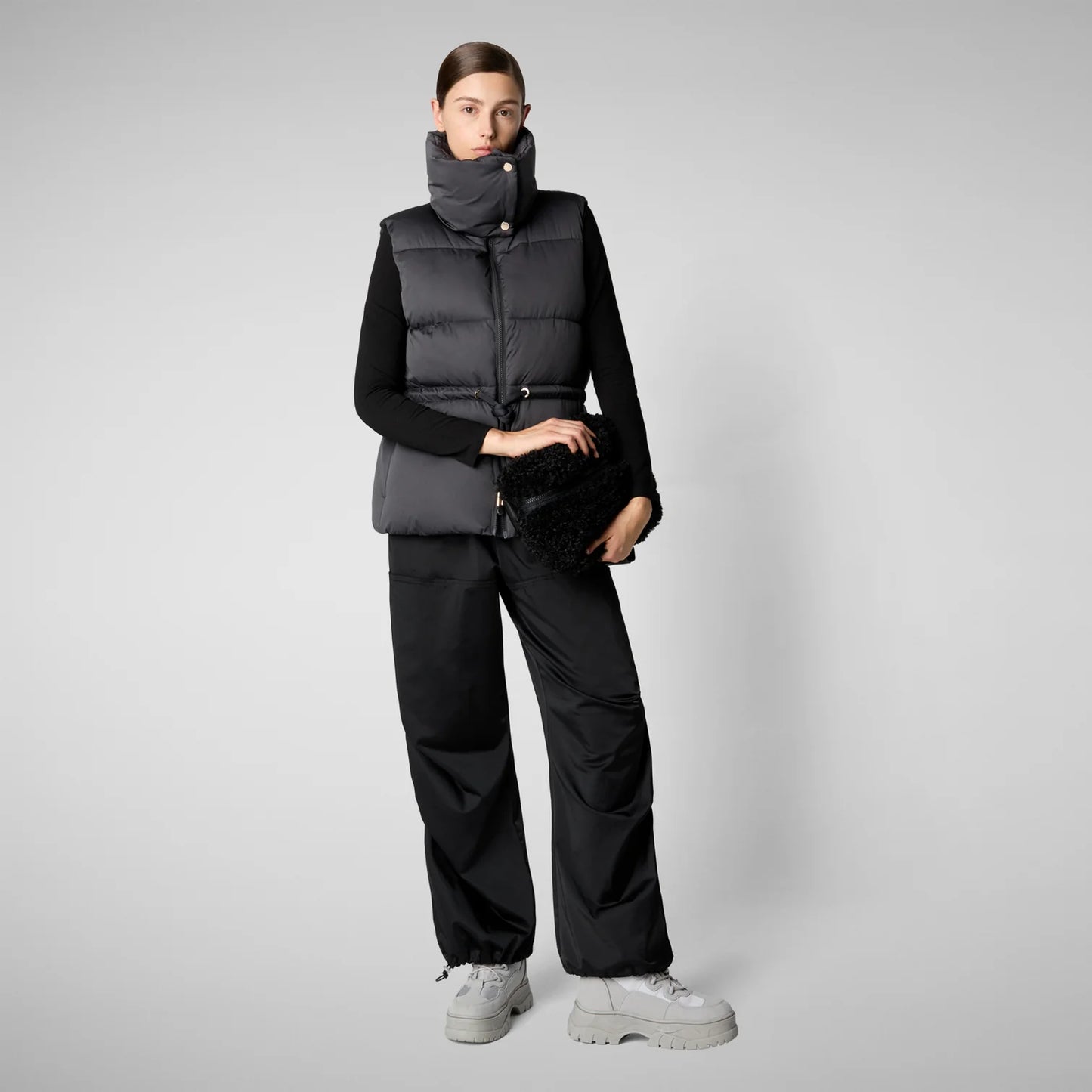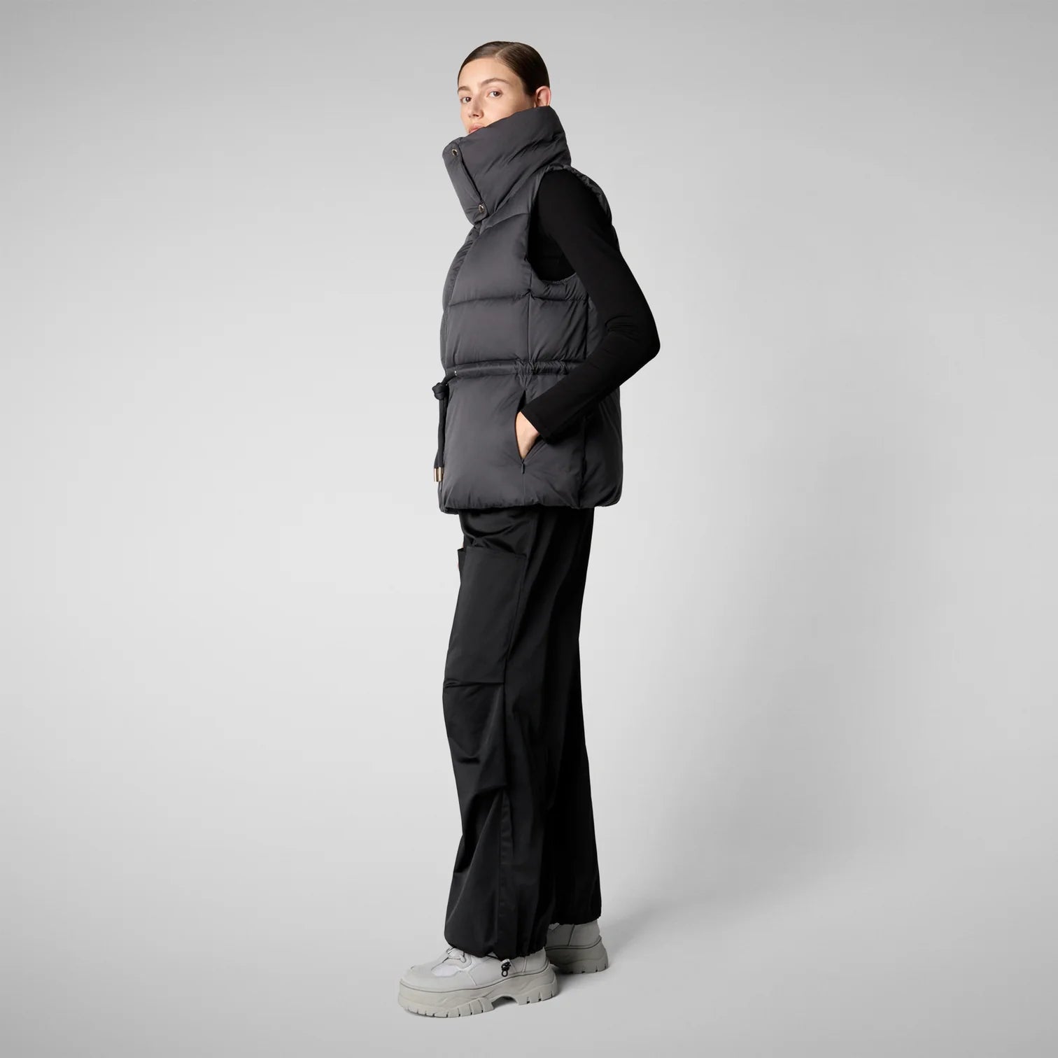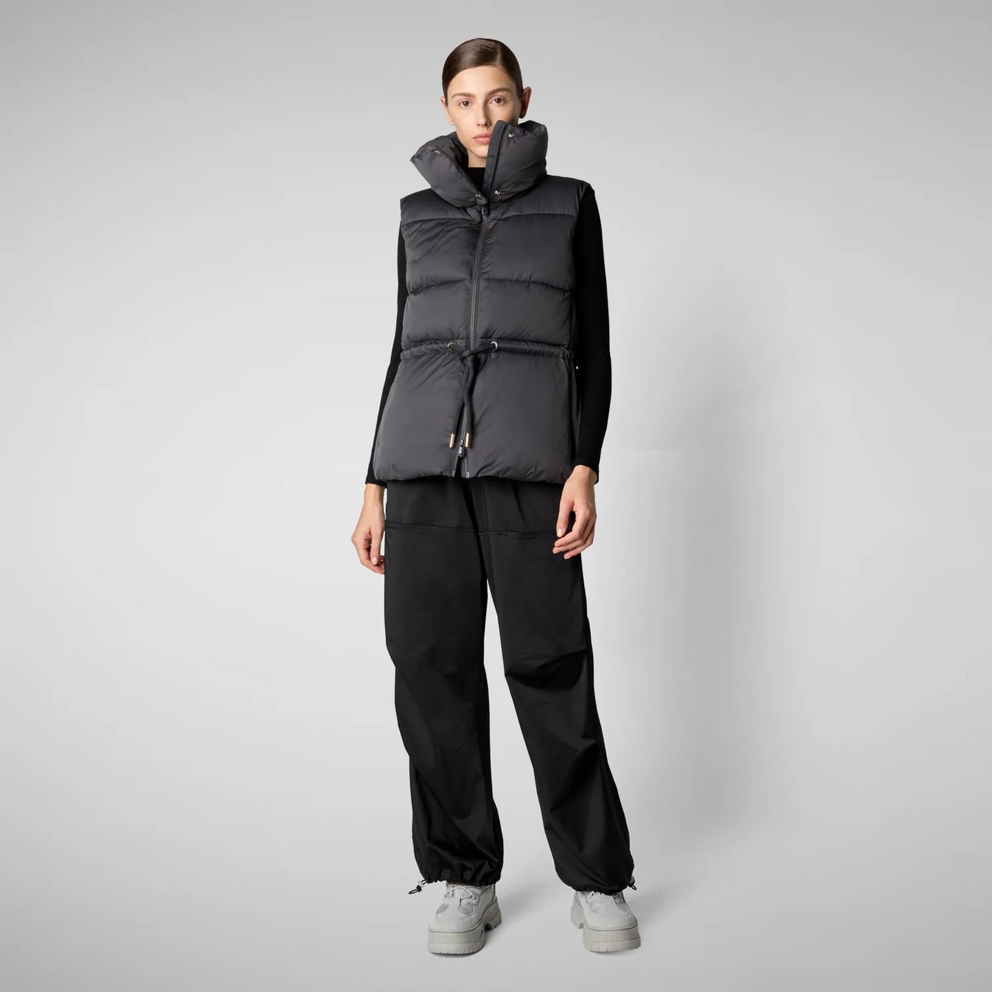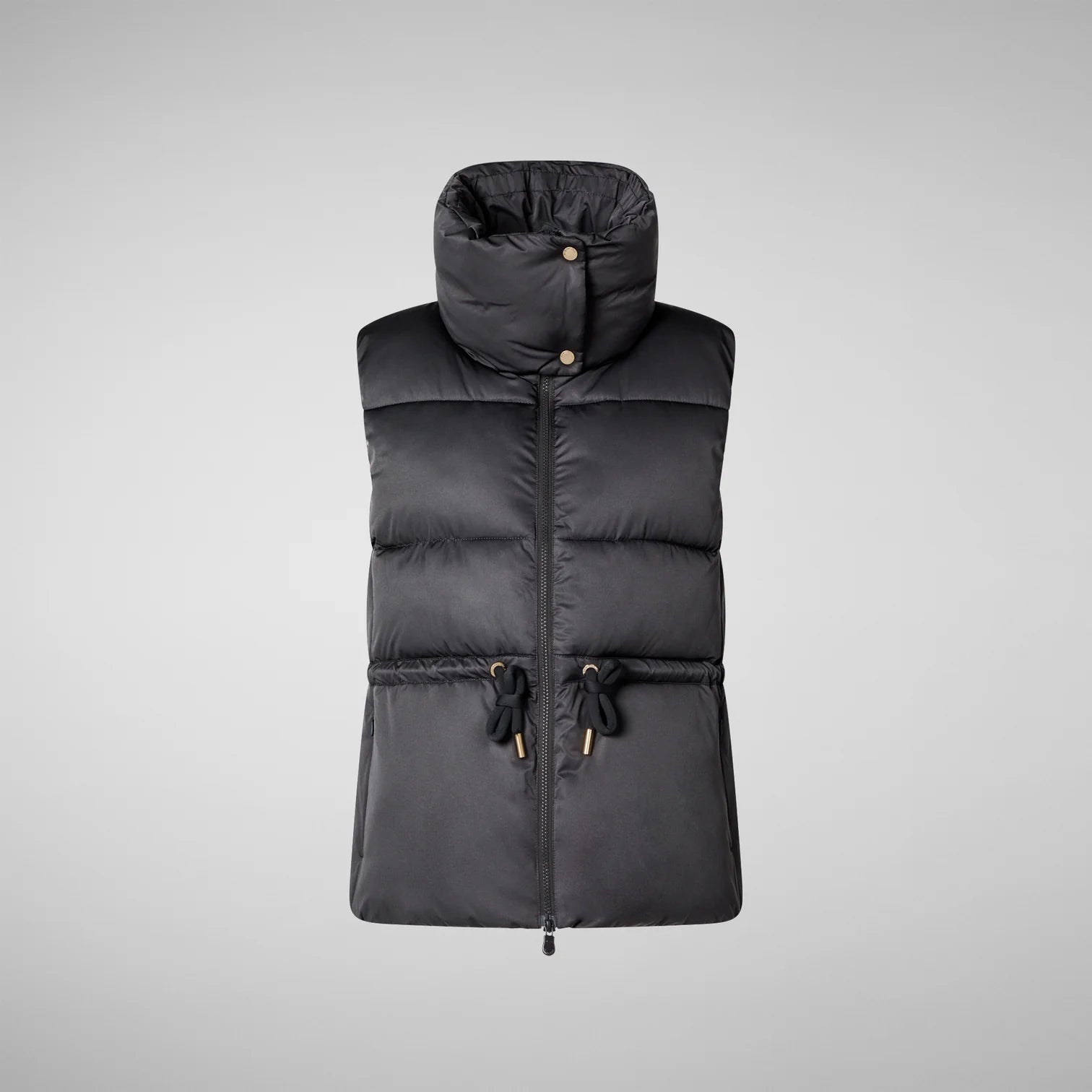 Looking for a reliable companion for layering season? Look no further than our Ren puffer vest, where animal free comfort meets recycled materials. Accented by light gold details, this design features a high neck fastened by two snap buttons. The adjustable drawstring at the waist provides a snug, personalized fit.