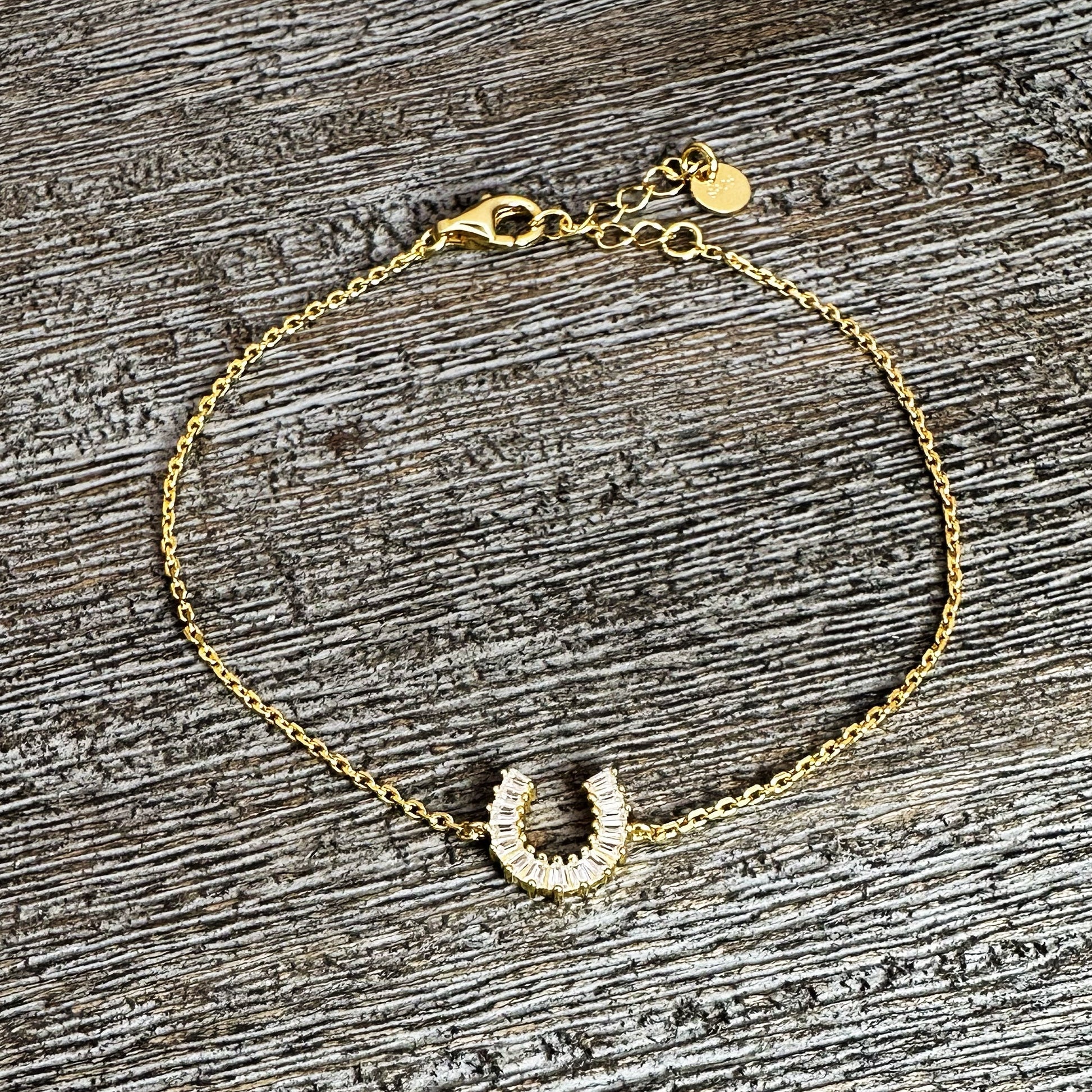 Looking for a touch of elegance and a dash of good fortune in your life? The Lucky AF Horseshoe Bracelet is here to add a sparkle of charm to your everyday adventures. Made from sterling silver and plated in luxurious 14K yellow gold, this bracelet exudes timeless beauty and sophistication. The pièce de résistance is the stunning horse shoe charm, adorned with dazzling cubic zirconia baguette stones, making it the perfect blend of glamour and luck.