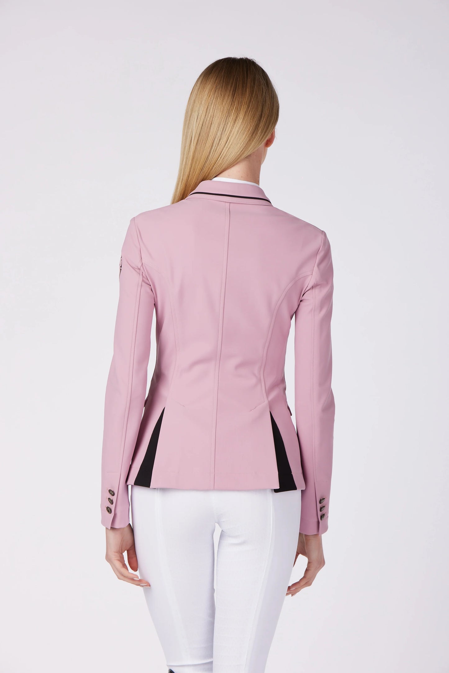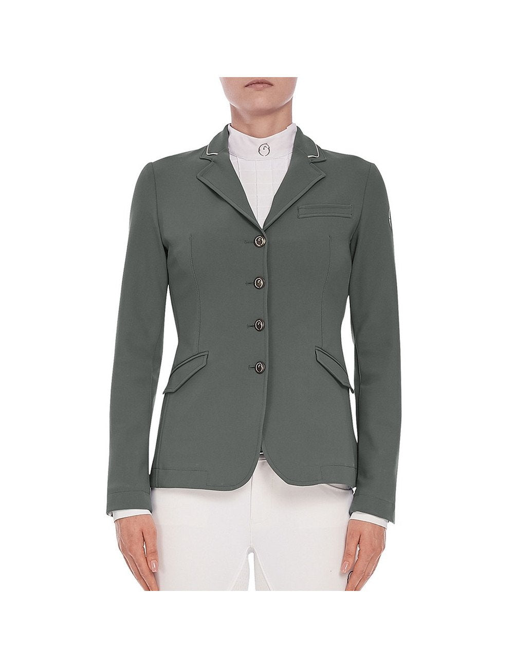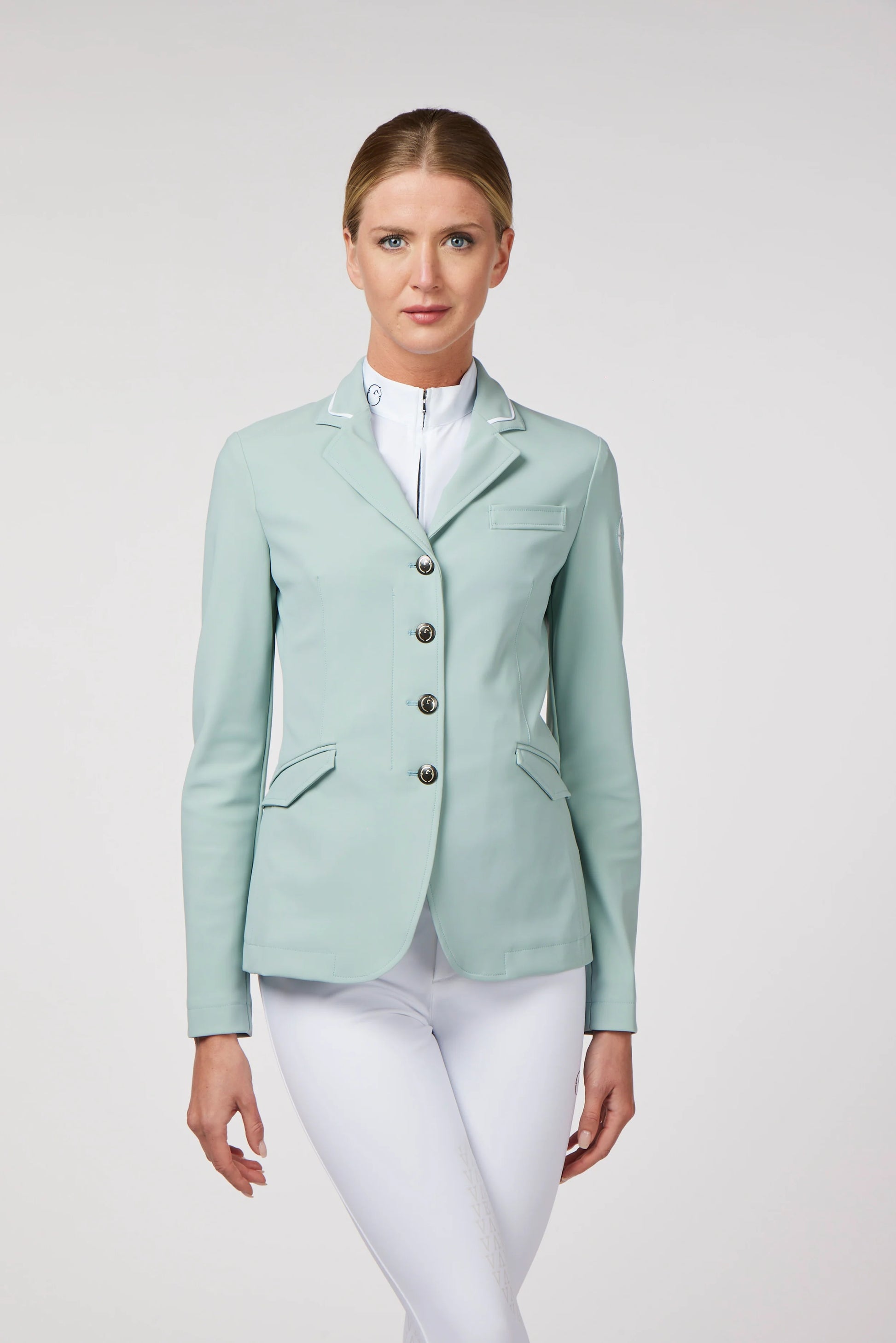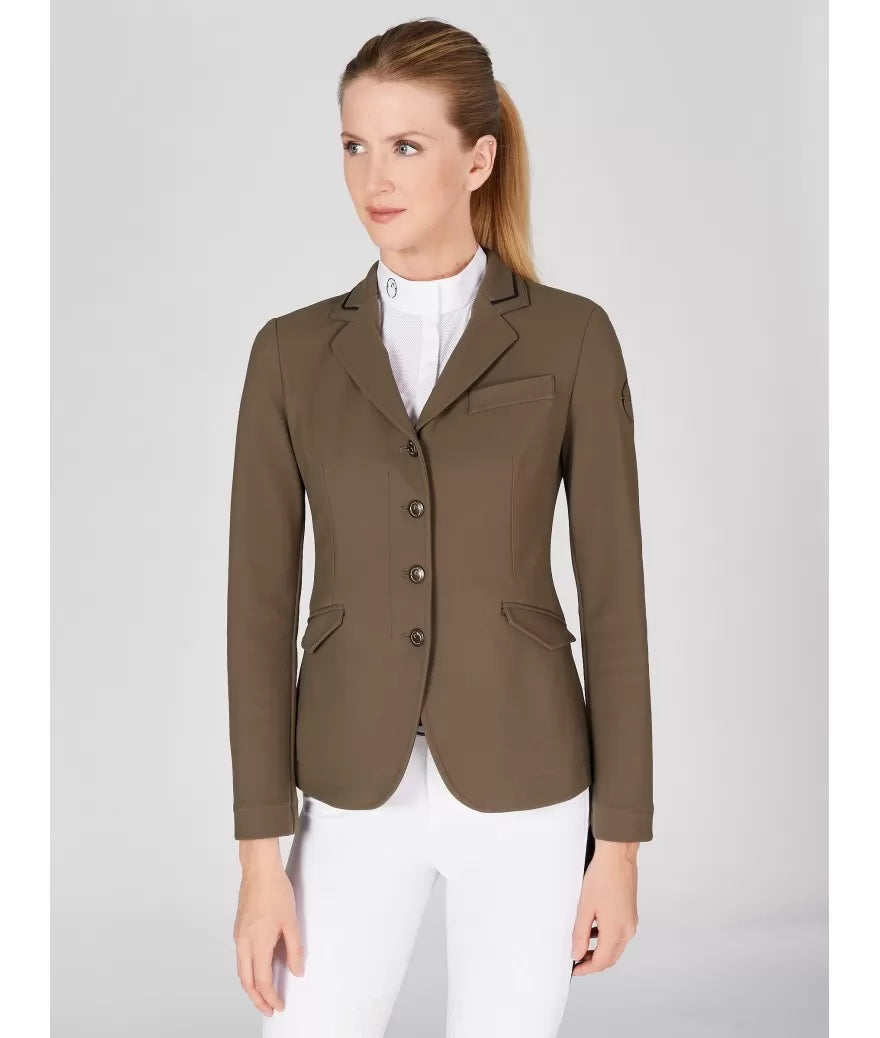 Unlined women's equestrian show coat, Canberra is our most classic luxury. Made from strong technical knit fabric, it moves with every body shape during competition. Soft and flattering, interior seam reinforcement keeps the shape without compromising movement. Canberra is finished with alcantara details on collar and back vents. Laser logo on shoulder.