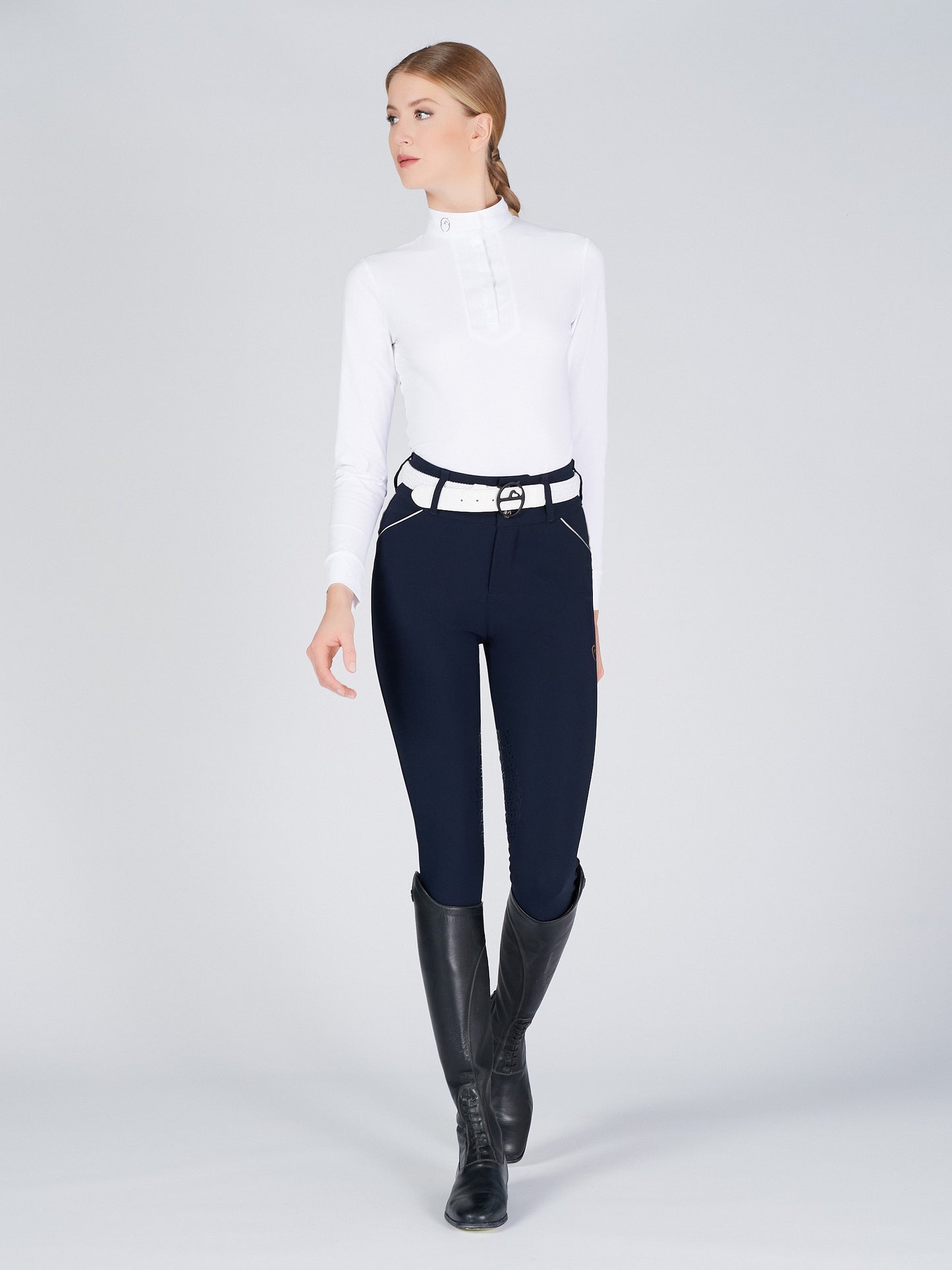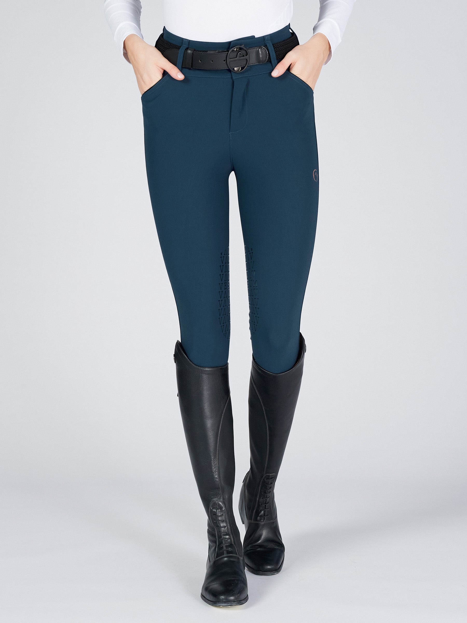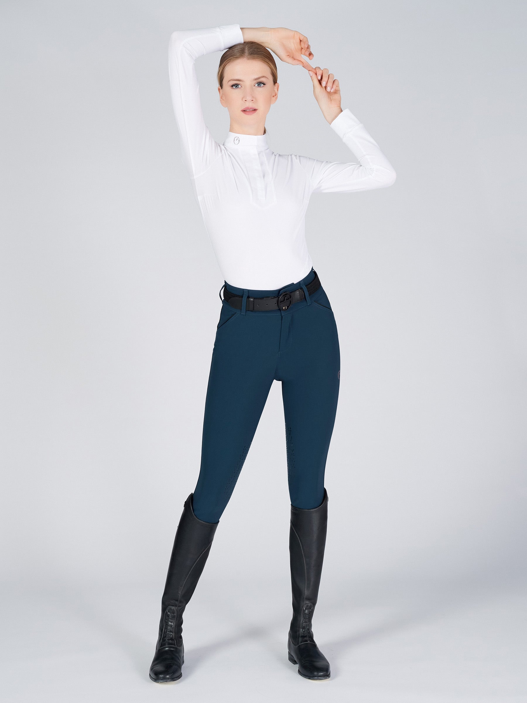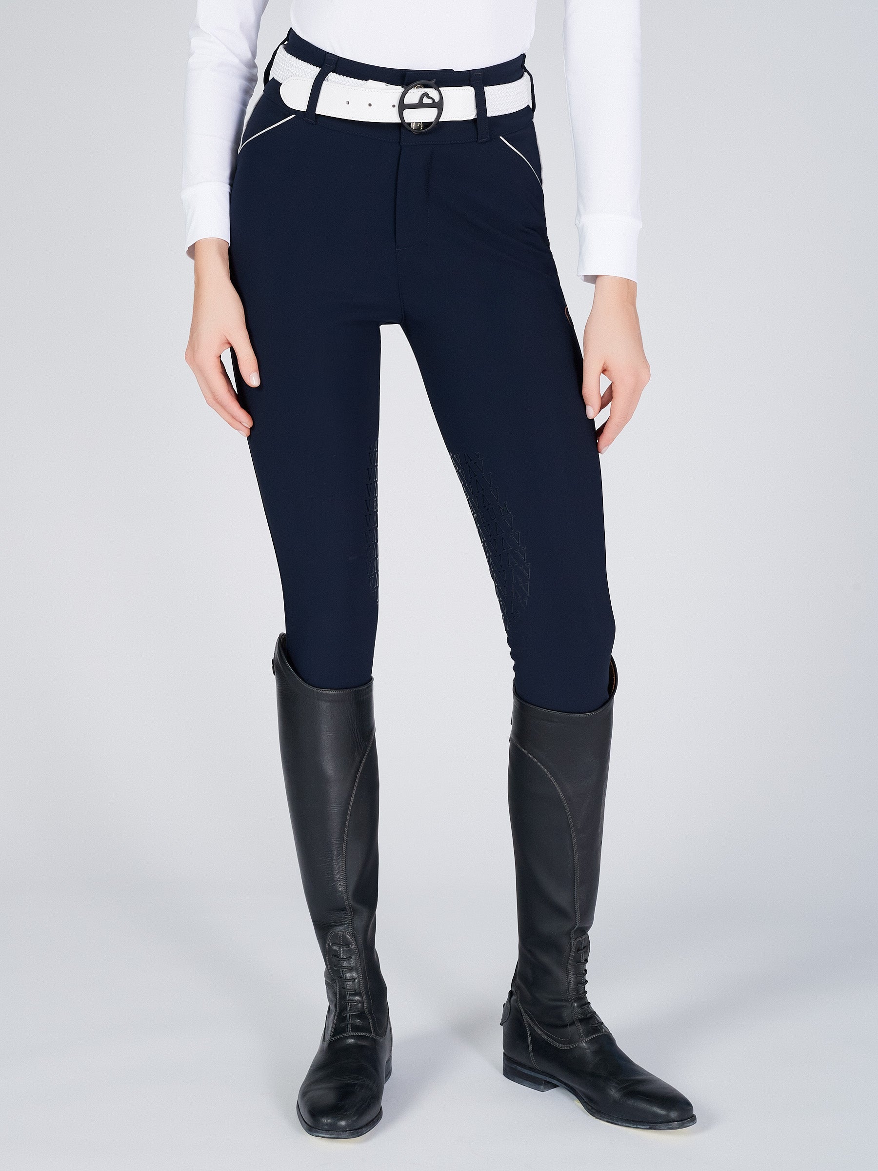 Women’s riding breeches, Garda is designed both for dressage and show-jumping. The pockets of the trousers are enriched with piping,insert of contrasting fabric and, on the back, there are two applied patters that enhance the figure and make the garment highly feminine. Logo is embossed on a leg. Easy to wear yet pretty resistant, they are comfortable for all amazons and knee grip.