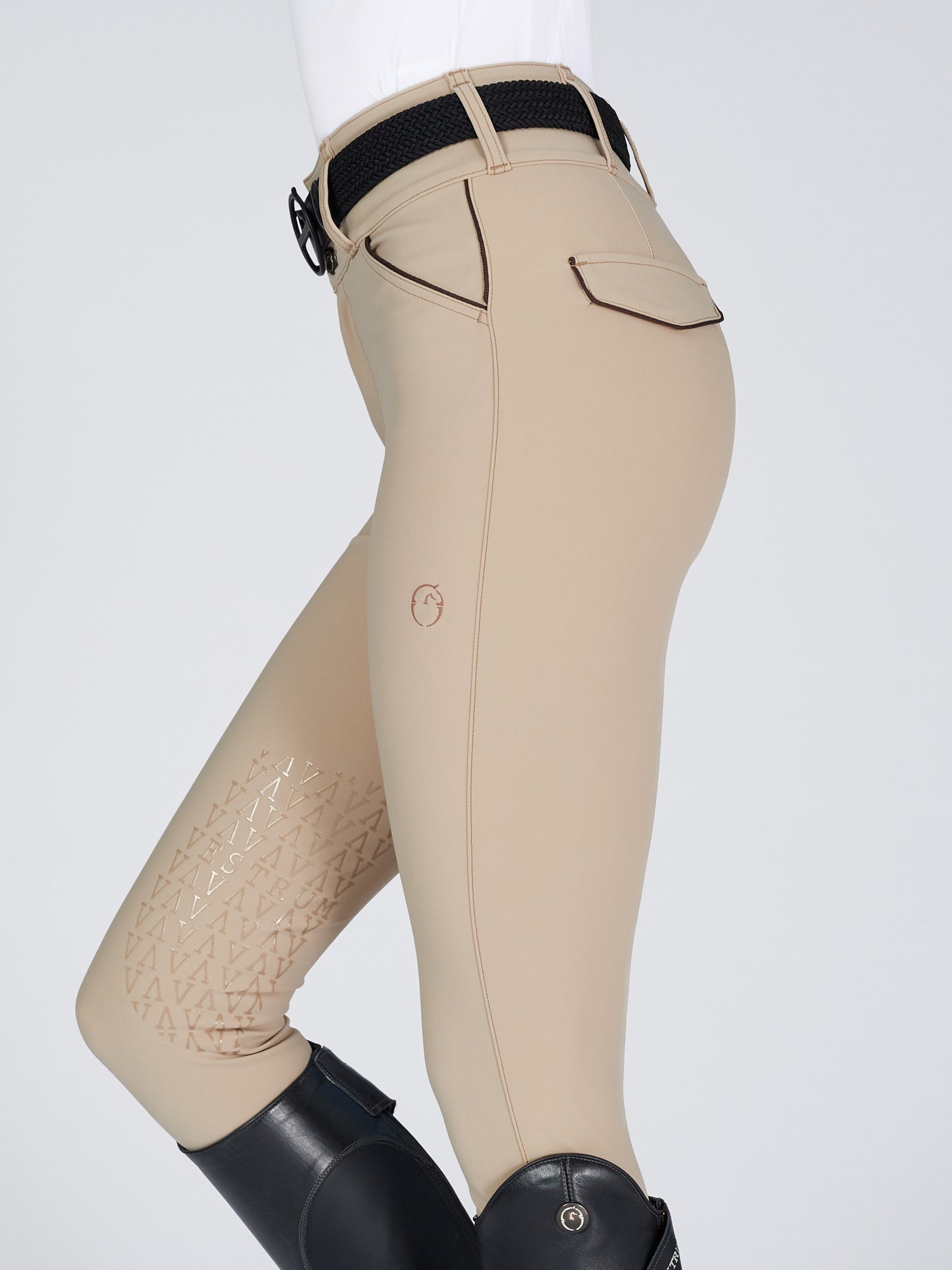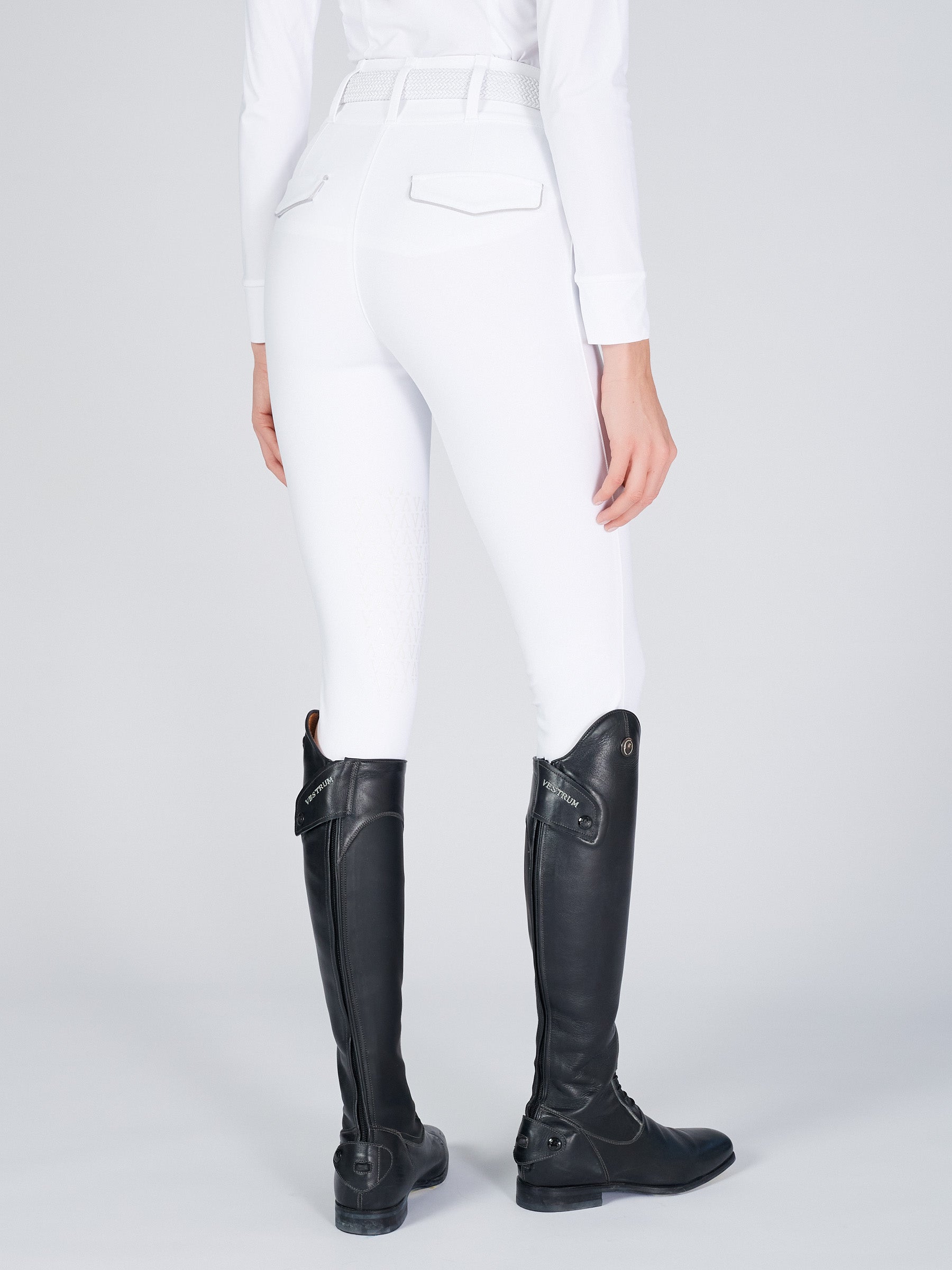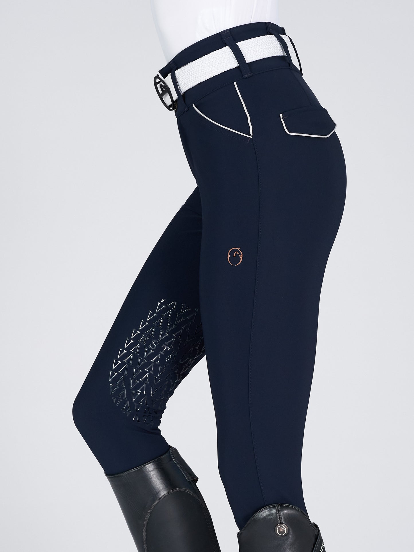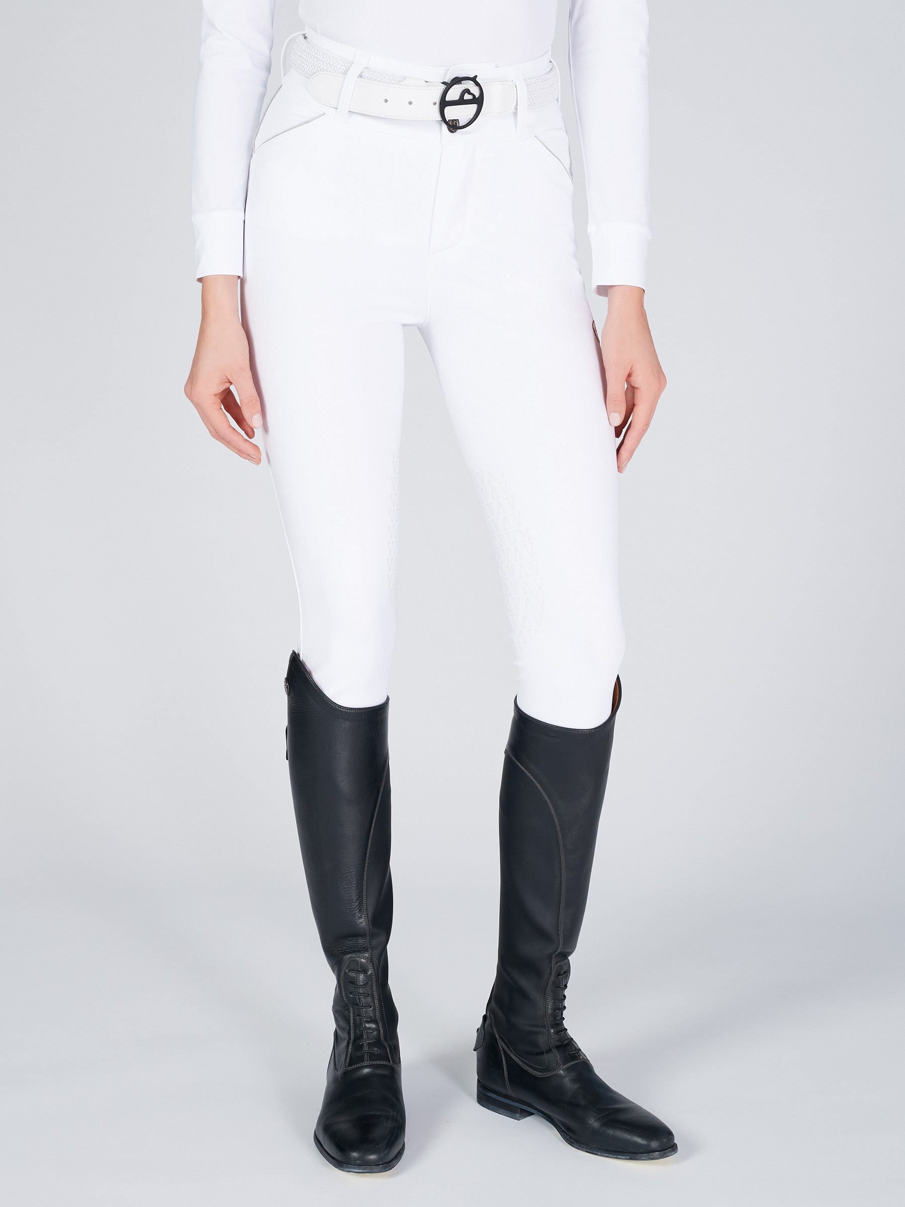 Women’s riding breeches, Garda is designed both for dressage and show-jumping. The pockets of the trousers are enriched with piping,insert of contrasting fabric and, on the back, there are two applied patters that enhance the figure and make the garment highly feminine. Logo is embossed on a leg. Easy to wear yet pretty resistant, they are comfortable for all amazons and knee grip.