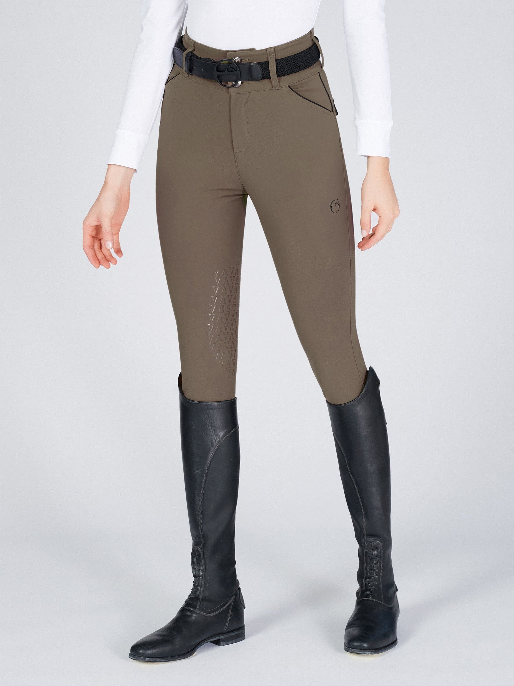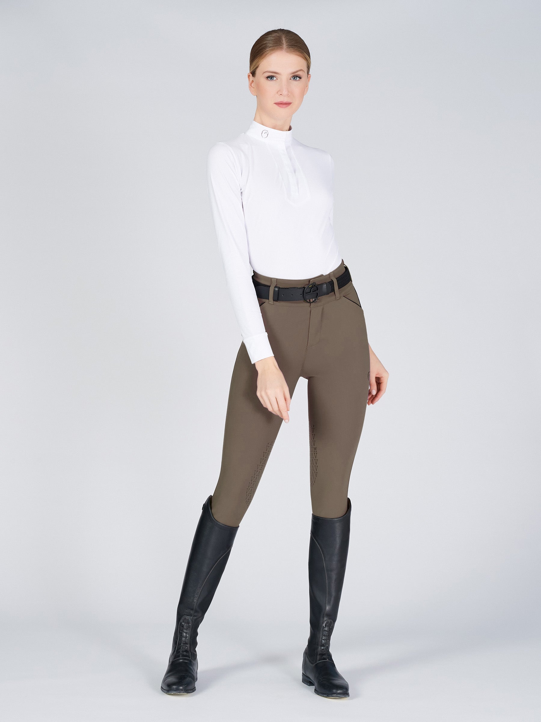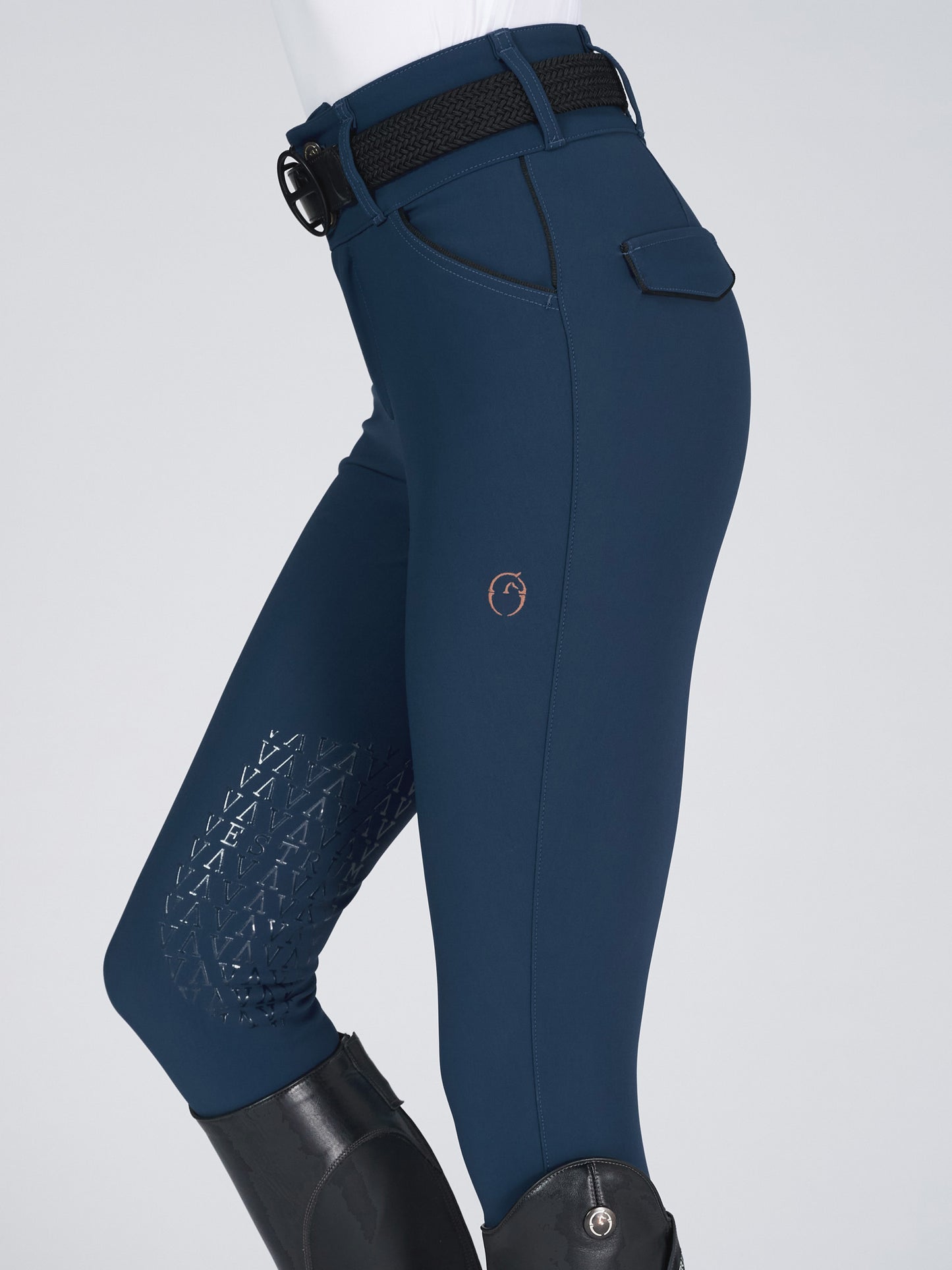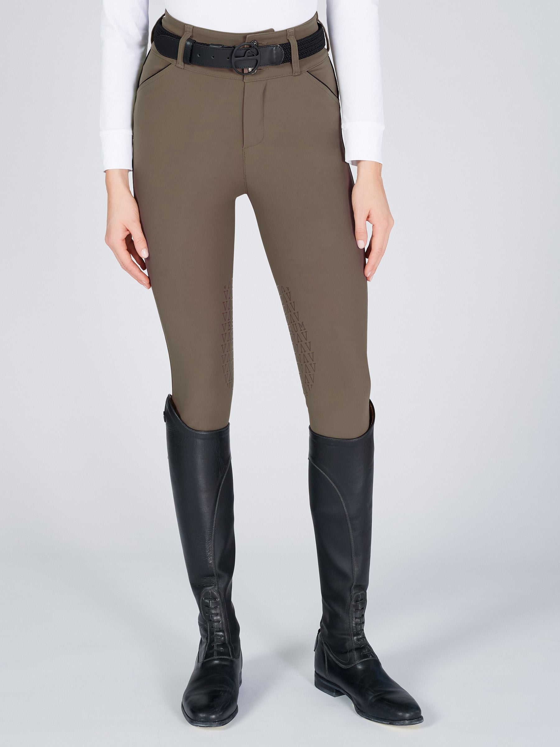 Women’s riding breeches, Garda is designed both for dressage and show-jumping. The pockets of the trousers are enriched with piping,insert of contrasting fabric and, on the back, there are two applied patters that enhance the figure and make the garment highly feminine. Logo is embossed on a leg. Easy to wear yet pretty resistant, they are comfortable for all amazons and knee grip.