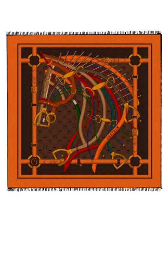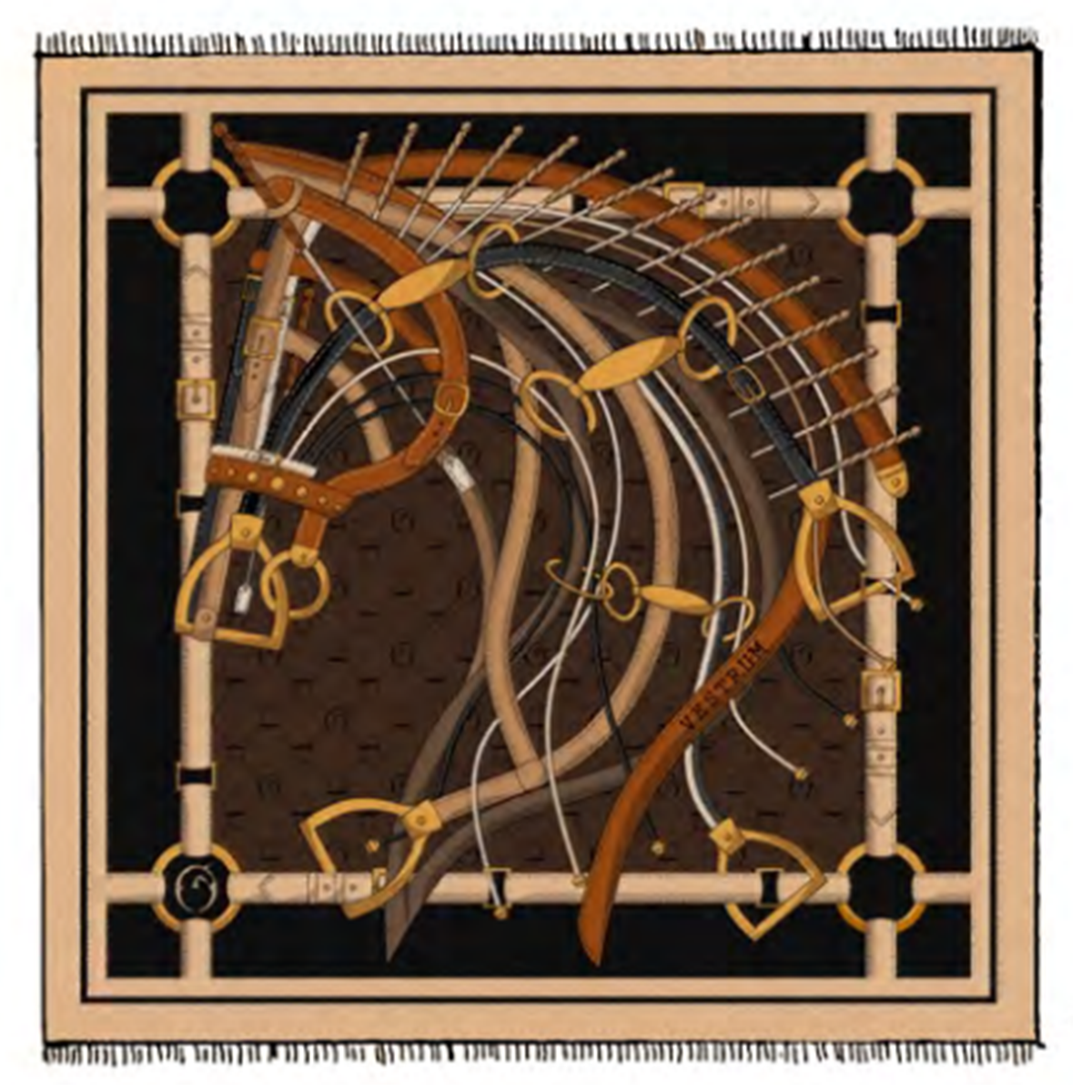 Elegant 100% superfine cashmere shawl emblazoned with original equestrian pattern.