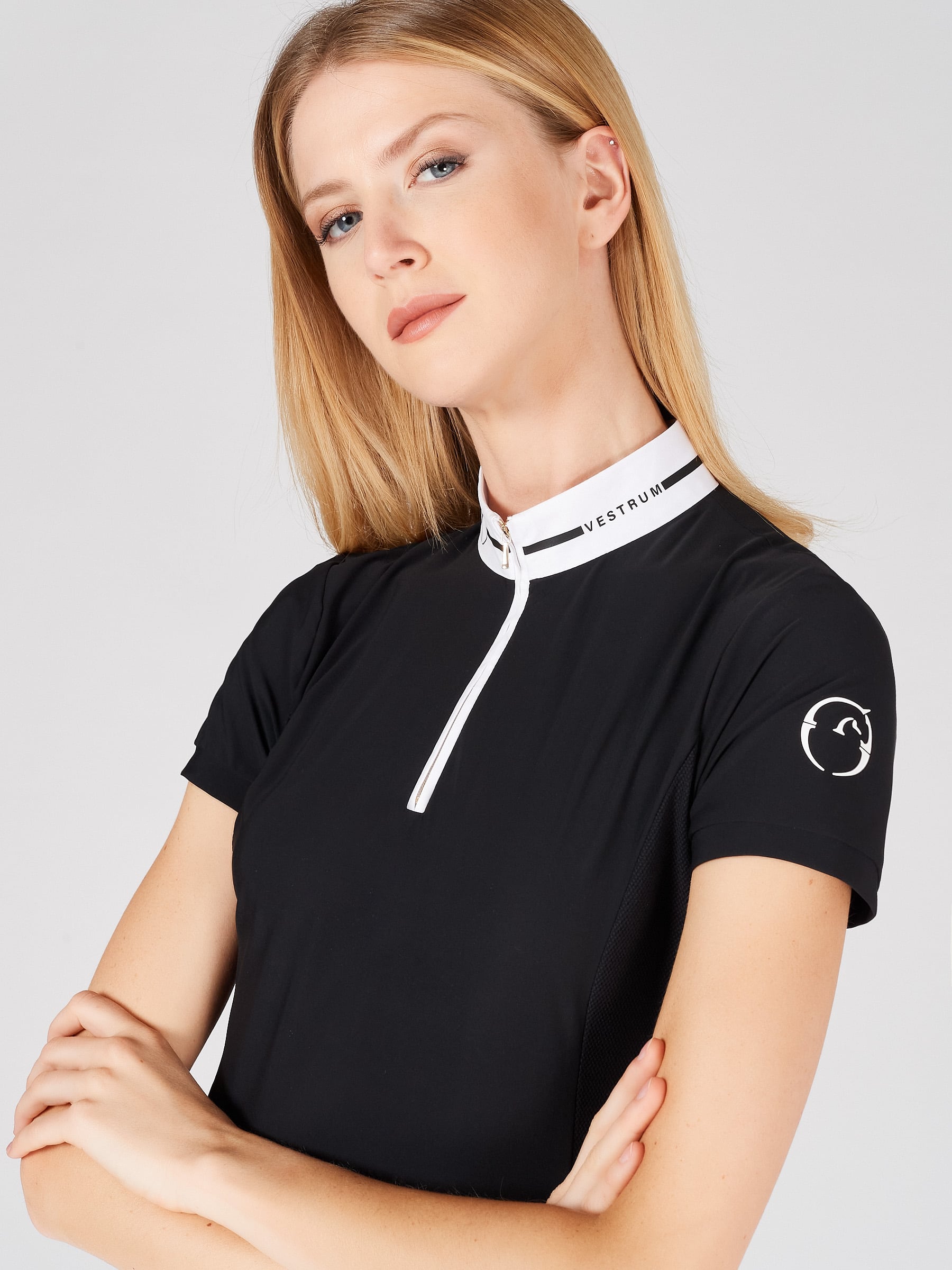 Women’s short-sleeve riding competition shirt, designed with bielastic fabric for best comfort. It features a contrasting half-zip front. The race shirt is a highly breathable garment, able to protect from the sun thanks to the “sun block” fabric. Ideal for the hottest days. Comfortable fit. Collar with contrasting printed Vestrum lettering, logo printed on the shoulder.