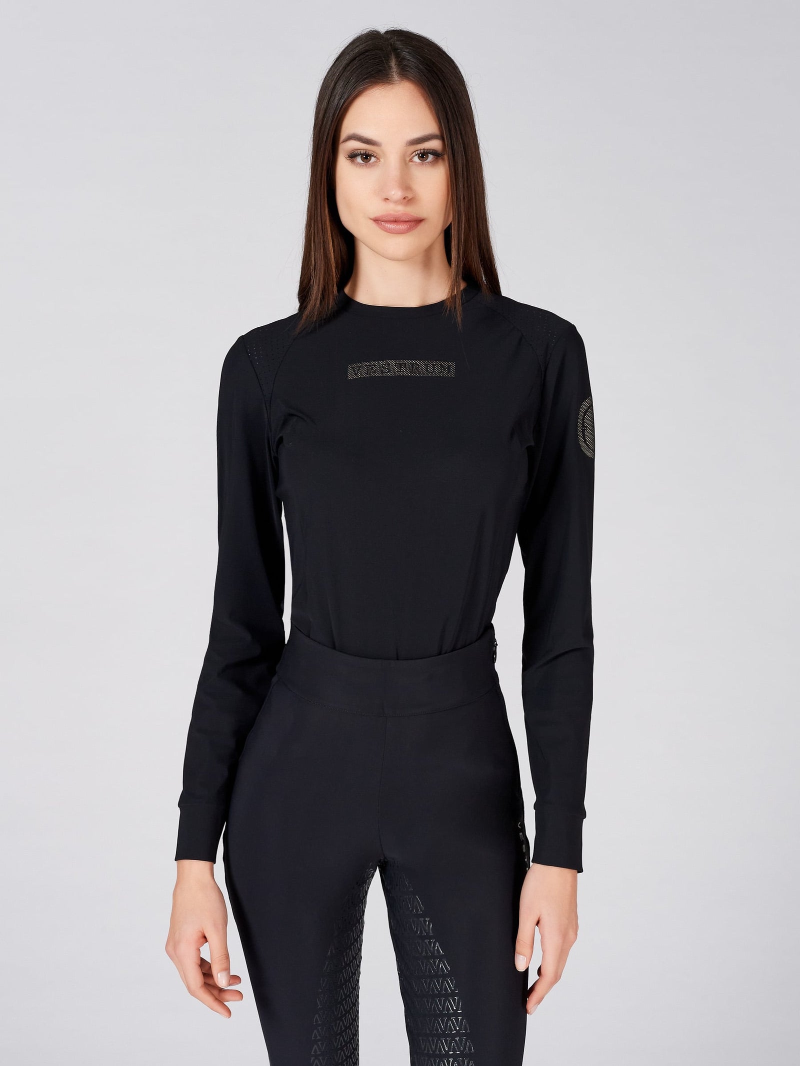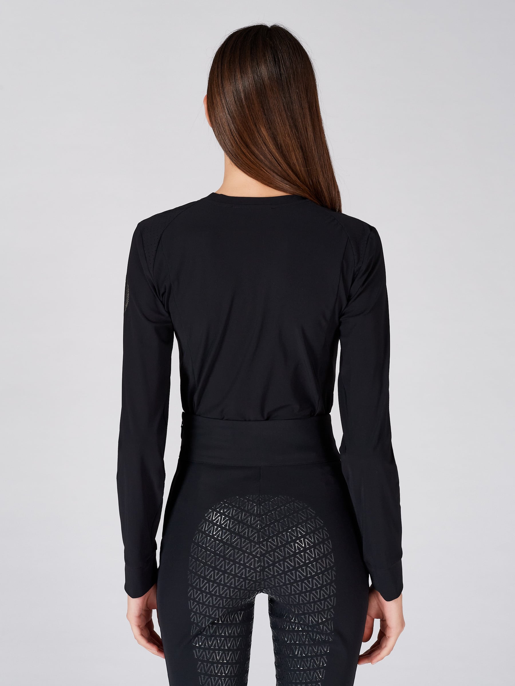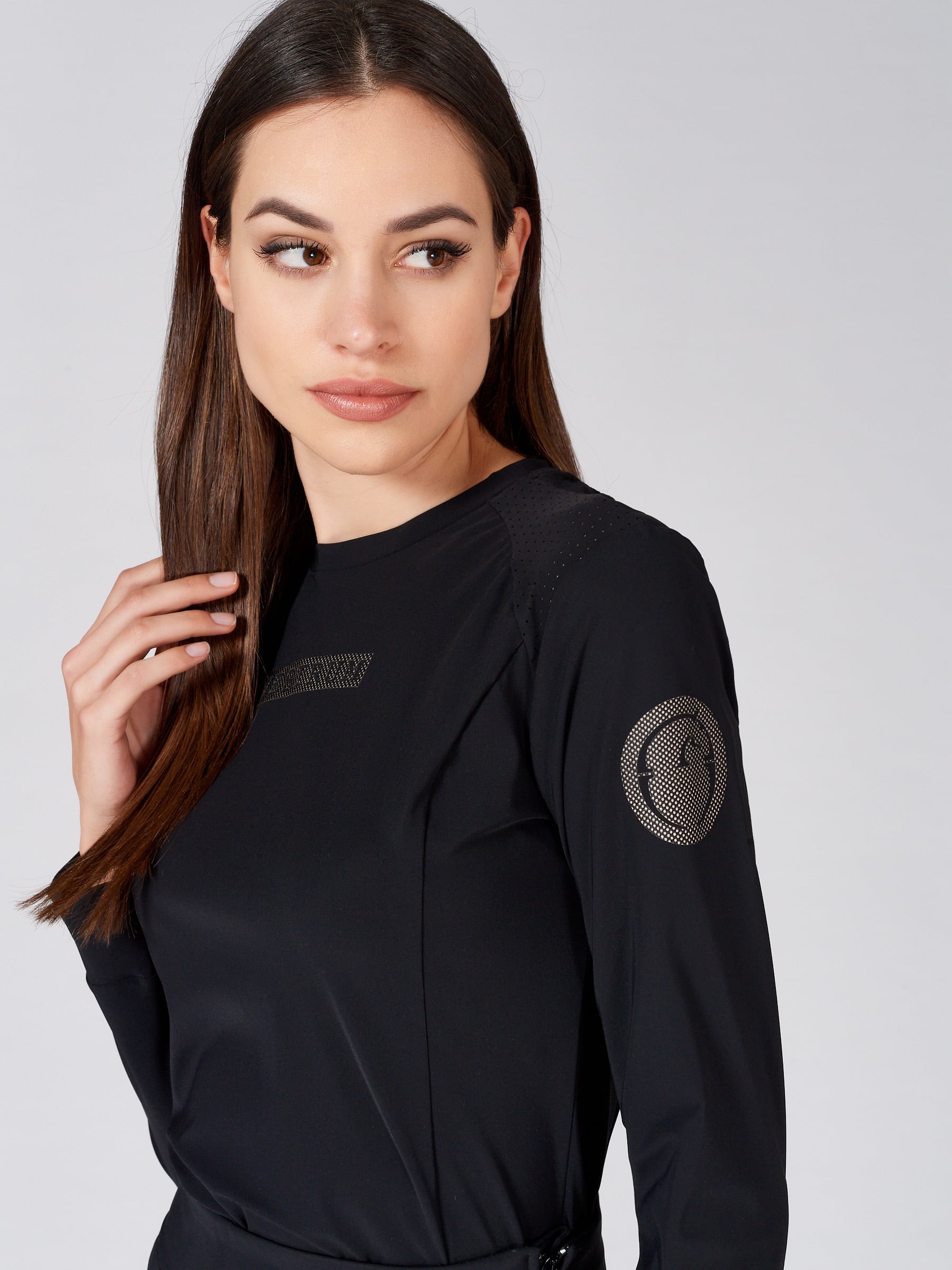 Women's long sleeve training top with traforated fabric insert on shoulder.